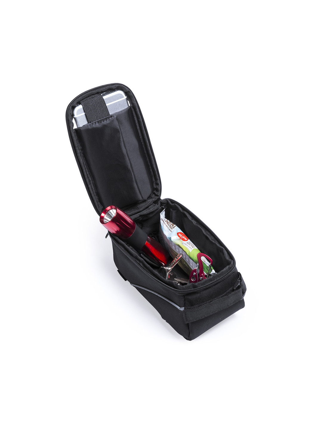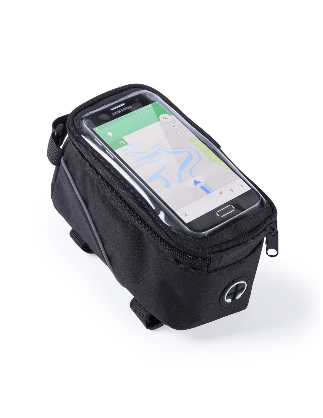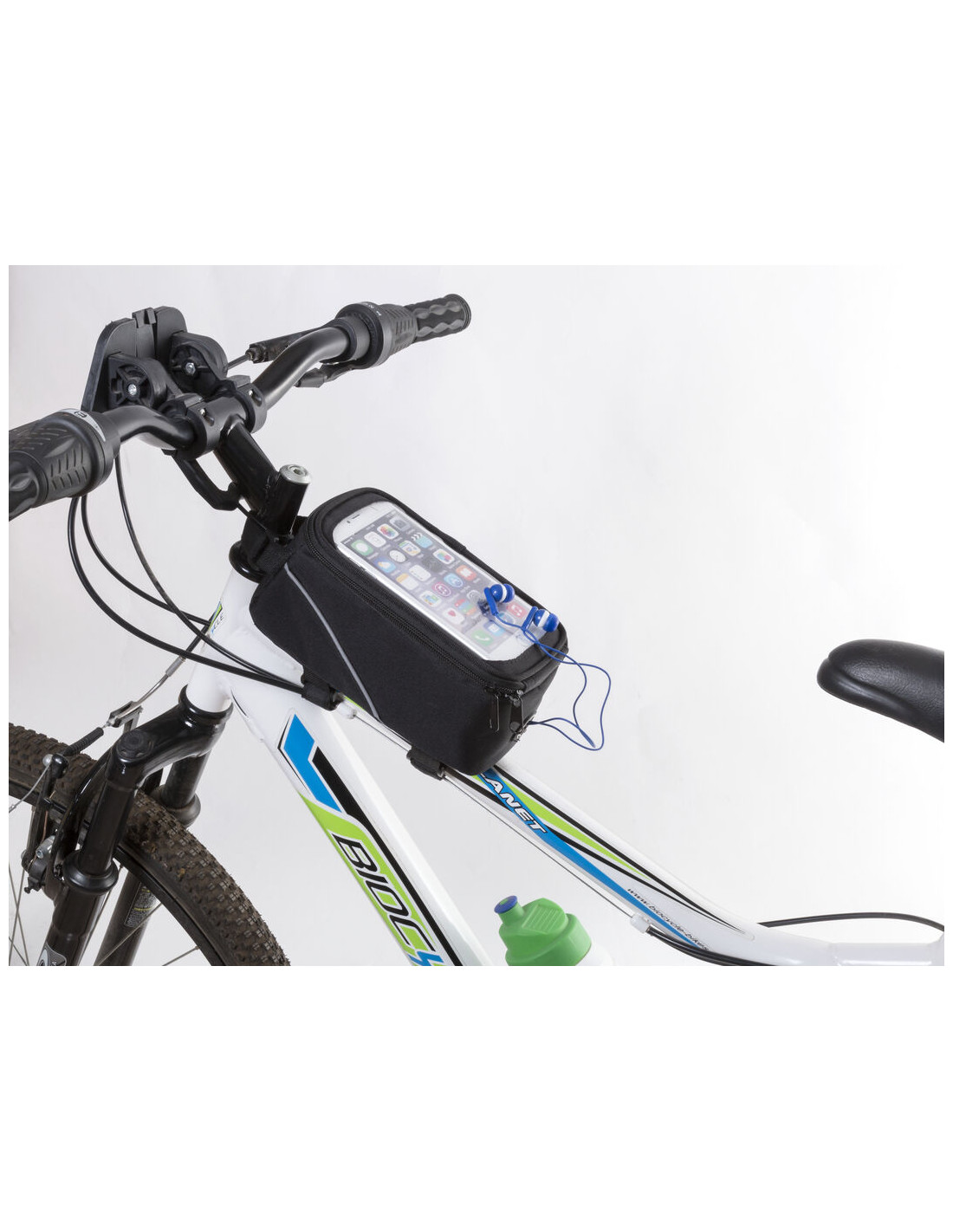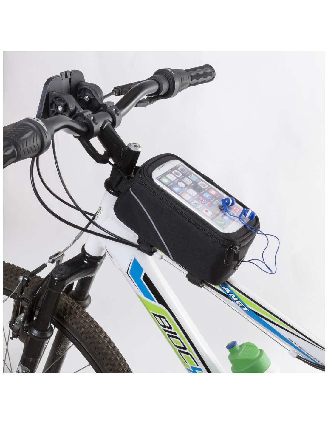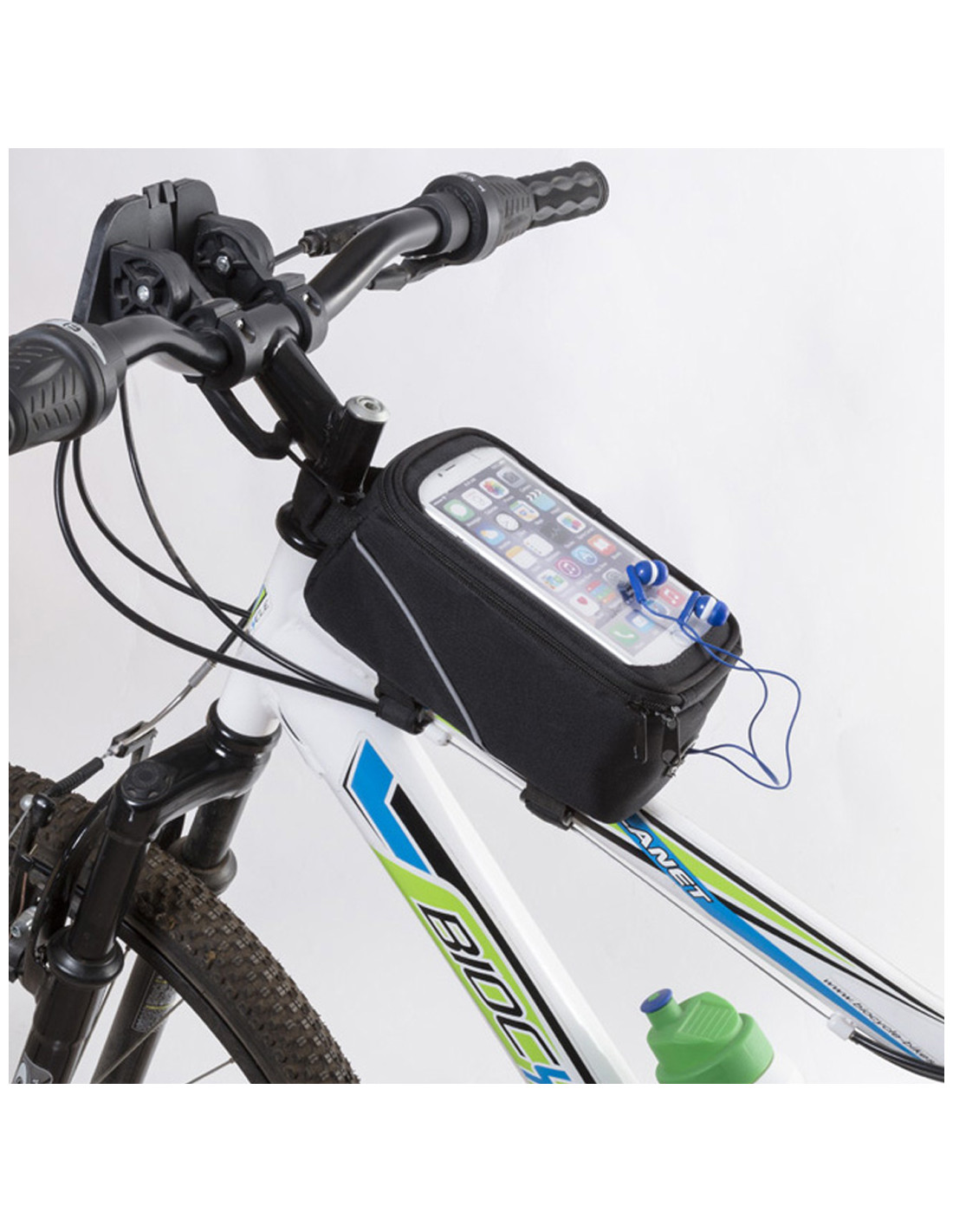 Bolsa multiusos para bicicleta en resistente poliéster 600D con acolchado y frontal de PVC con función táctil. Con salida de auriculares, cierre de cremallera e interior forrado con compartimento para smartphone. Cierre triple de velcro para acople en barra y manillar.