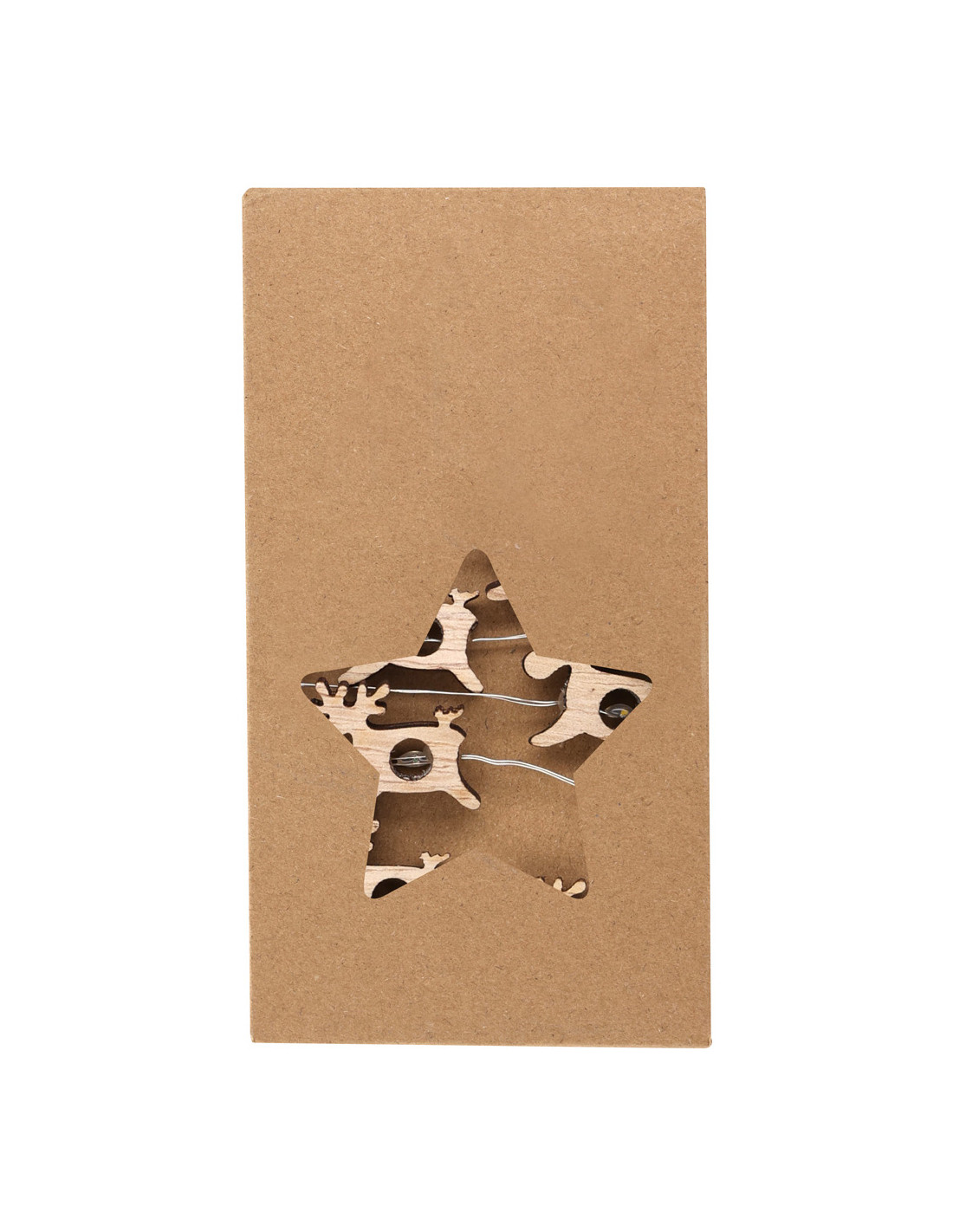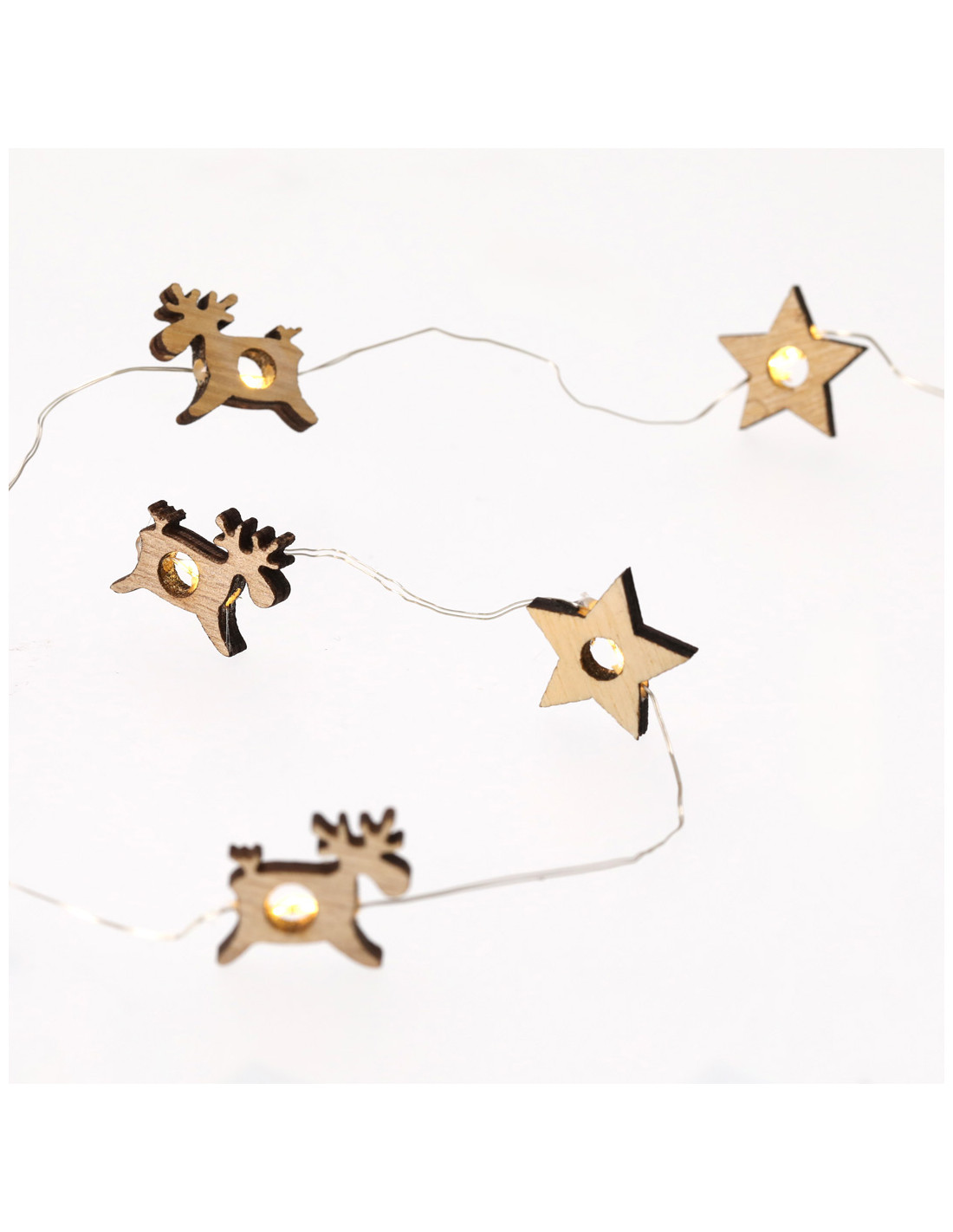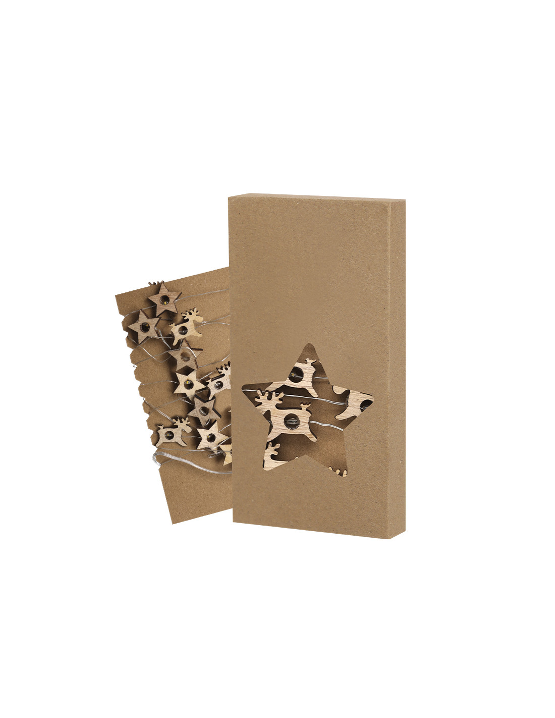 Guirnalda iluminada fabricada en madera natural. Con formas de estrella y reno intercaladas, se convierte en un original complemento decorativo que incluye adornos en materiales naturales. Con cálida iluminación con 20 LEDs. Alimentación a pilas (2xAA no incluidas). Presentación en atractiva caja kraft con troquelado en forma de estrella.Elaborado con elementos vegetales para así fomentar la utilización de materias primas naturales y reducir las emisiones contaminantes.
