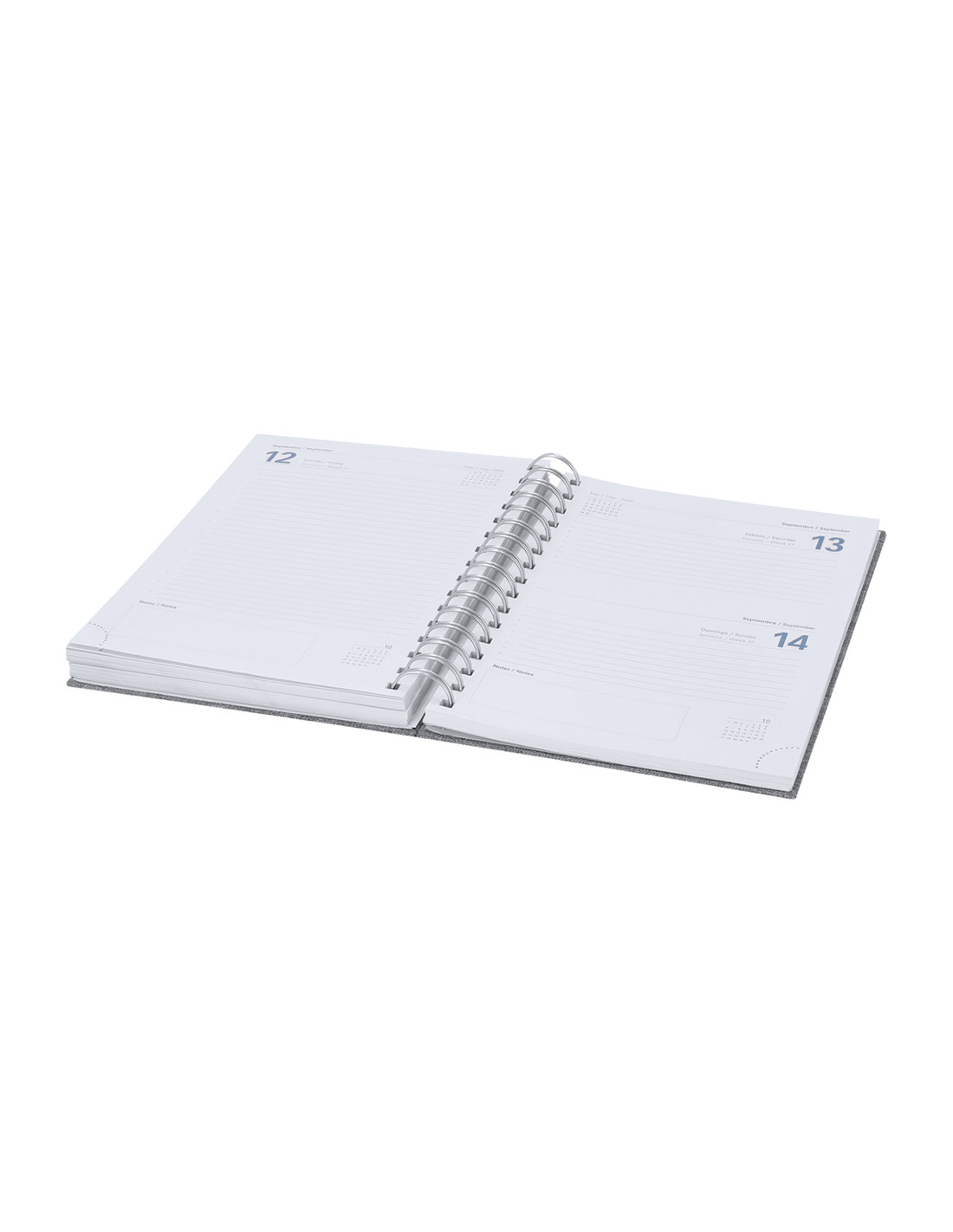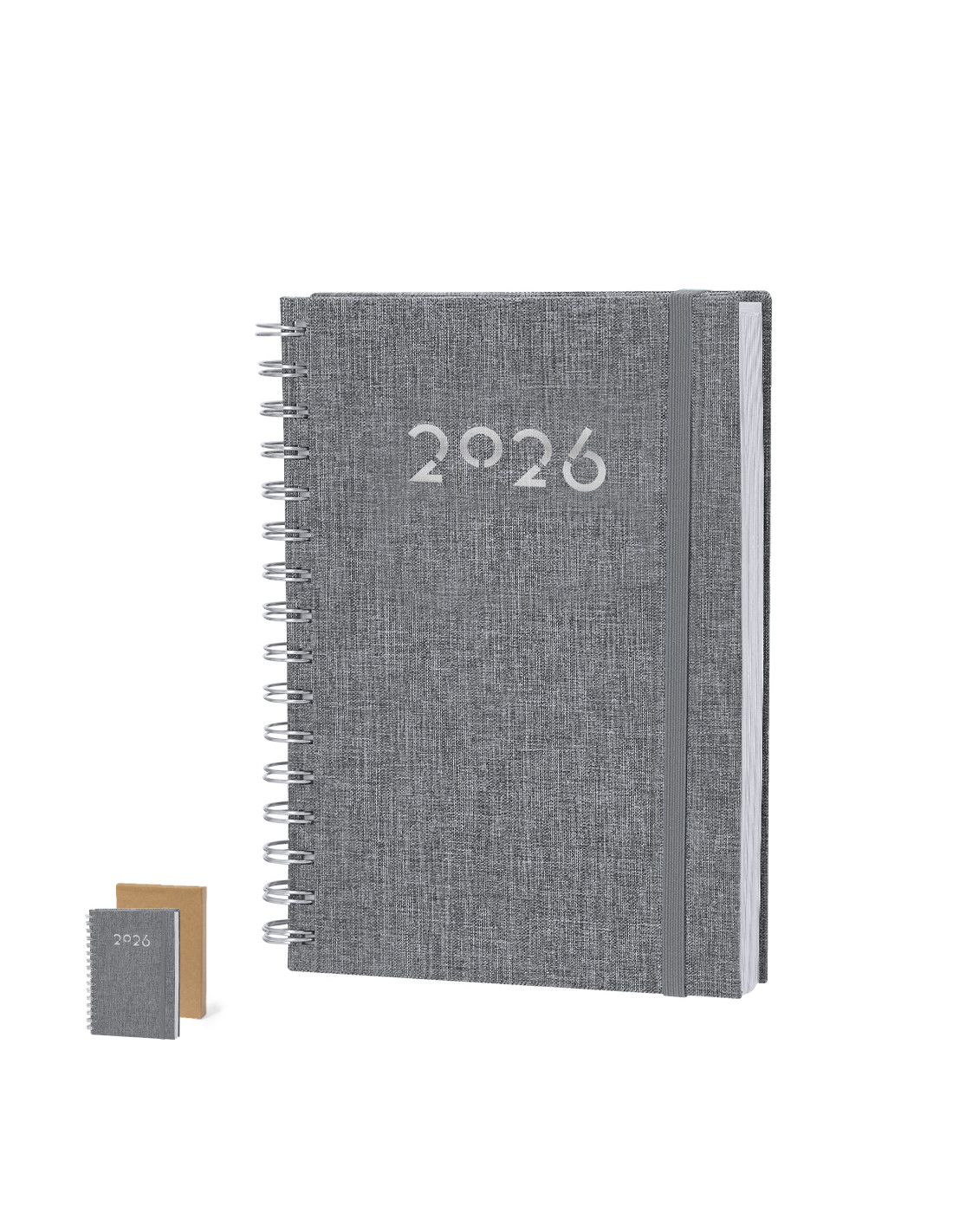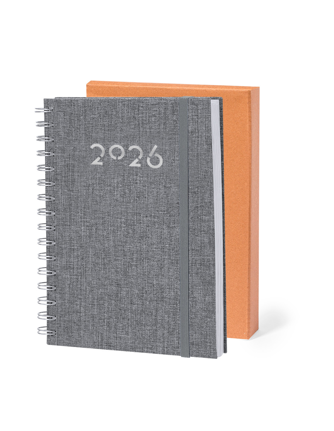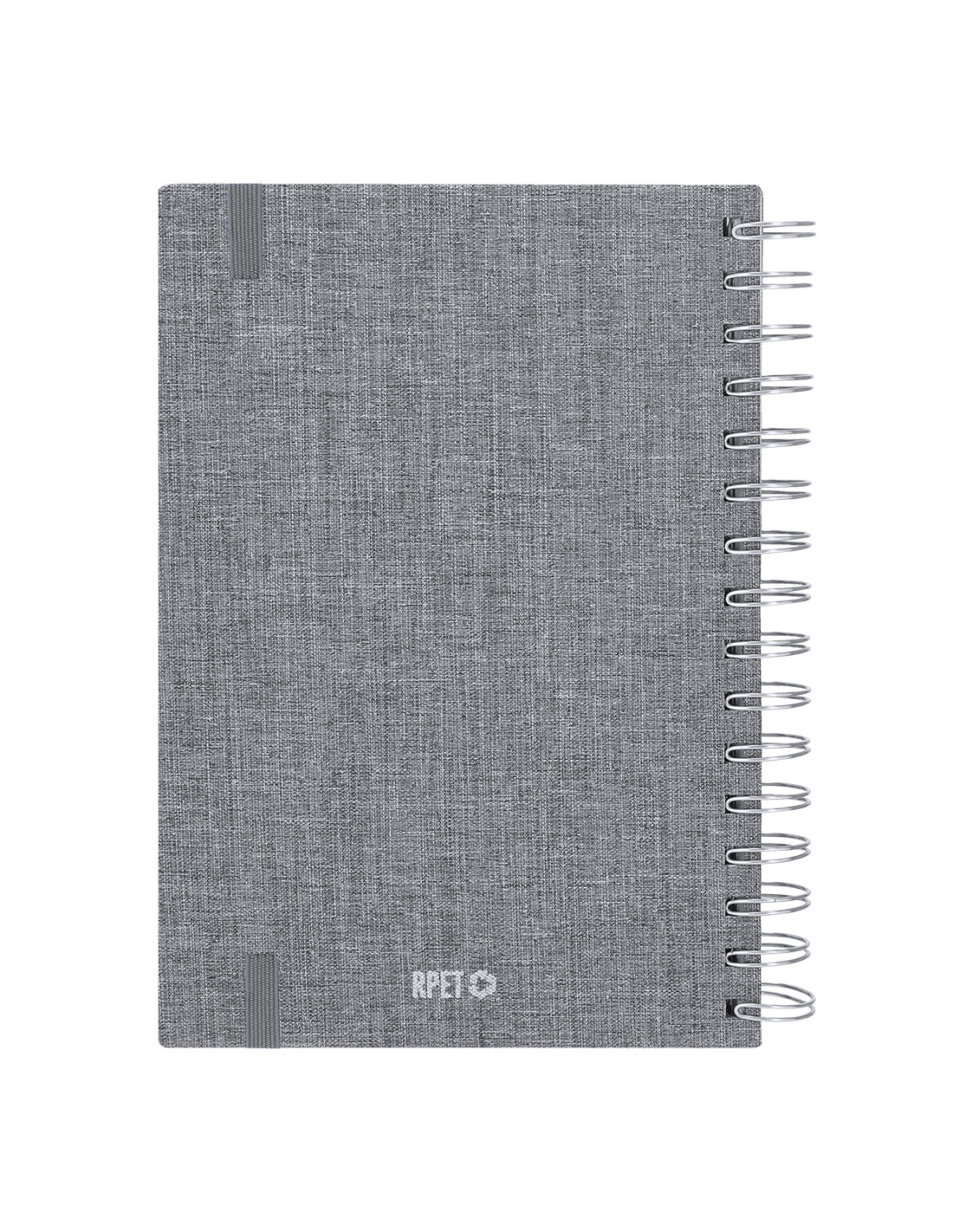 Agenda de anillas tamaño A5 fabricada en suave poliéster RPET. Con tapas rígidas y cierre de goma elástica a juego. Incluye caja kraft de presentación. Cuenta con distintivo RPET.Diseño página día, zona de anotaciones y marcapáginas de tela. En 2 idiomas: castellano e inglés. El material RPET se elabora a partir de plástico reciclado, para así fomentar la reutilización de residuos plásticos y ayudar a la sostenibilidad del planeta.