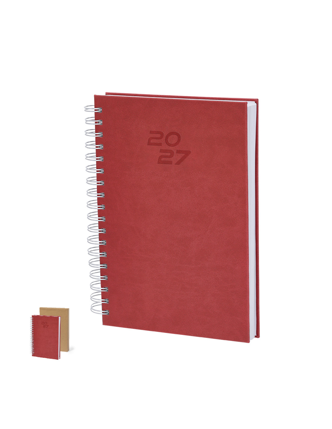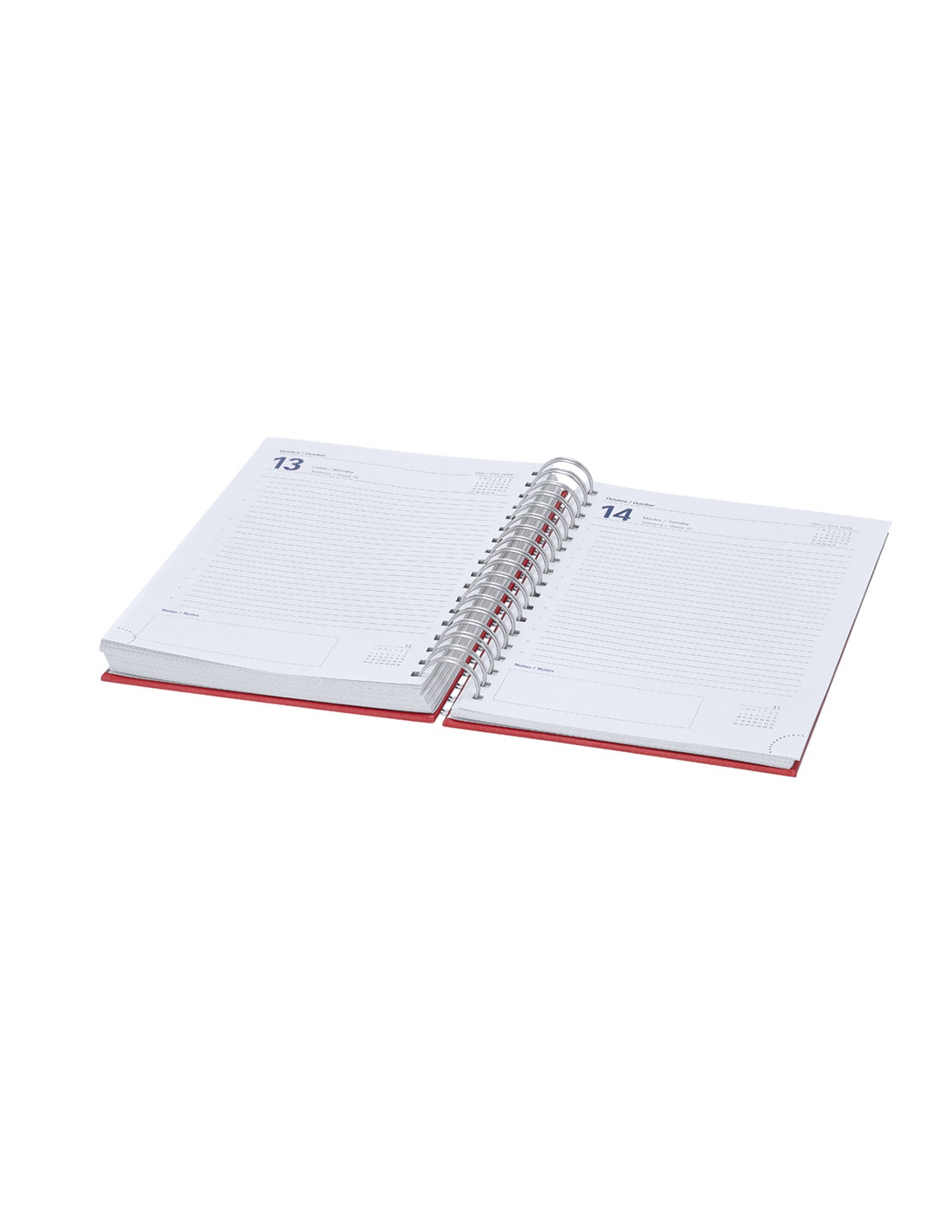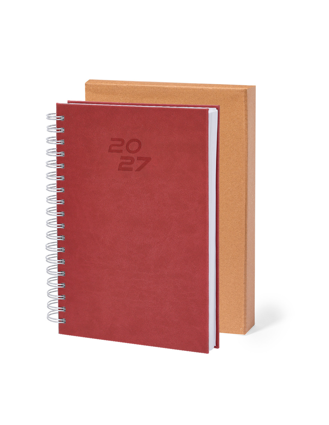 Agenda de anillas tamaño B5, acabada en resistente y suave PU. Con cubiertas rígidas. Incluye caja kraft de presentación.Diseño página día y páginas con esquina troquelada para marcar el día. En 2 idiomas: castellano e inglés.