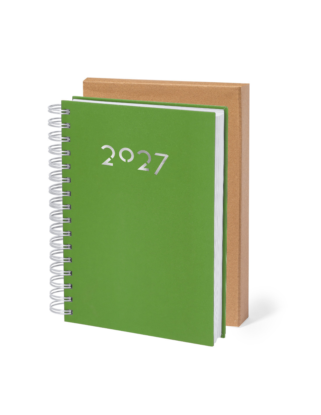 Agenda de anillas tamaño A5, acabada en resistente y suave PU. Con cubiertas rígidas. Incluye caja kraft de presentación.Diseño página día y páginas con esquina troquelada para marcar el día. En 2 idiomas: castellano e inglés.