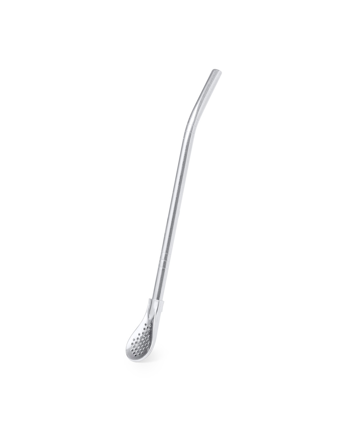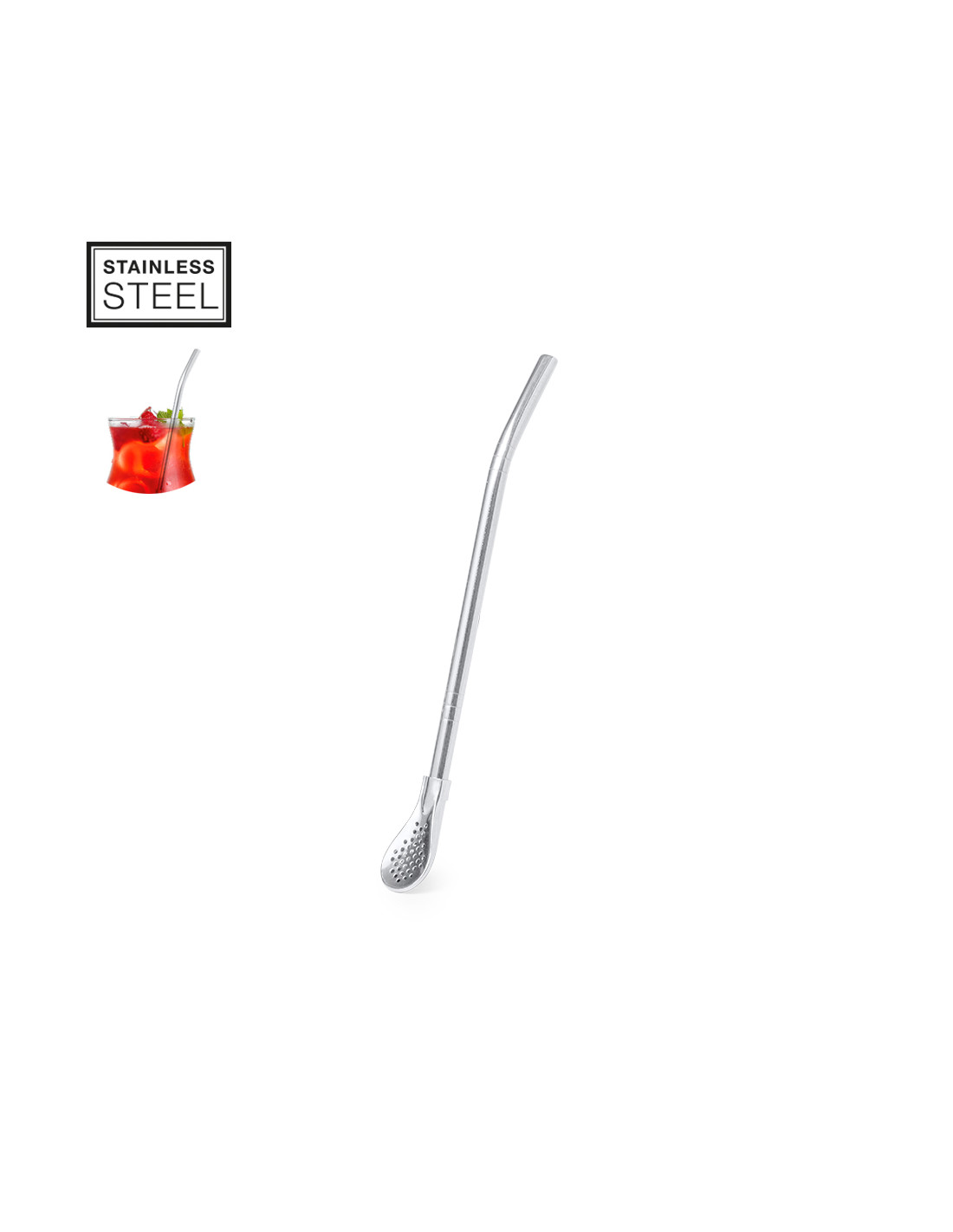 Práctico agitador con pajita en acero inox. Con diseño elegante y funcional, este accesorio es esencial para bebidas frías o calientes. Pajita integrada que permite absorber con facilidad y en el extremo inferior una práctica cucharilla con filtro. Presentado en una bolsa individual.