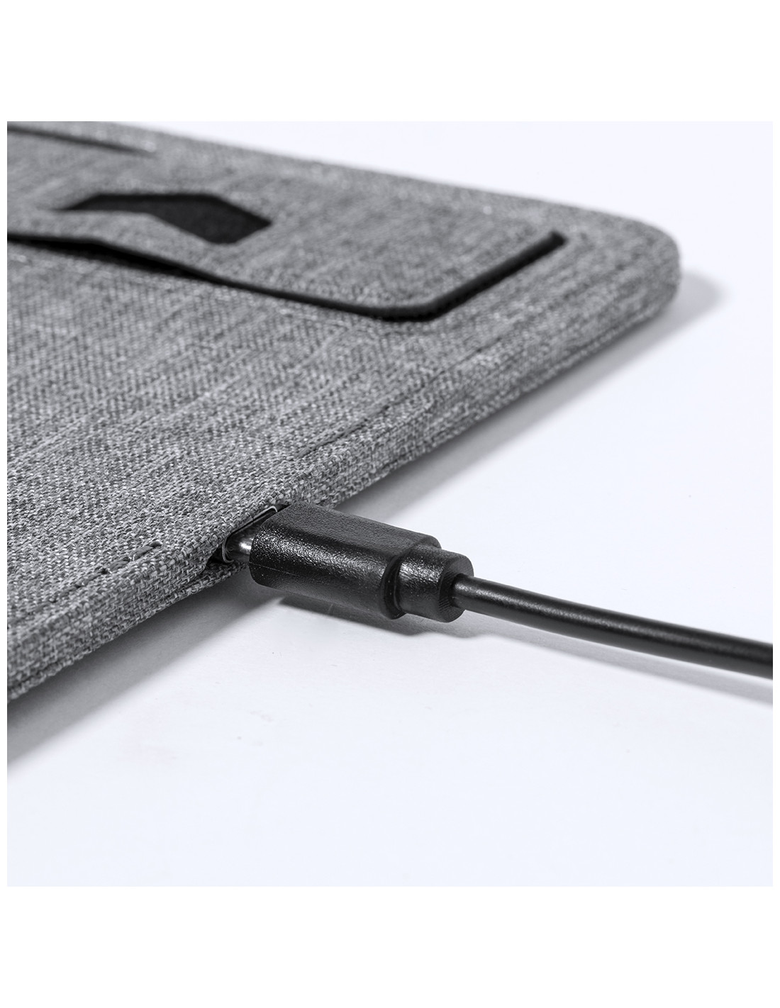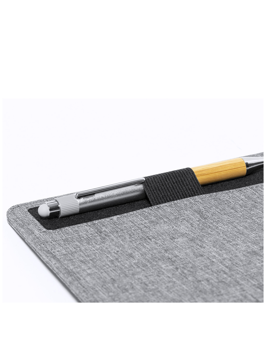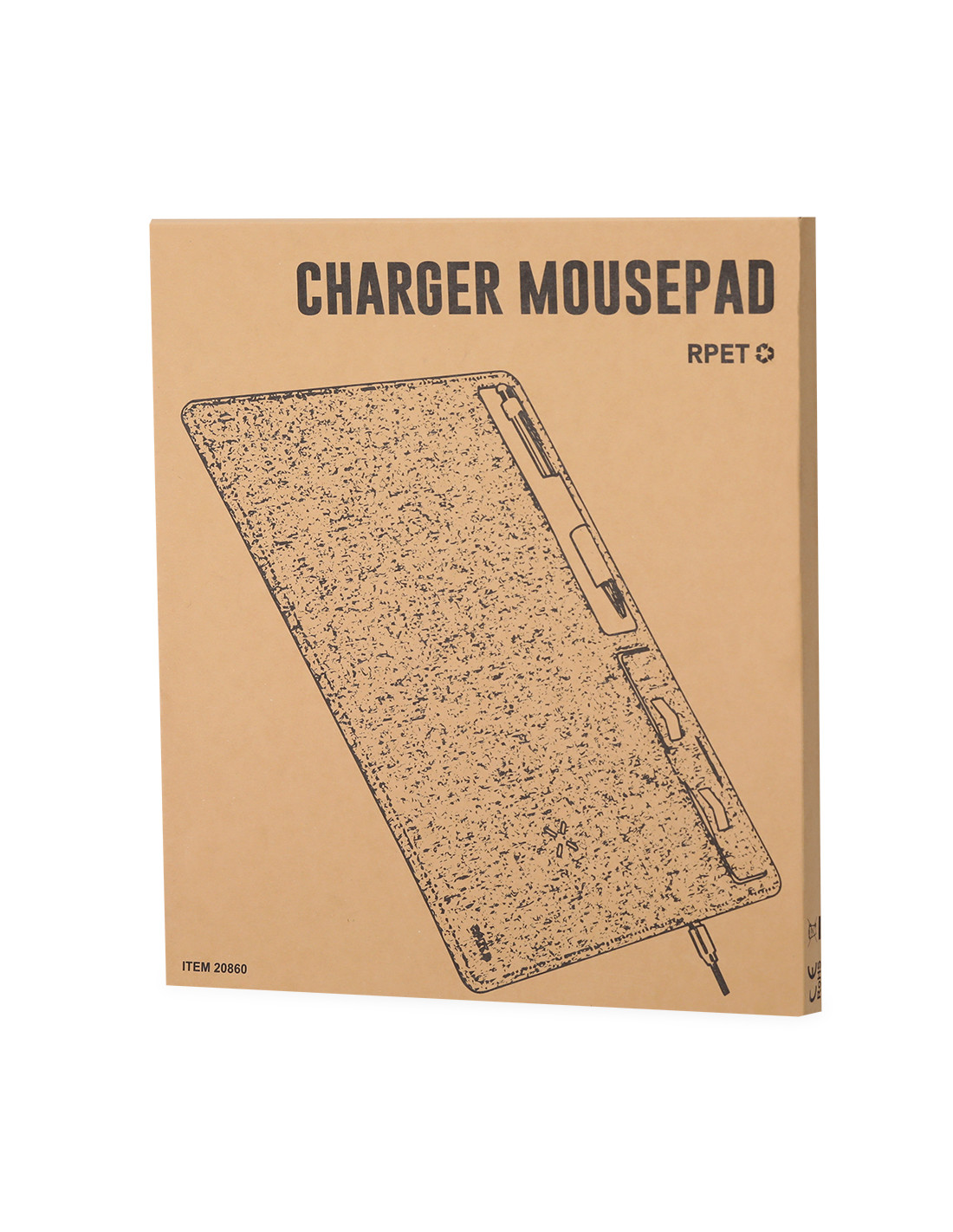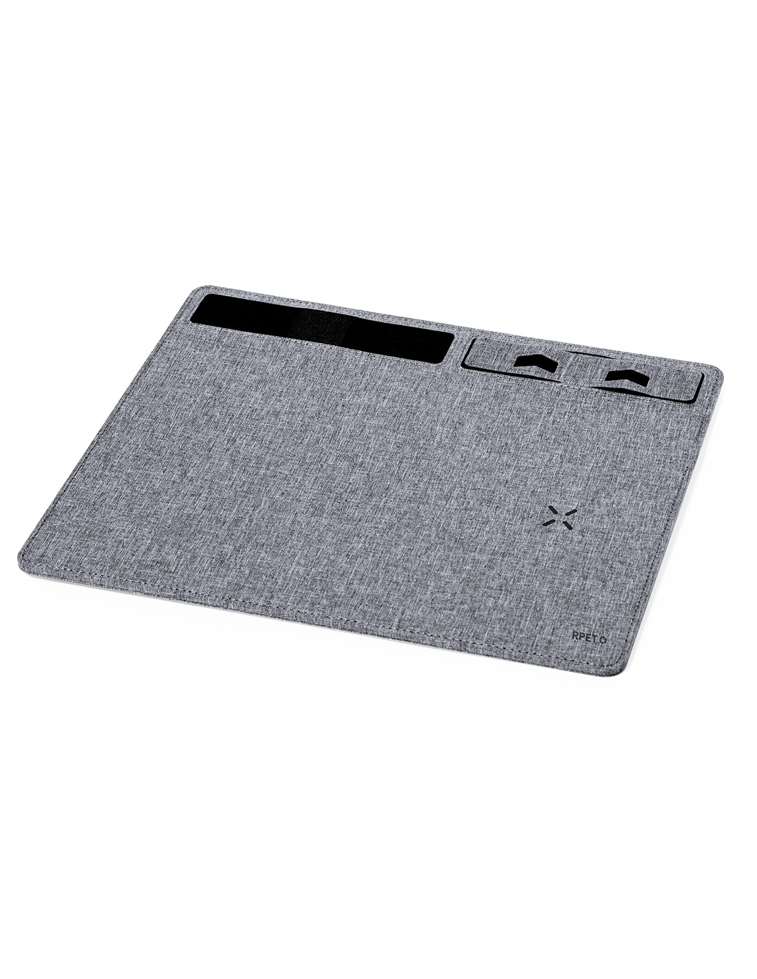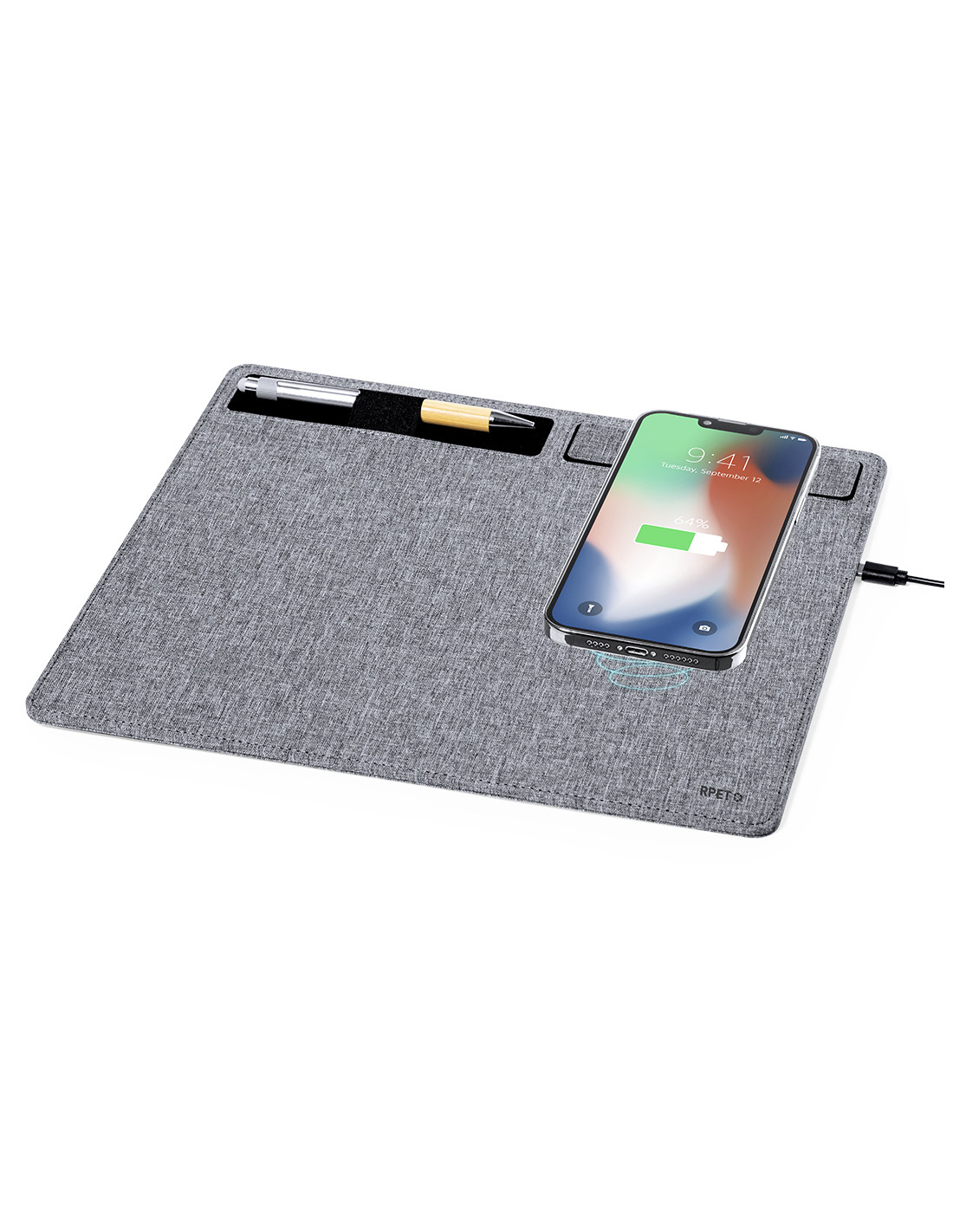 Elegante y funcional afombrilla fabricada en suave poliéster RPET. Con entrada Tipo C -cable negro Tipo C incluido- y cargador inalámbrico de 15W, compatible con dispositivos equipados con tecnología de carga inalámbrica Qi. Incluye soporte para smartphone y soporte para bolígrafos. Con base antideslizante que garantiza estabilidad y comodidad de uso. Incluye manual de instrucciones en español e inglés. Presentada en caja individual de diseño kraft y en bolsa reciclada.El material RPET se elabora a partir de plástico reciclado, para así fomentar la reutilización de residuos plásticos y ayudar a la sostenibilidad del planeta.Fabricado conforme a los estándares RoHS y en cumplimiento con los siguientes requisitos de seguridad:Sistema de protección contra sobrecalentamiento.Sistema de protección contra sobrecarga.Sistema de bloqueo para evitar cortocircuitos.