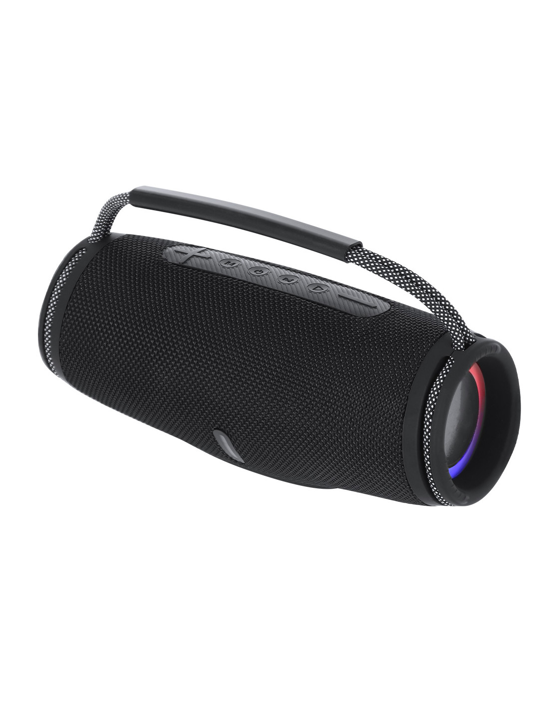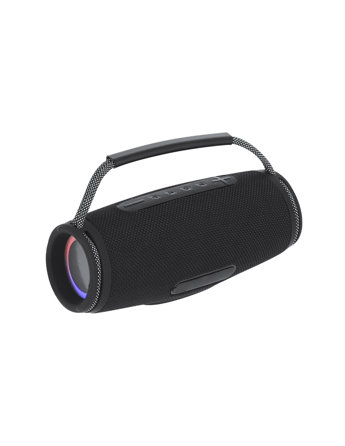 Altavoz estéreo Bluetooth 2x5W con luz multicolor. Fabricado en resistente tejido premium y asa de transporte en tejido trenzado bitono con agarre de suave silicona. Incluye zona lateral especial para marcaje. Con luces LEDs multicolor con 7 posiciones de iluminación. Conexión Bluetooth 5.3 con panel de control integrado parte superior. Cuenta con función manos libres, conexión USB, conexión Tipo C, lector de Micro SD.