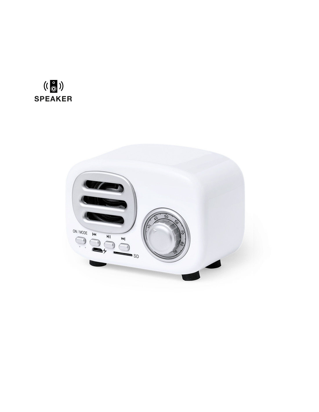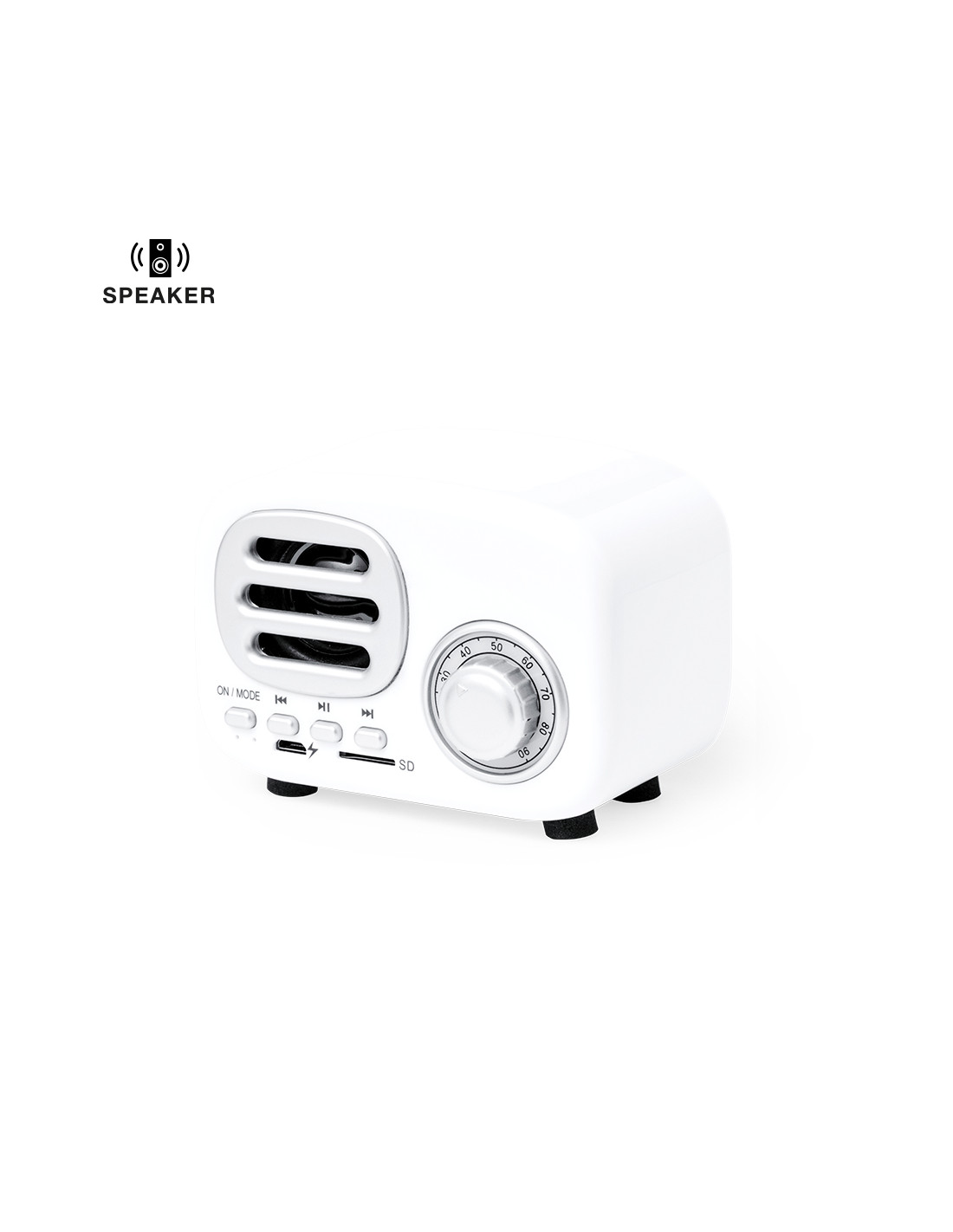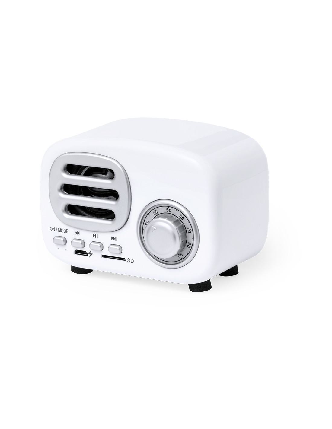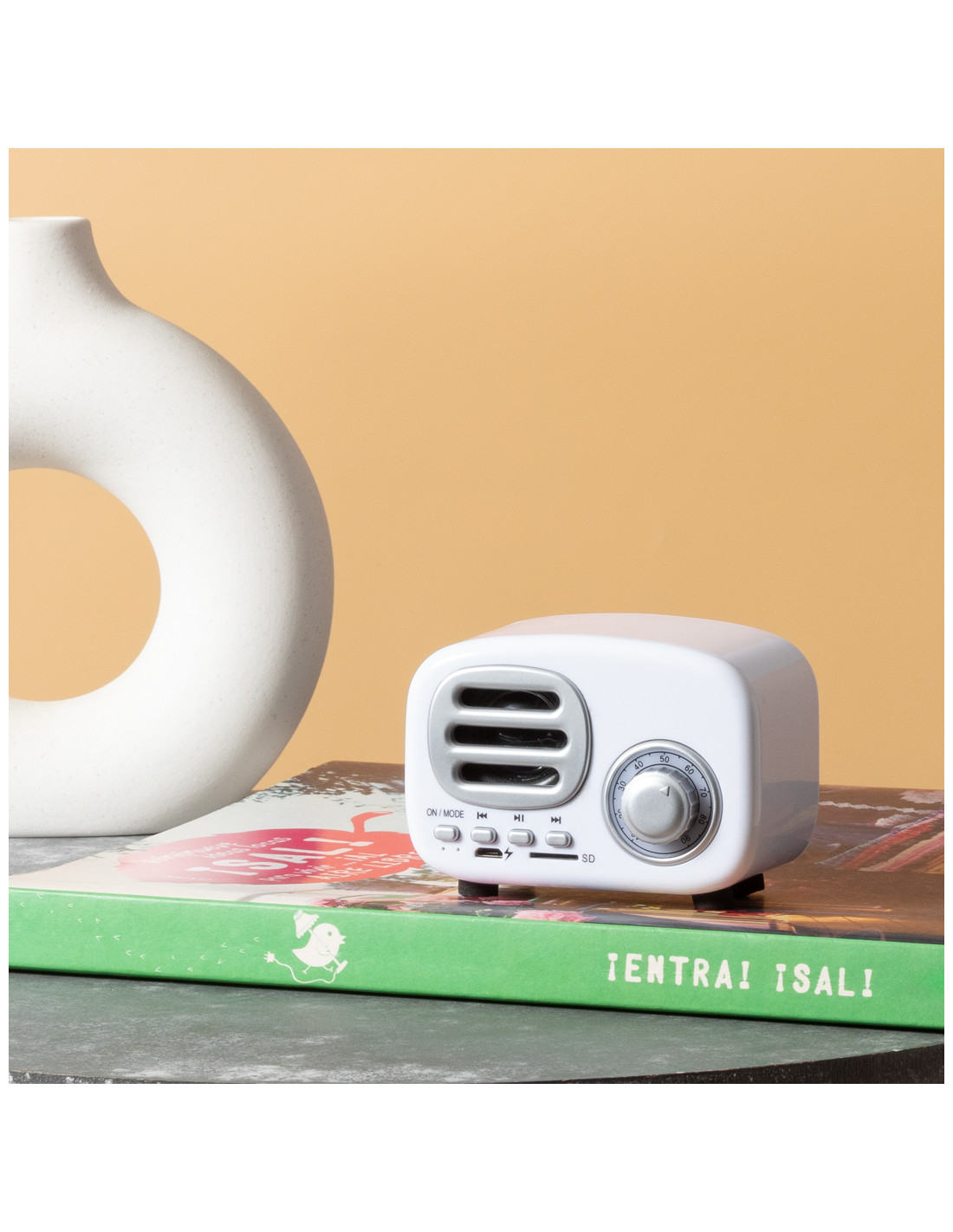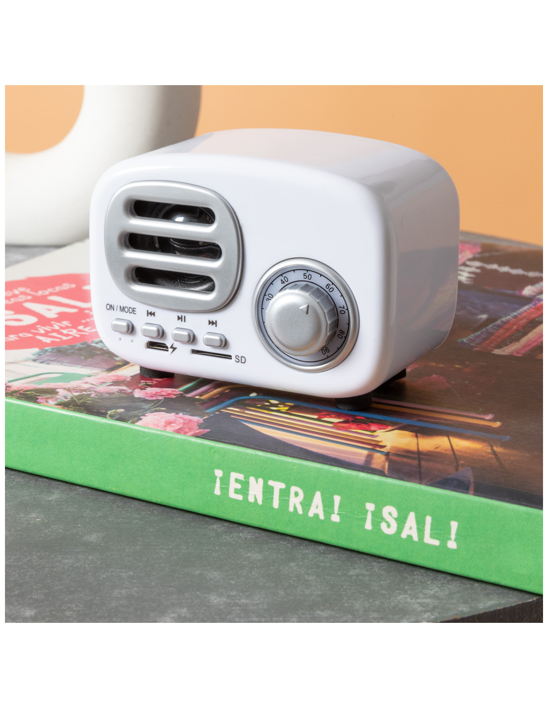 Compacto altavoz con estilo vintage en forma de radio de época y 3W de potencia. Con conexión Bluetooth® para disfrutar de la libertad inalámbrica, reproduciendo la música y aportando estilo al mismo tiempo. Con indicadores luminosos, ranura para tarjetas Micro SD de hasta 64 GB y batería de 500 mAh. Presentado en atractiva caja de diseño kraft, con manual de instrucciones en español e inglés.