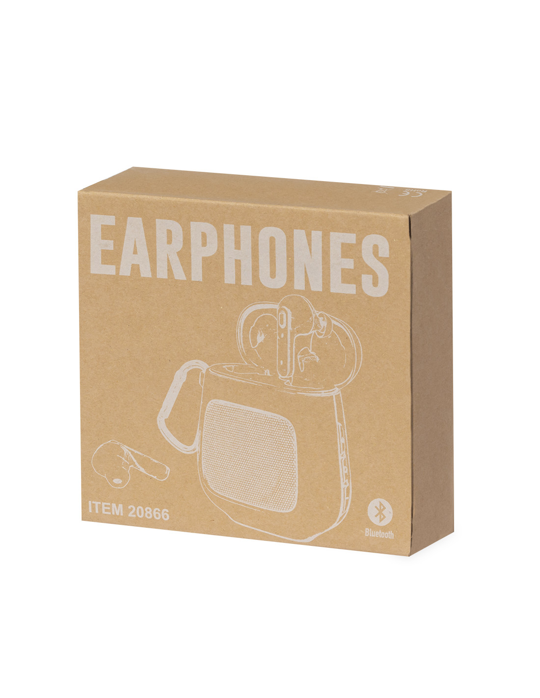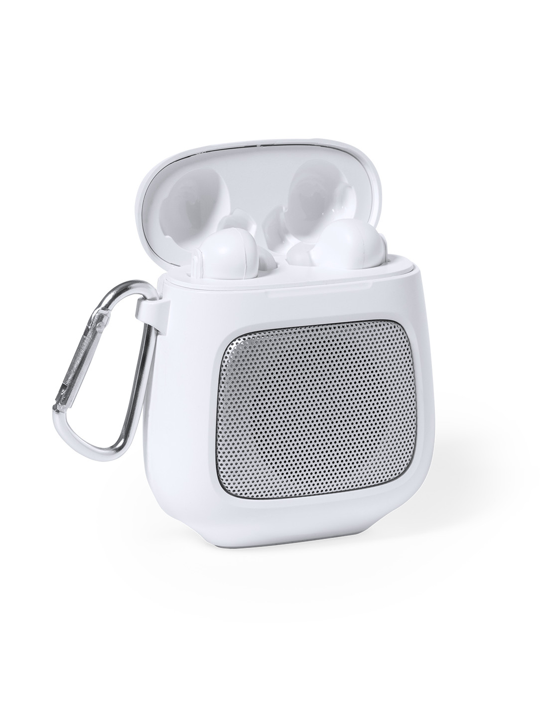 Originales auriculares altavoz con conexión Bluetooth® 5.0 y fabricados resistente ABS de color blanco. El set incluye un altavoz Bluetooth® de 3W de potencia, con función manos libres y mosquetón de transporte. Lo completa una pareja de auriculares intraurales con botón de control integrado y batería de 30 mAh cada uno. Base de carga de 600 mAh, con luz LED de estado de carga. Presentación en caja individual de diseño kraft, con manual de instrucciones en español e inglés.Fabricados conforme a los estándares RoHS y en cumplimiento con los siguientes requisitos de seguridad:Sistema de protección contra sobrecalentamiento.Sistema de protección contra sobrecarga.Sistema de bloqueo para evitar cortocircuitos.