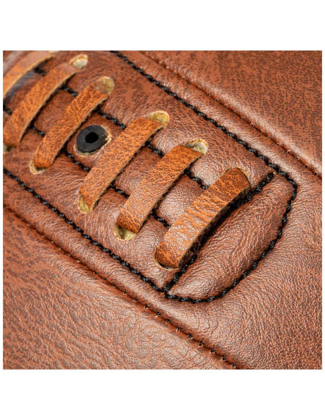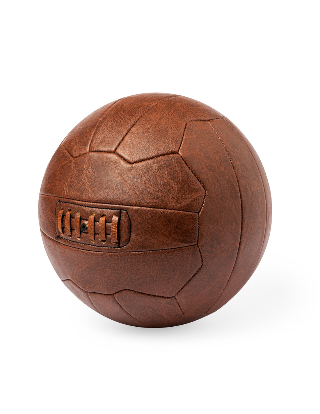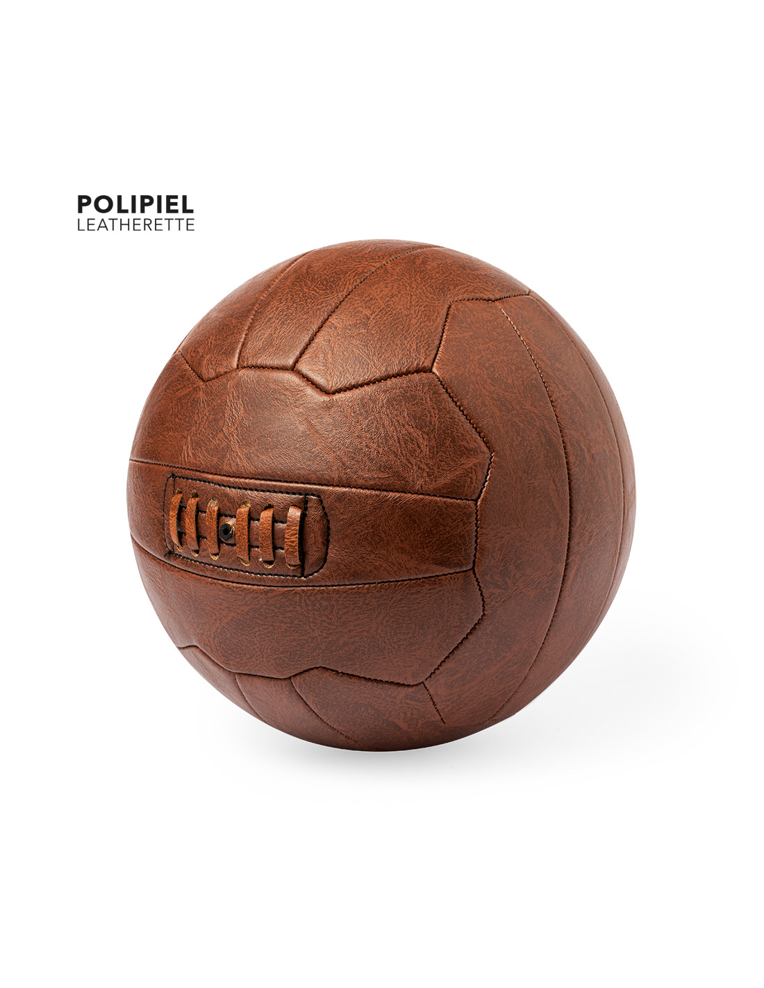 Balón de futbol de diseño retro fabricado en resistente polipiel. Con diseño inspirado en los antiguos balones de cuero y válvula reforzada con un cordón en el mismo material. Ideal para exposición o para disfrutar del juego. Presentación desinflado y en bolsa individual reciclada.