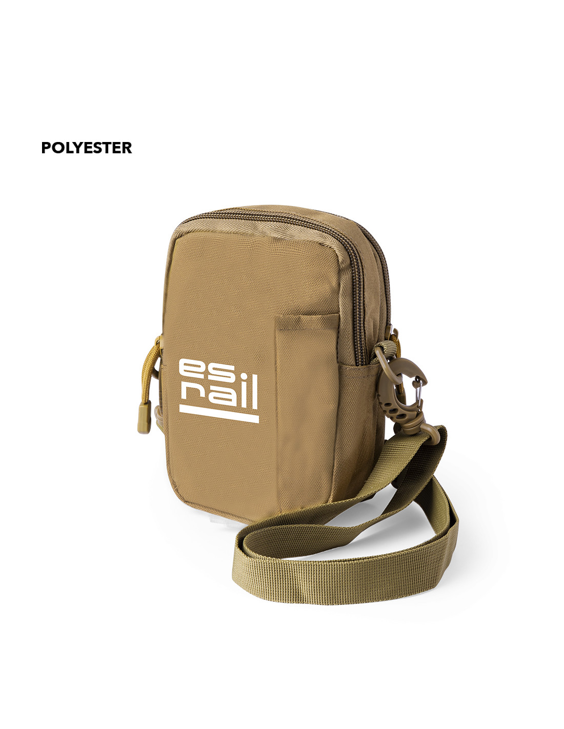 Bandolera en resistente poliéster 800D y tonos marrón arena. Con 2 bolsillos centrales, cierre de cremallera, y parte frontal de rápido acceso. Con cinta bandolera ajustable y presentada individualmente en bolsa reciclada.