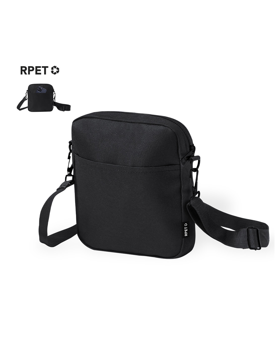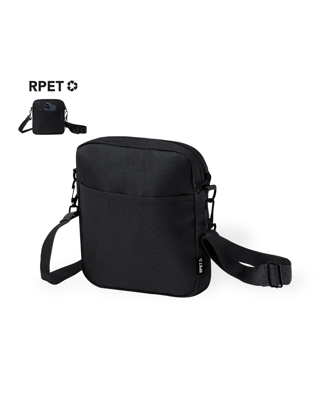 Bandolera confeccionada en poliéster RPET 600D, destacando por su bolsillo central de cierre cremallera y un compartimento frontal de fácil acceso. Equipada con una cinta ajustable para mayor comodidad y una etiqueta distintiva de RPET. Presentada individualmente en bolsa reciclada. El material RPET se elabora a partir de plástico reciclado, para así fomentar la reutilización de residuos plásticos y ayudar a la sostenibilidad del planeta.