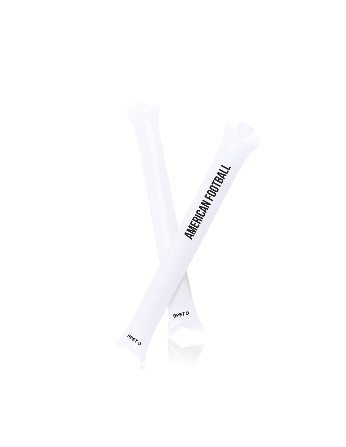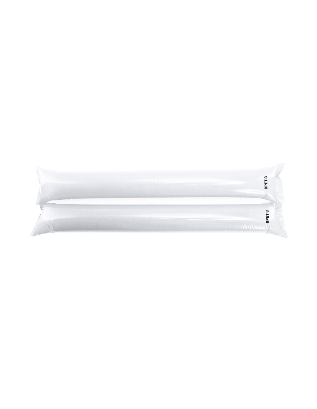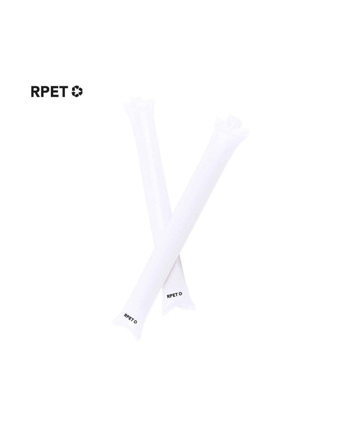 Par de bastom sticks/aplaudidores en resistente RPET y ruidoso material de color blanco. Reutilizables y con válvula de inflado incluida.El material RPET se elabora a partir de plástico reciclado, para así fomentar la reutilización de residuos plásticos y ayudar a la sostenibilidad del planeta. Presentado en bolsa de papel reciclada.