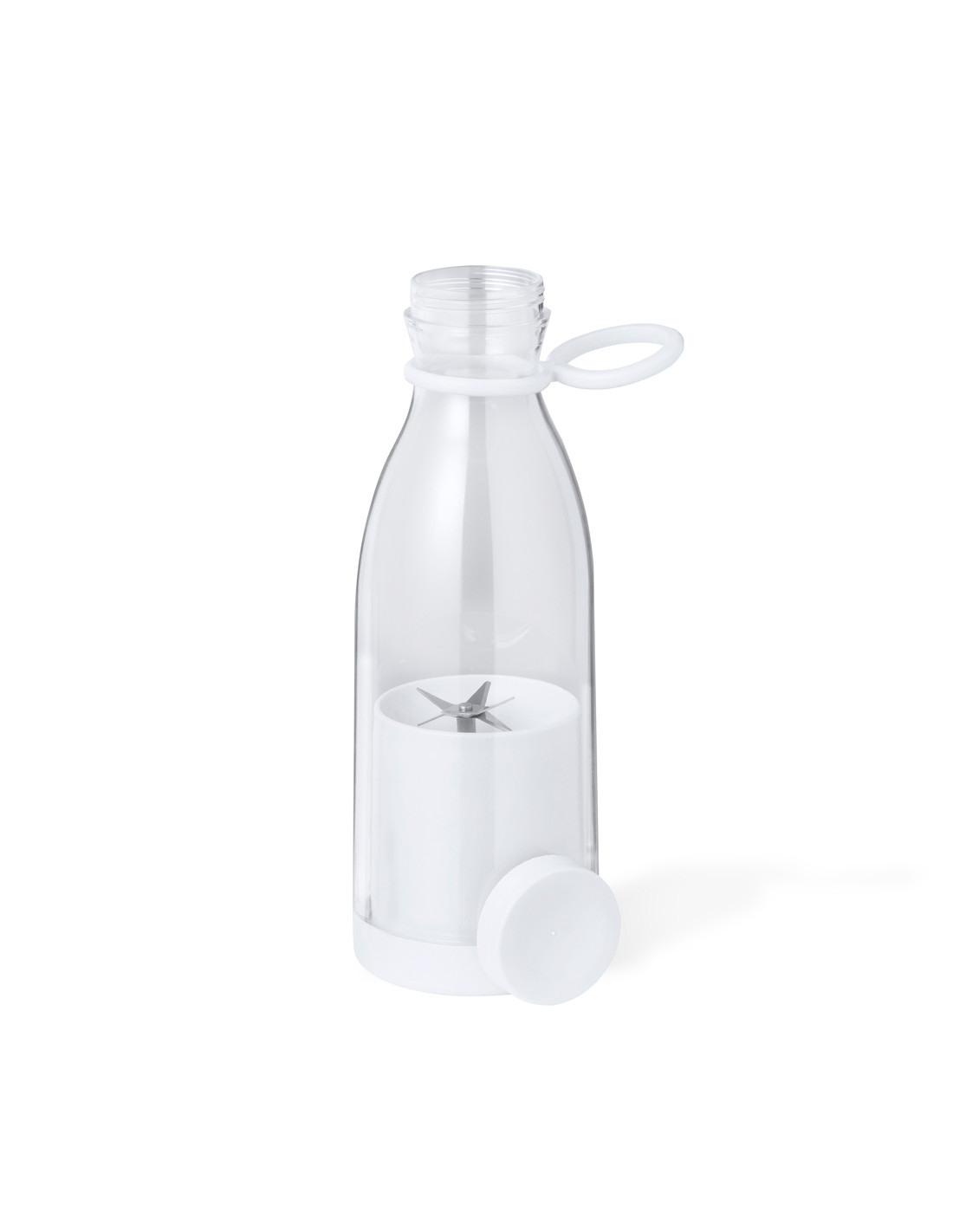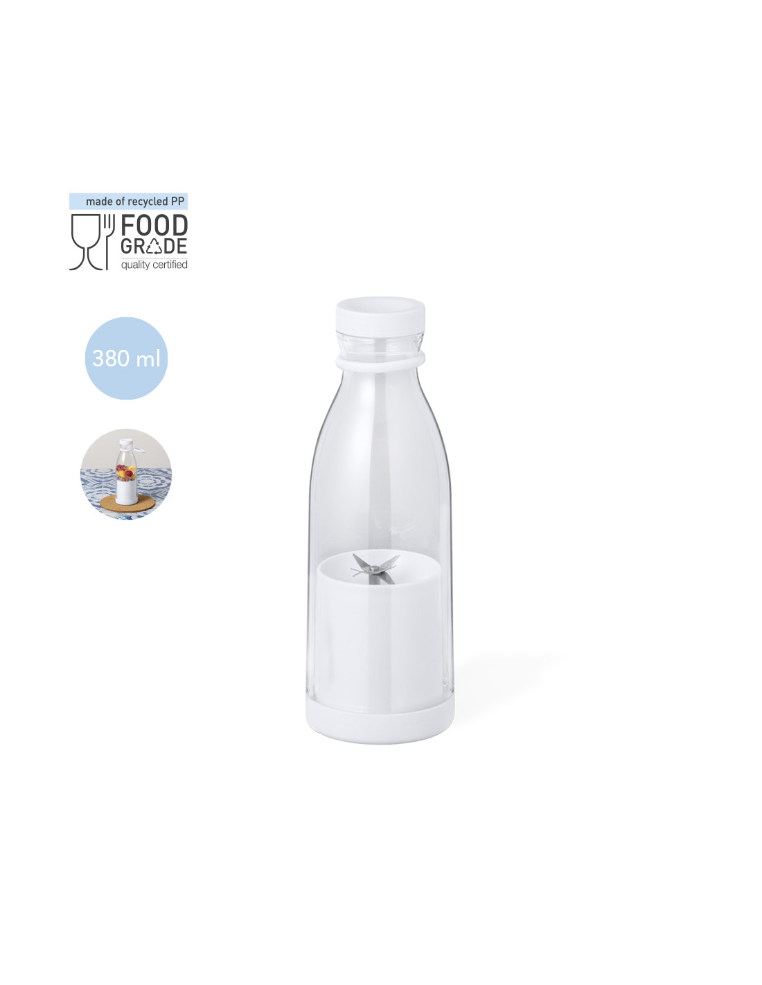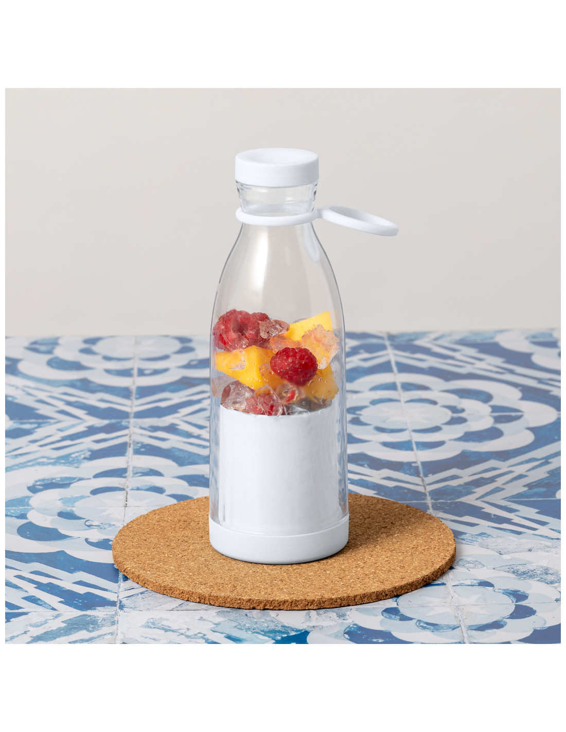 Bidón exprimidor de 380 ml de capacidad. Con exprimidor interior eléctrico para disfrutar de fruta y verdura recién exprimida en cualquier parte. Fácil de usar, gracias a su base que se desenrosca para introducir los alimentos y que a la vez permite limpiarlo cómodamente. Este original bidón permite disfrutar de la bebida por su tapón superior en forma de rosca y es fácil de transportar por su asa de silicona. Cuenta con una batería de 800 mAh para varios usos e incluye cable de carga. Disponible manual de instrucciones en español e inglés y presentado en una caja de diseño kraft.