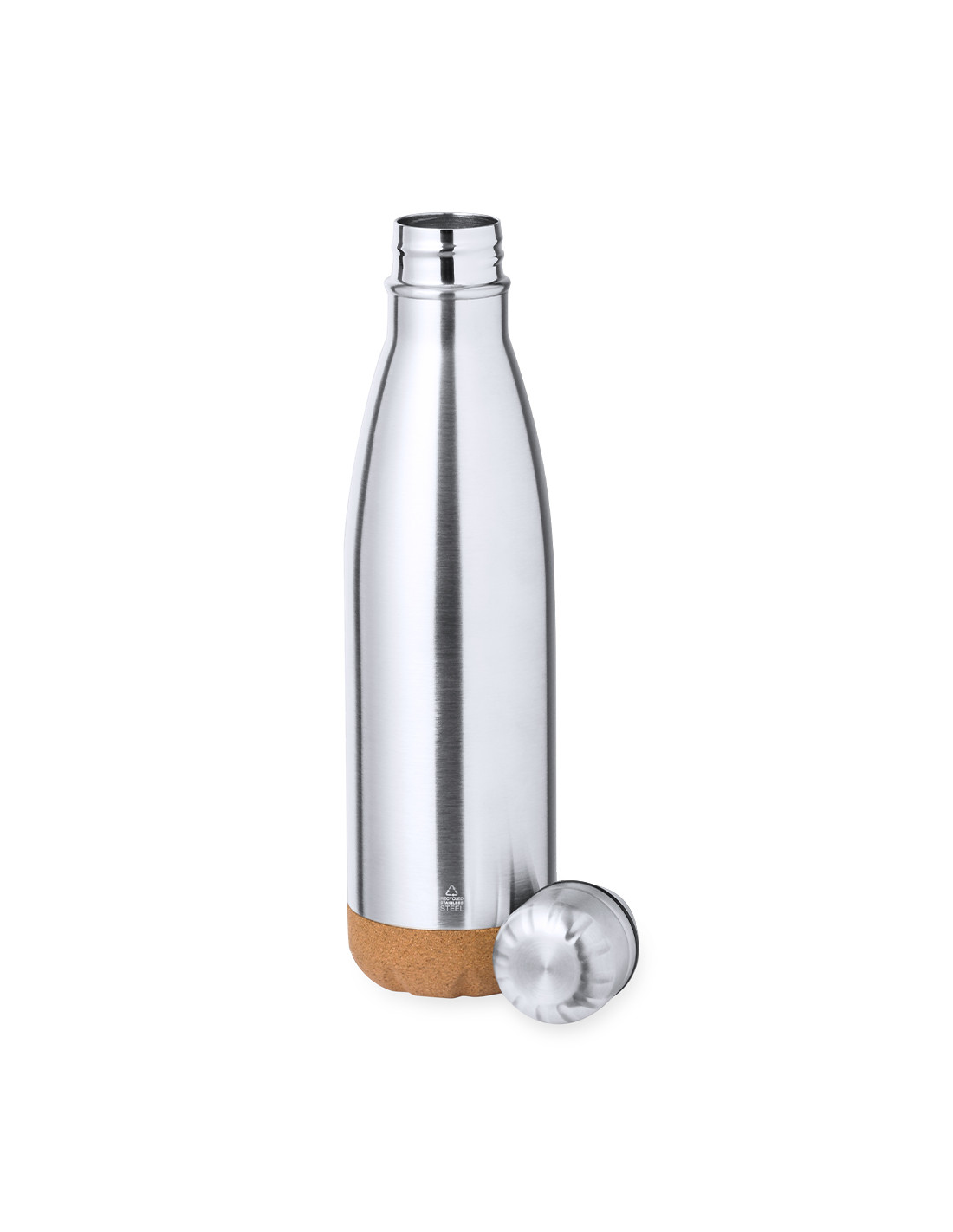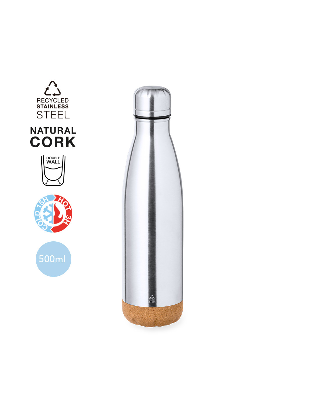 Bidón térmico de doble capa en Acero Inox Reciclado en 500 ml de capacidad. De acabado plata, con tapón a rosca a juego y base en corcho natural. Con logotipo Acero Inox Reciclado, libre de BPA y presentado en caja individual de diseño kraft.El acero es uno de los materiales más demandados y que puede encontrarse casi en todas partes, desde productos de uso diario a grandes construcciones. Con innumerables propiedades, entre las que cabe destacar la durabilidad y su alto grado de reutilización, convirtiéndolo en una alternativa muy valorada en soluciones de sostenibilidad. Debidamente tratado, permite obtener nuevos recursos de infinita utilización.