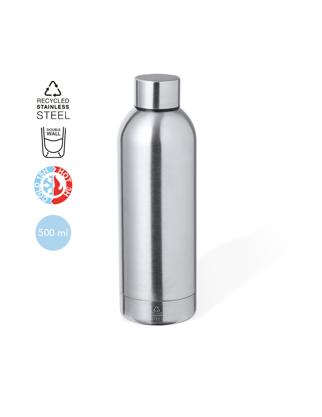 Bidón térmico de doble capa en Acero Inox Reciclado de 500 ml de capacidad. Cierre de rosca para un sellado óptimo y con logotipo Acero Inox Reciclado. Presentado en atractiva caja de diseño kraft.El acero es uno de los materiales más demandados y que puede encontrarse casi en todas partes, desde productos de uso diario a grandes construcciones. Con innumerables propiedades, entre las que cabe destacar la durabilidad y su alto grado de reutilización, convirtiéndolo en una alternativa muy valorada en soluciones de sostenibilidad. Debidamente tratado, permite obtener nuevos recursos de infinita utilización.
