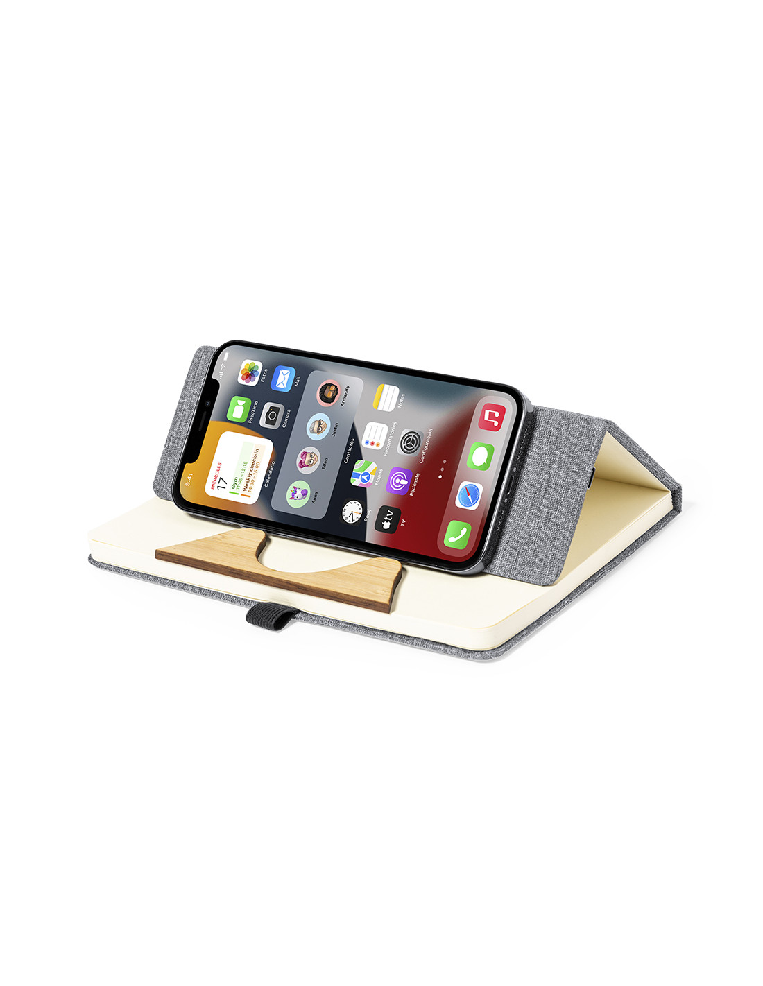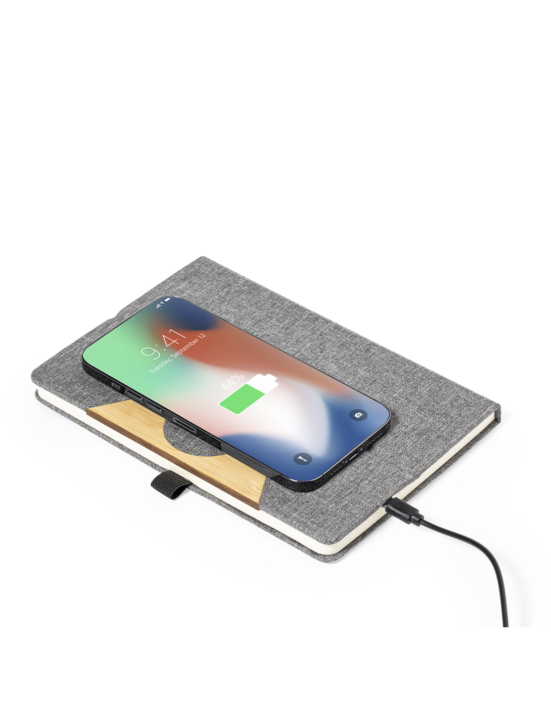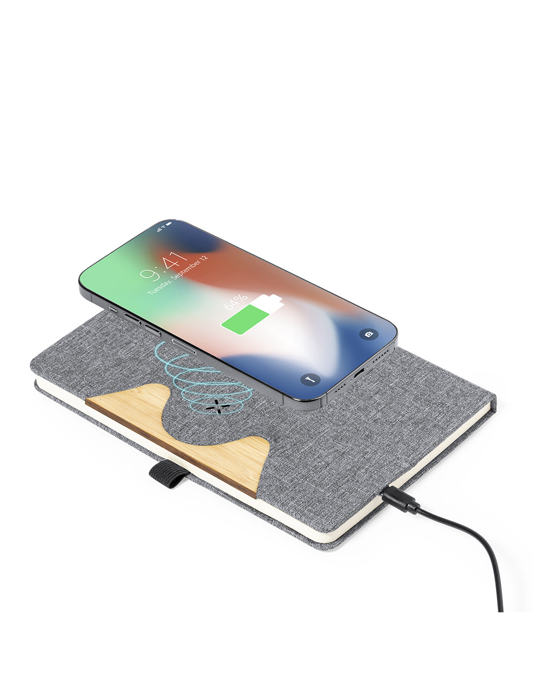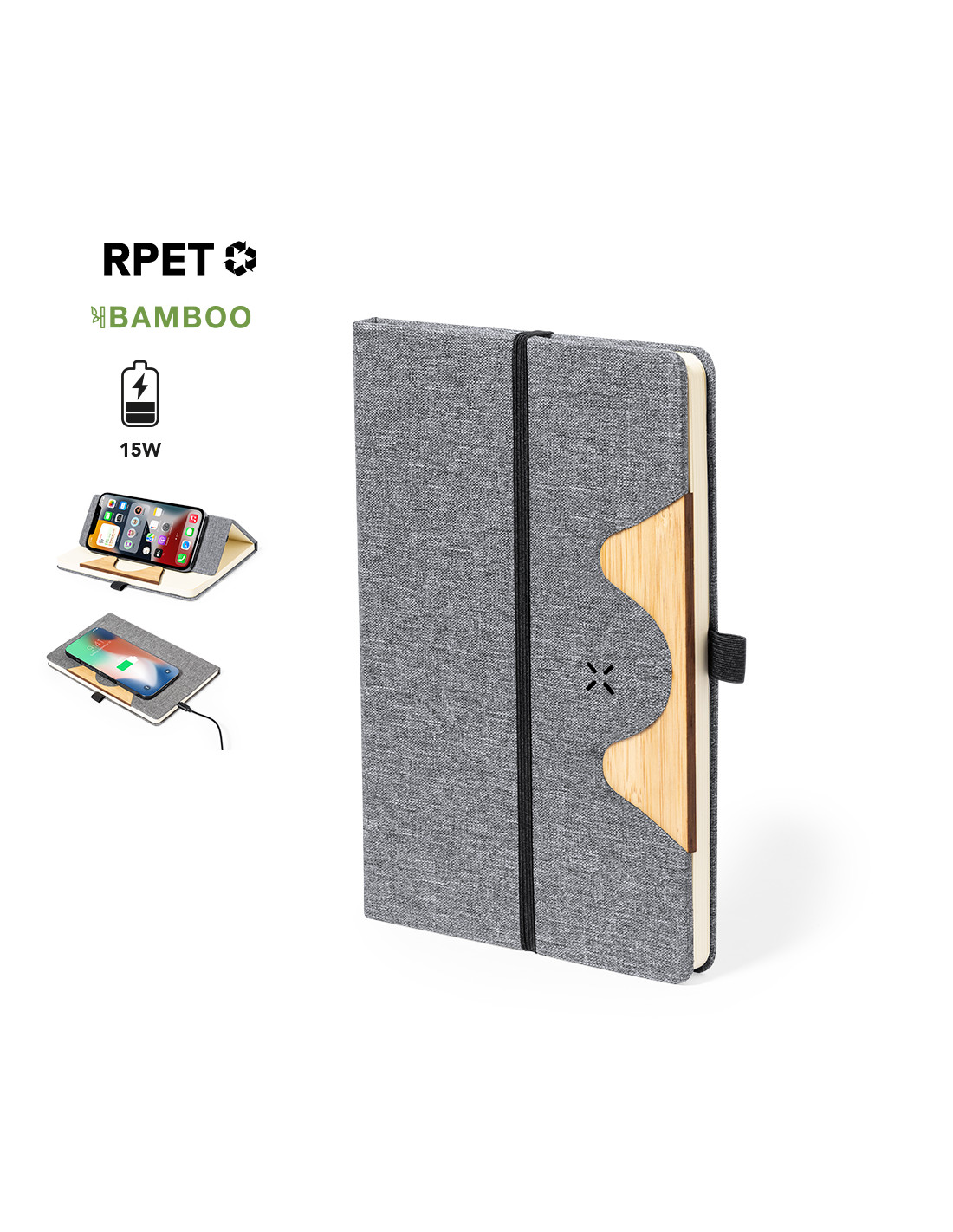 Bloc de notas cargador tamaño A5 y fabricado en resistente poliéster 300D RPET. Portada con detalle en bambú y cargador inalámbrico de 15W integrado, compatible con smartphones con tecnología de carga inalámbrica. Incluido cable de carga Tipo C y disponible manual de instrucciones en español e inglés. Con 80 hojas interiores de disposición a una raya y presentado en bolsa de papel reciclado. El material RPET se elabora a partir de plástico reciclado, para así fomentar la reutilización de residuos plásticos y ayudar a la sostenibilidad del planeta.Materiales como el bambú fomentan la utilización de materias primas naturales, reduciendo las emisiones contaminantes. Proviene de una planta de gran resistencia y versatilidad, con crecimiento y regeneración rápidos, siendo una e