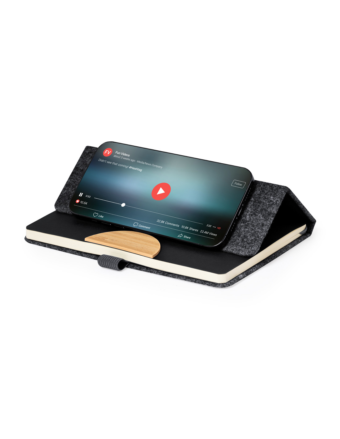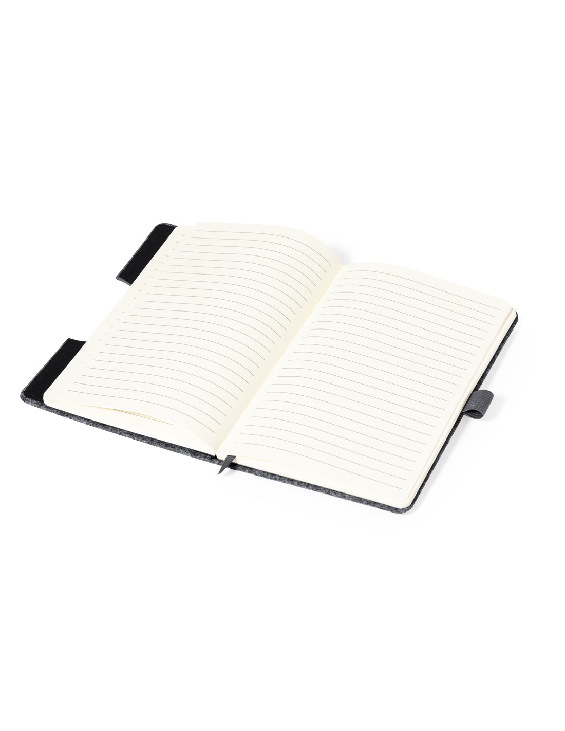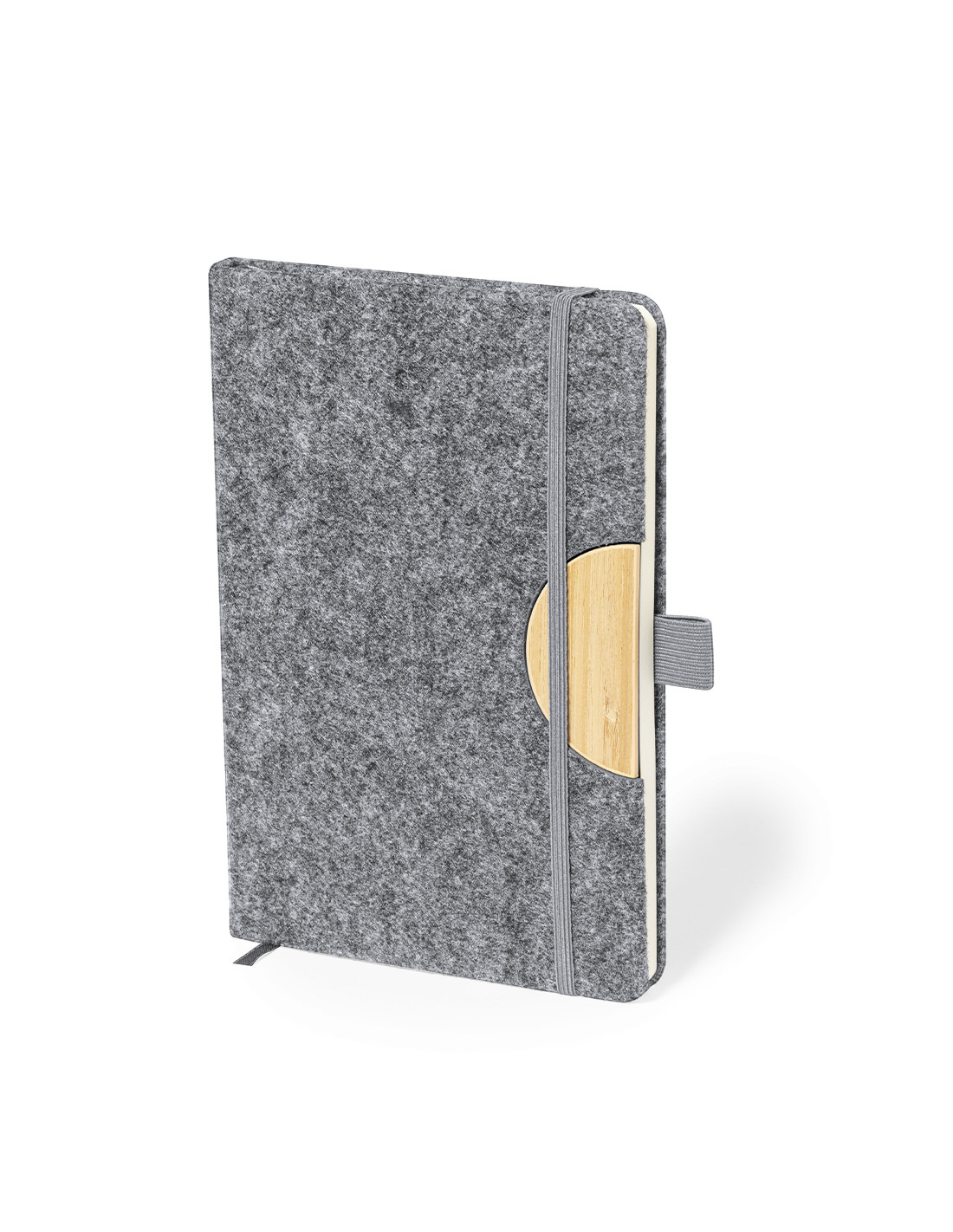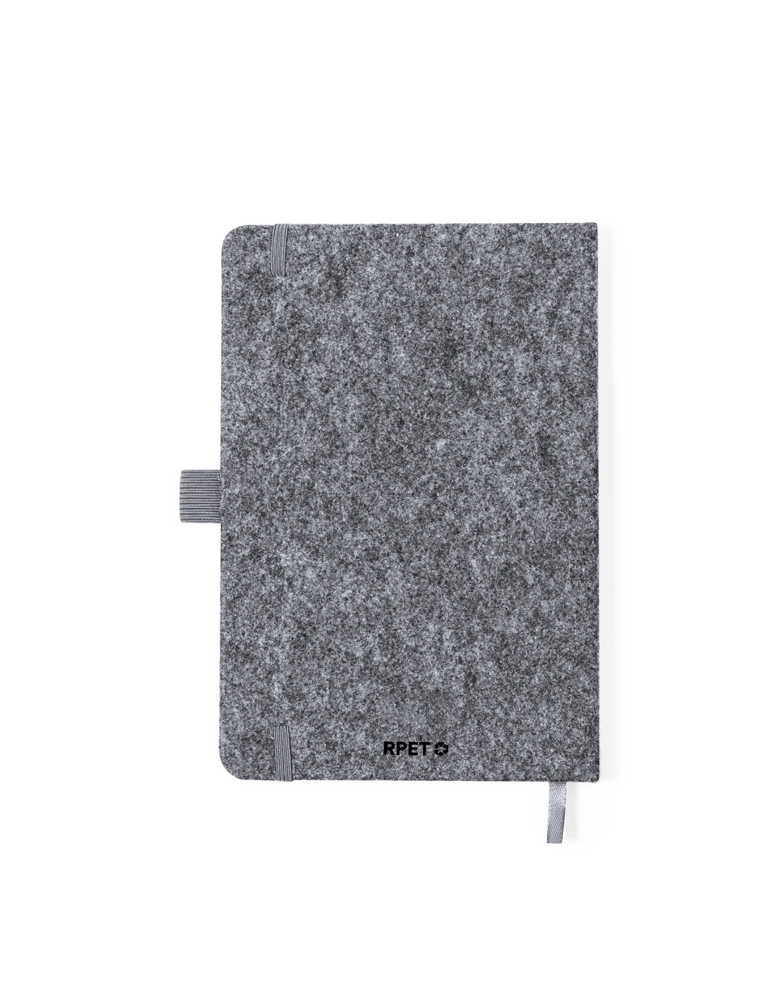 Bloc de notas con soporte de tapas rígidas fabricado en fieltro RPET 300D. Con original soporte para smartphone y tablet integrado en la portada, fabricado en bambú. Incluye elástico de cierre y soporte para bolígrafo a juego, con 80 hojas interiores de disposición a una raya. Con logotipo RPET en contraportada y presentada en bolsa individual reciclada.El fieltro RPET es fruto de la combinación del proceso de reciclaje de materiales plásticos junto con la técnica milenaria de fabricación del fieltro, dando como resultado un material de eco-tendencia que, además de ser de origen reciclado, también se convierte en reciclable.