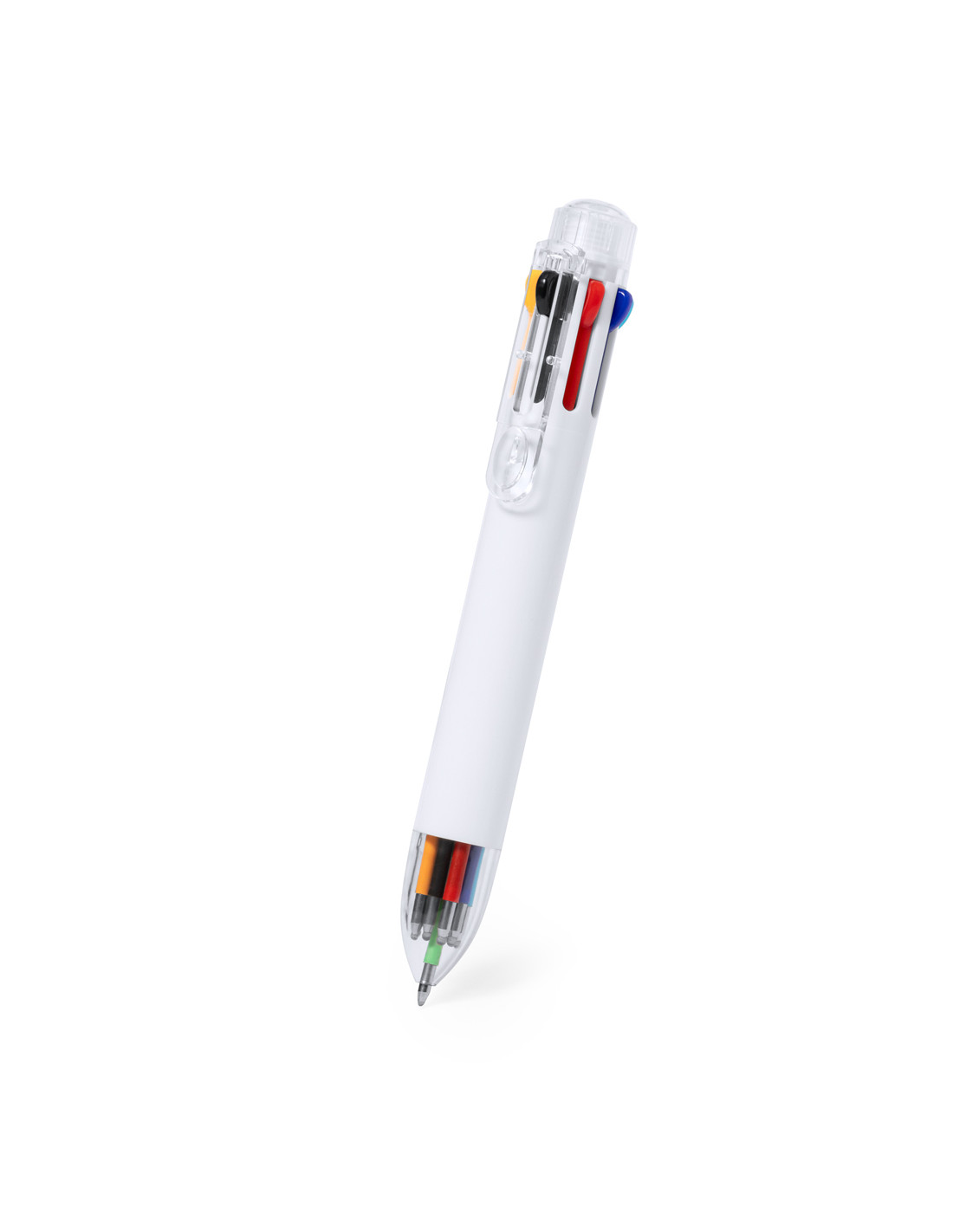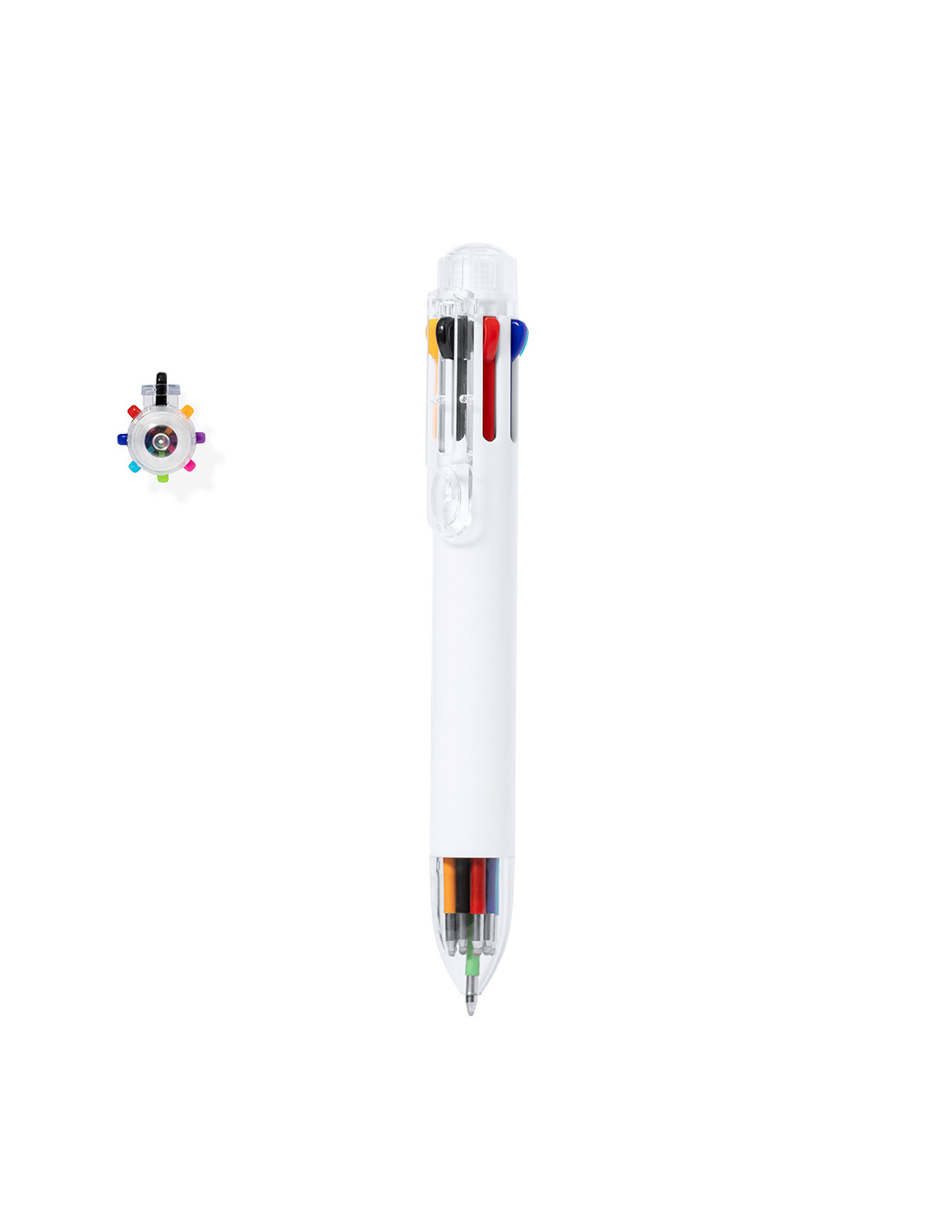 Bolígrafo con 8 variados colores de escritura en ABS. Este instrumento de escritura ofrece una variada paleta de colores en un solo bolígrafo, con una selección de 8 colores diferentes adaptándose a cualquier tarea. Su diseño ergonómico y funcionalidad hace que se pueda seleccionar fácilmente cada opción con sus pulsadores en la parte superior. Ideado con la caña de color blanco y accesorios y clip de color transparente.