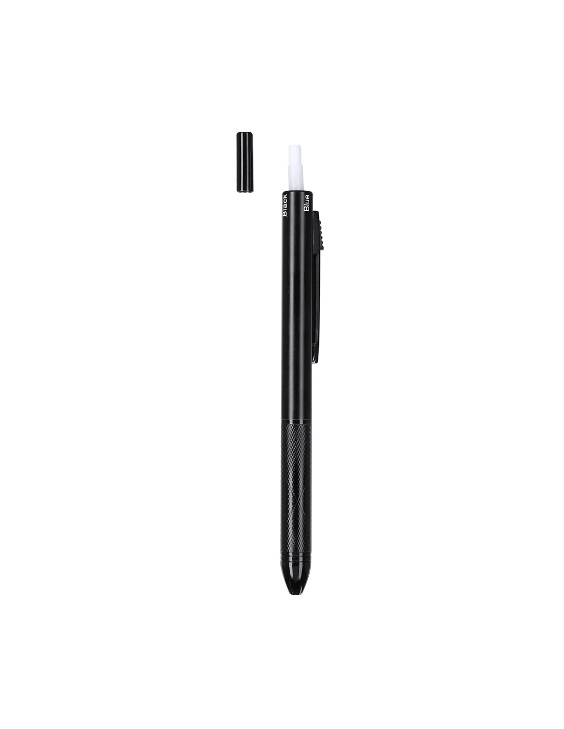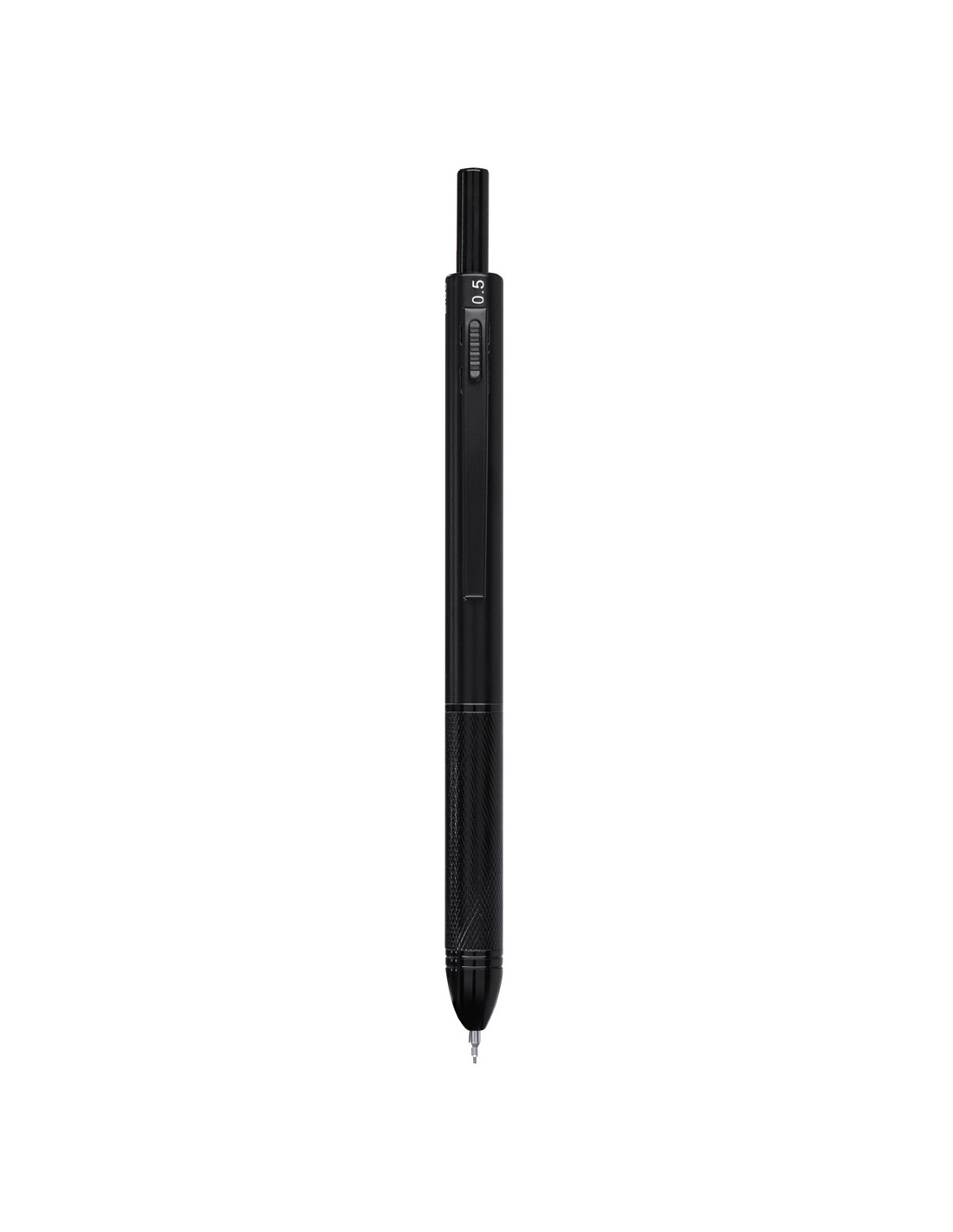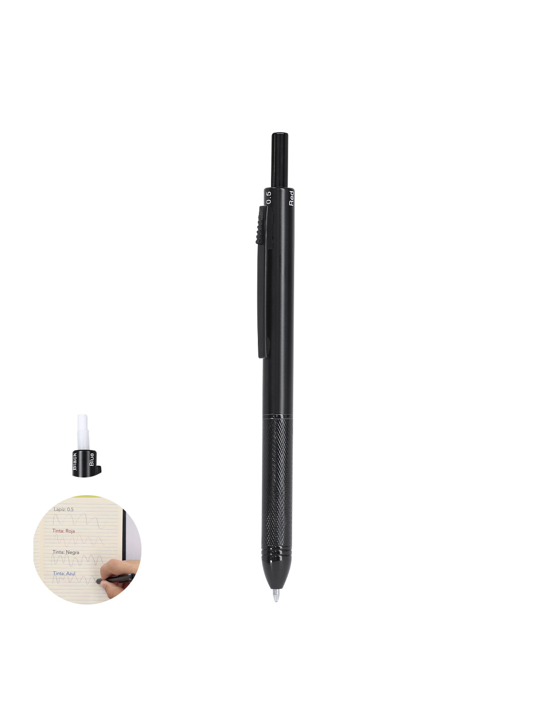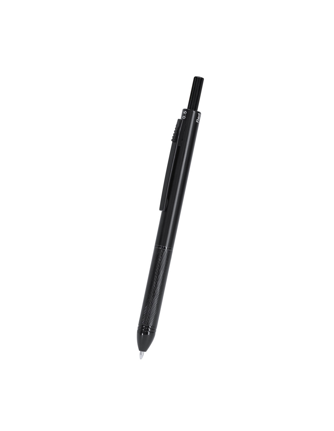 Bolígrafo portaminas 4 en 1, con ingenioso mecanismo de uso. La posición del pulsador permite seleccionar el color de la tinta o la función portaminas. Fabricado en resistente aluminio. Opciónes de tinta azul, negra y roja. Cuenta función portaminas. Incluida 1 mina de 0,5mm. Con goma integrada en el pulsador. Con empuñadura ergonómica y clip a juego.