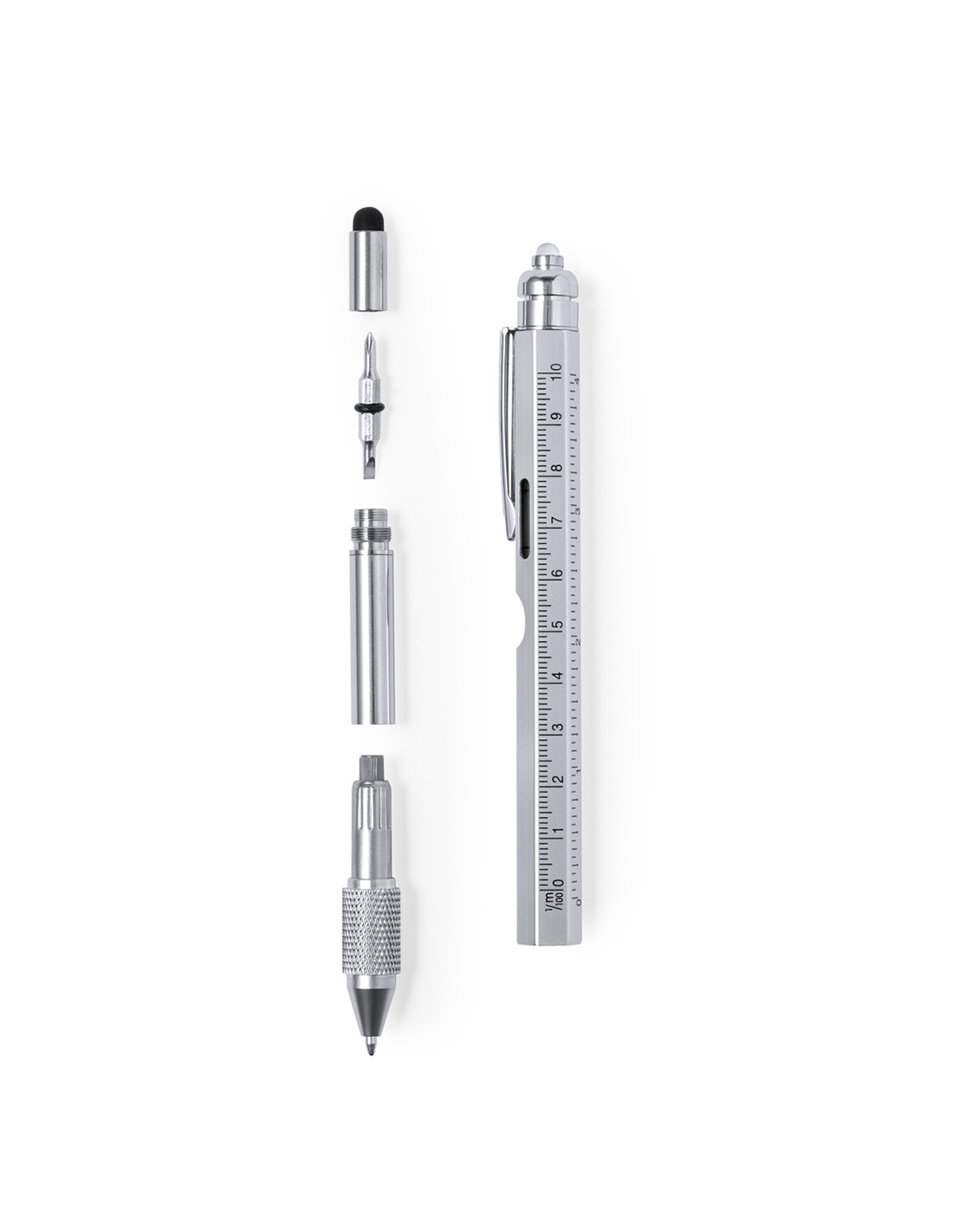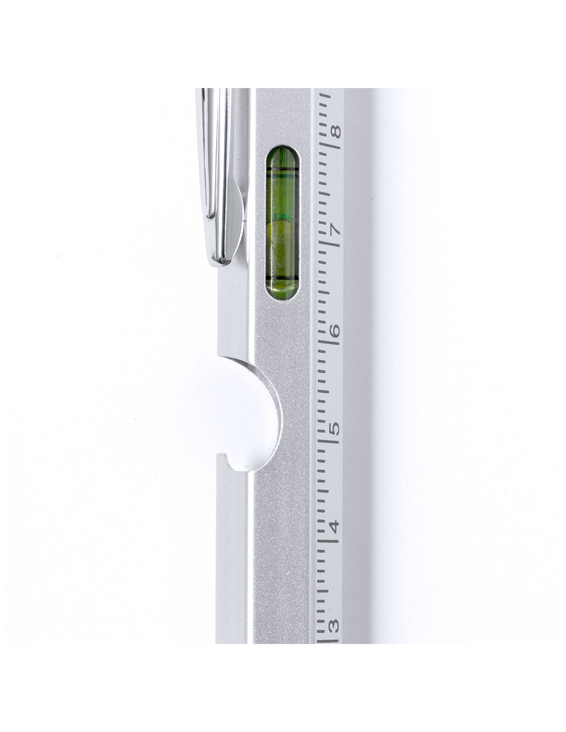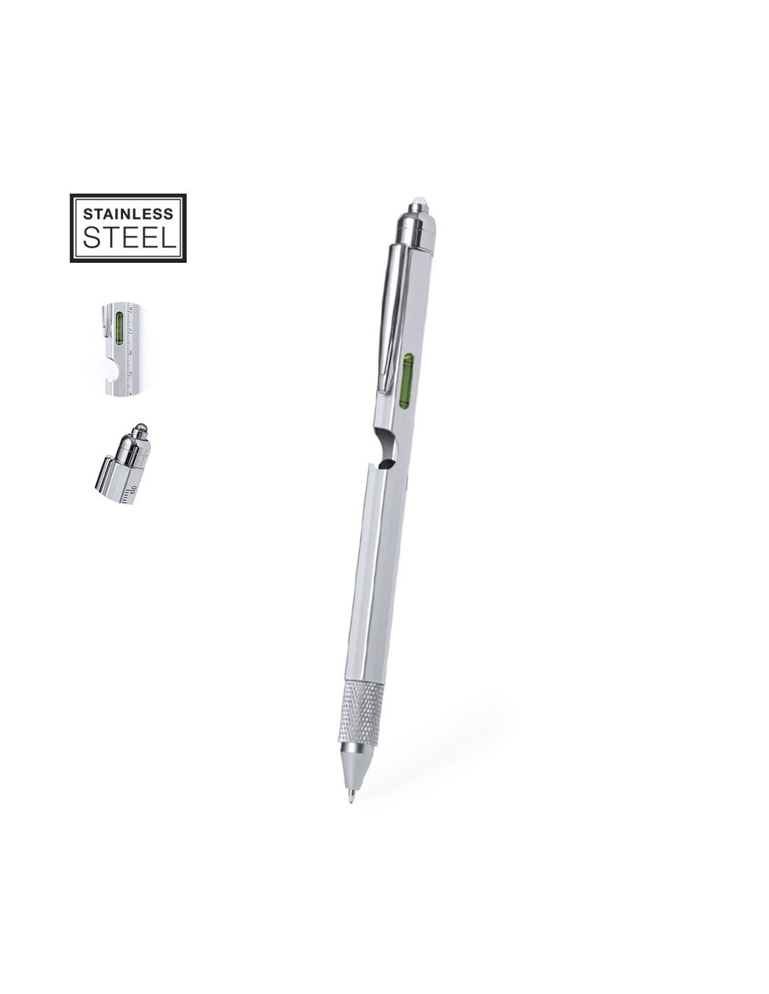 Bolígrafo multifunción 8 en 1 de mecanismo giratorio, fabricado en acero inox. Incluye regla en cm y pulgadas, nivel, abridor, 1 LED alimentado por pila de botón (incluida), puntero, punta plana y philips. Con clip metálico y tinta azul. Presentado individualmente en caja de diseño kraft.