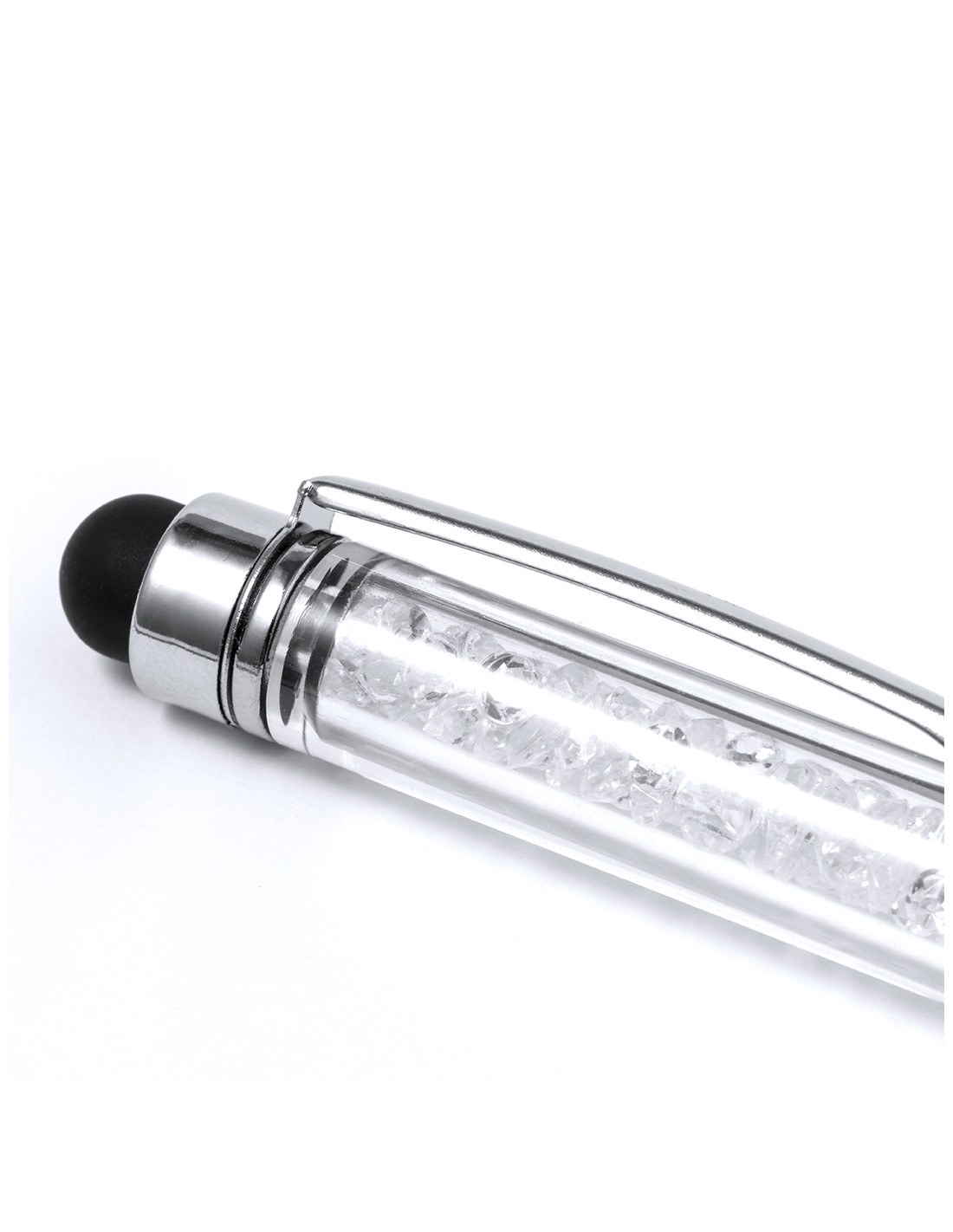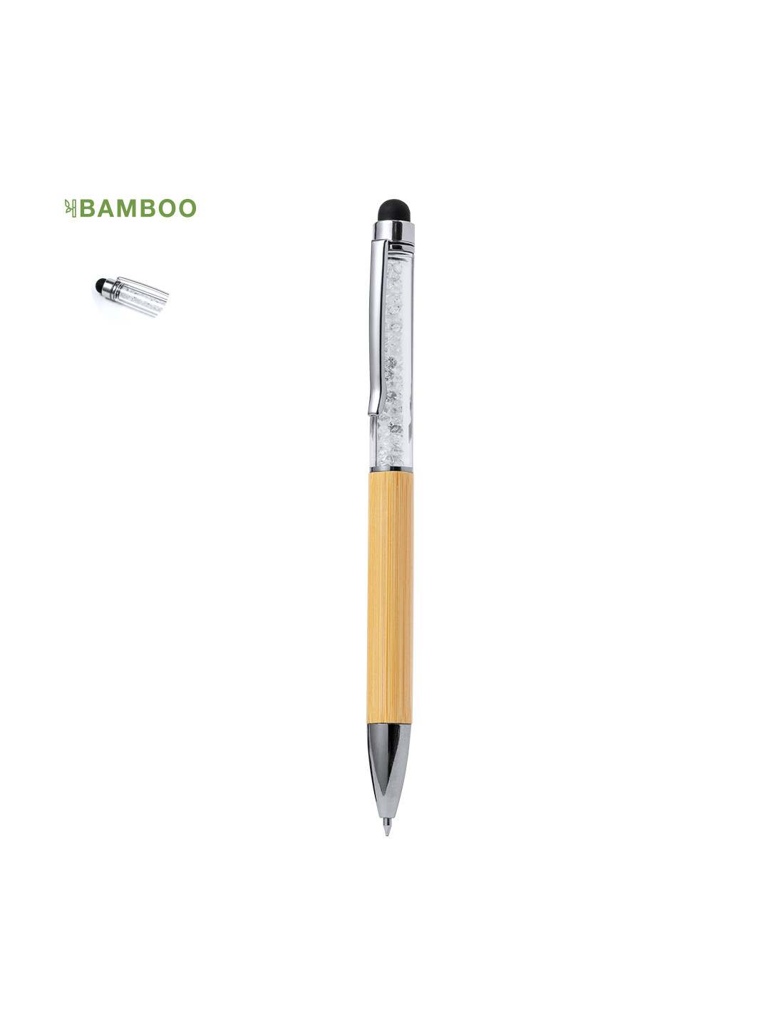 Elegante bolígrafo puntero de bambú. Estructura elaborada en bambú con una cápsula transparente que alberga cristales con forma de diamantes. Este elegante bolígrafo cuenta también con un puntero en la parte superior, clip y elementos decorativos metálicos. Con mecanismo giratorio y en tinta azul. Materiales como el bambú fomentan la utilización de materias primas naturales, reduciendo las emisiones contaminantes. Proviene de una planta de gran resistencia y versatilidad, con crecimiento y regeneración rápidos, siendo una excelente alternativa al uso de madera tradicional.