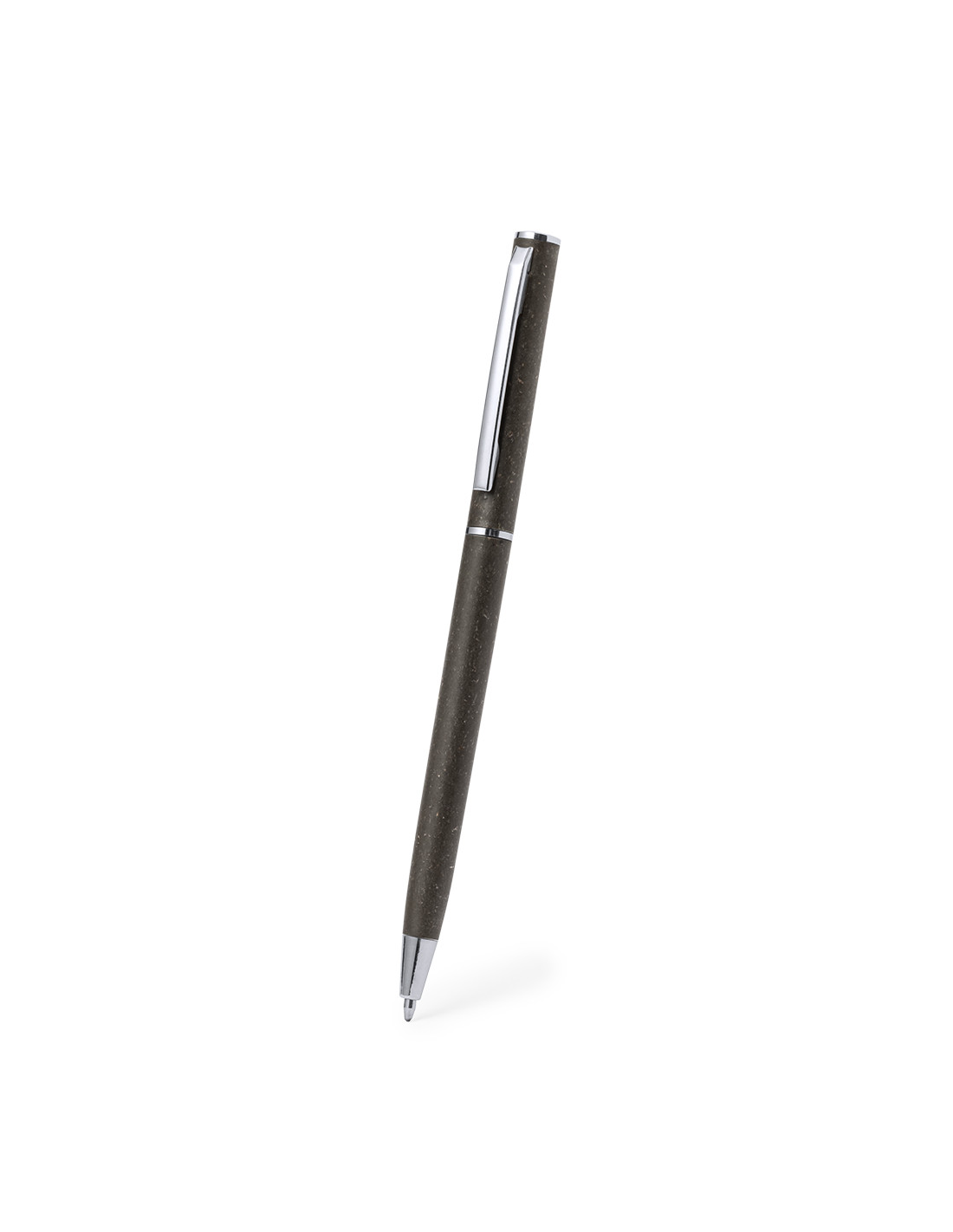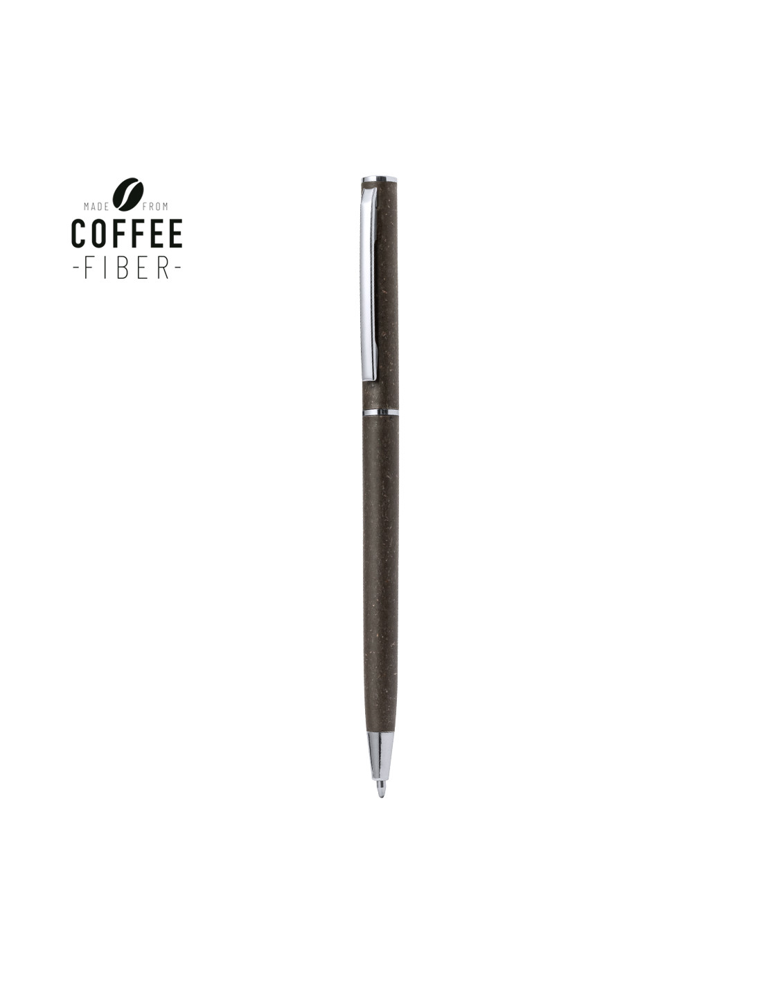 Bolígrafo con cuerpo en fibra de café. Clip metálico y accesorios cromados. De mecanismo giratorio y de tinta azul. Con logotipo fibra de café y disponible en color natural.La fibra de café es una solución circular que se obtiene de la utilización de los residuos producidos en la obtención del café. Una alternativa sostenible que favorece la reducción del uso de plásticos, ahorrando energía en su proceso de fabricación y contribuyendo al cuidado del medio ambiente.