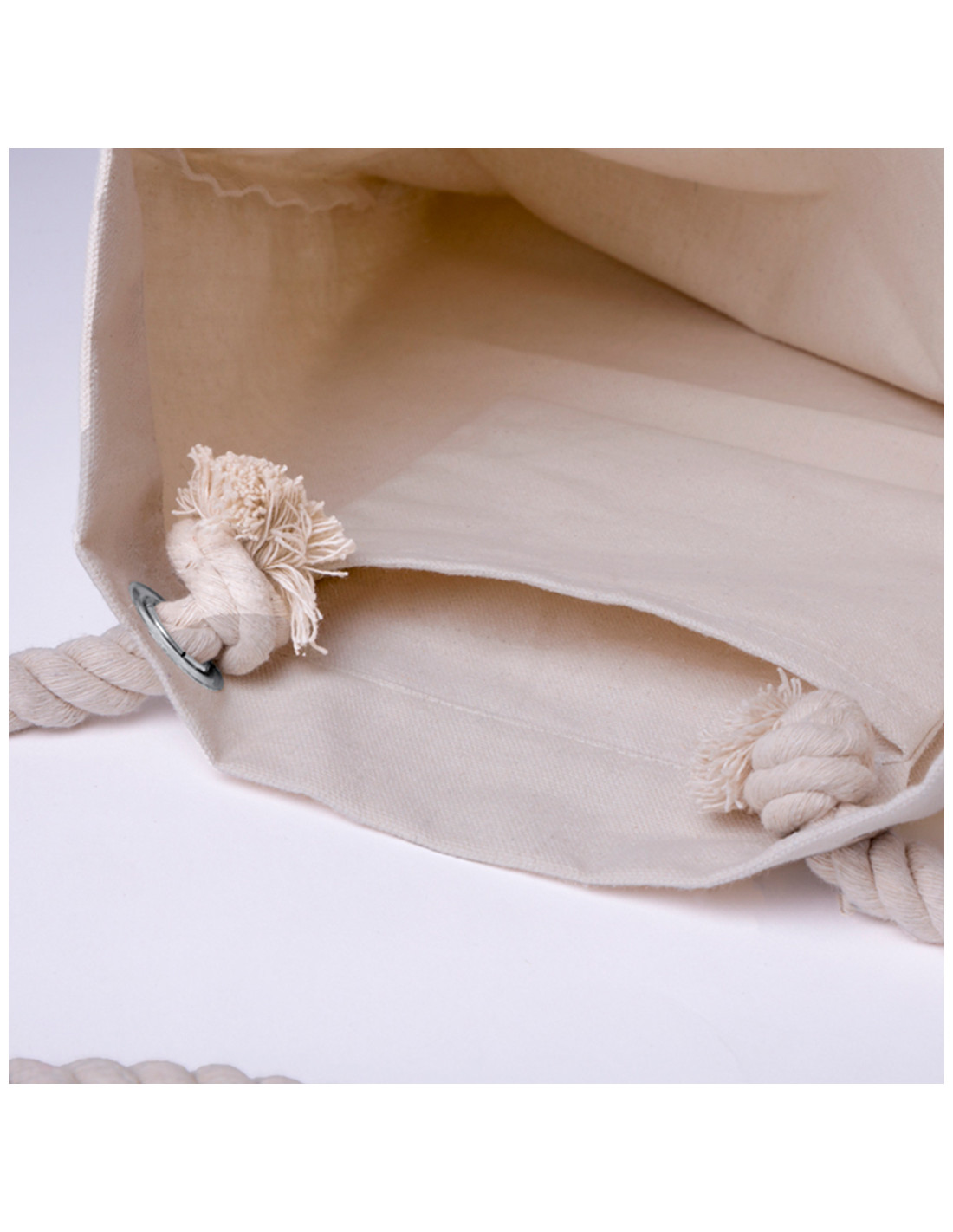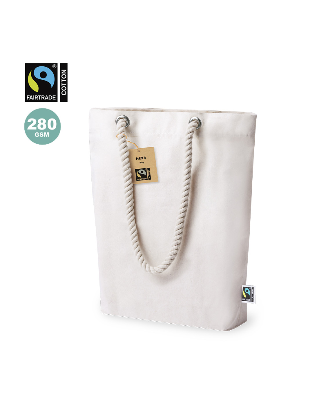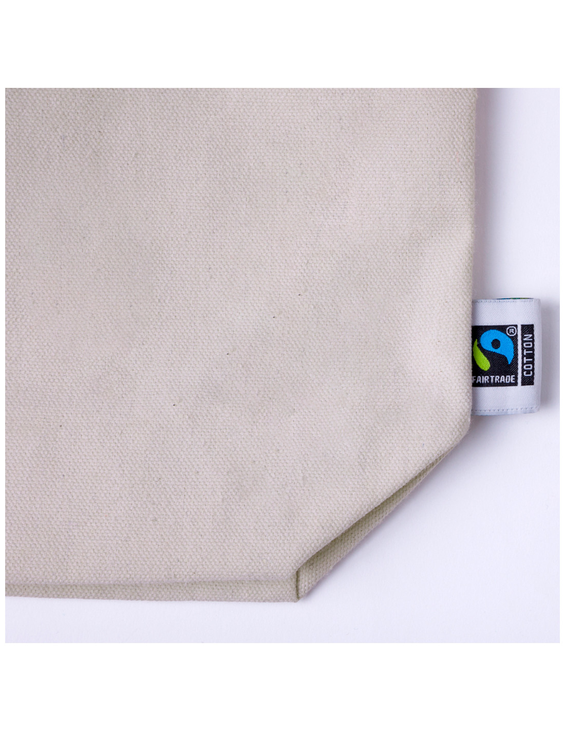 Bolsa de línea nature, fabricada en 100% algodón de 280g/m2 de color natural. Con certificación Fairtrade (Comercio Justo) un sistema comercial solidario y alternativo al convencional que persigue el desarrollo de los pueblos y la lucha contra la pobreza. De acabado cosido, asas en forma de cuerda y argollas para mayor firmeza. Resistencia hasta 10kg de peso. Incluida etiqueta Fairtrade y etiqueta con logotipo en cartón reciclado.