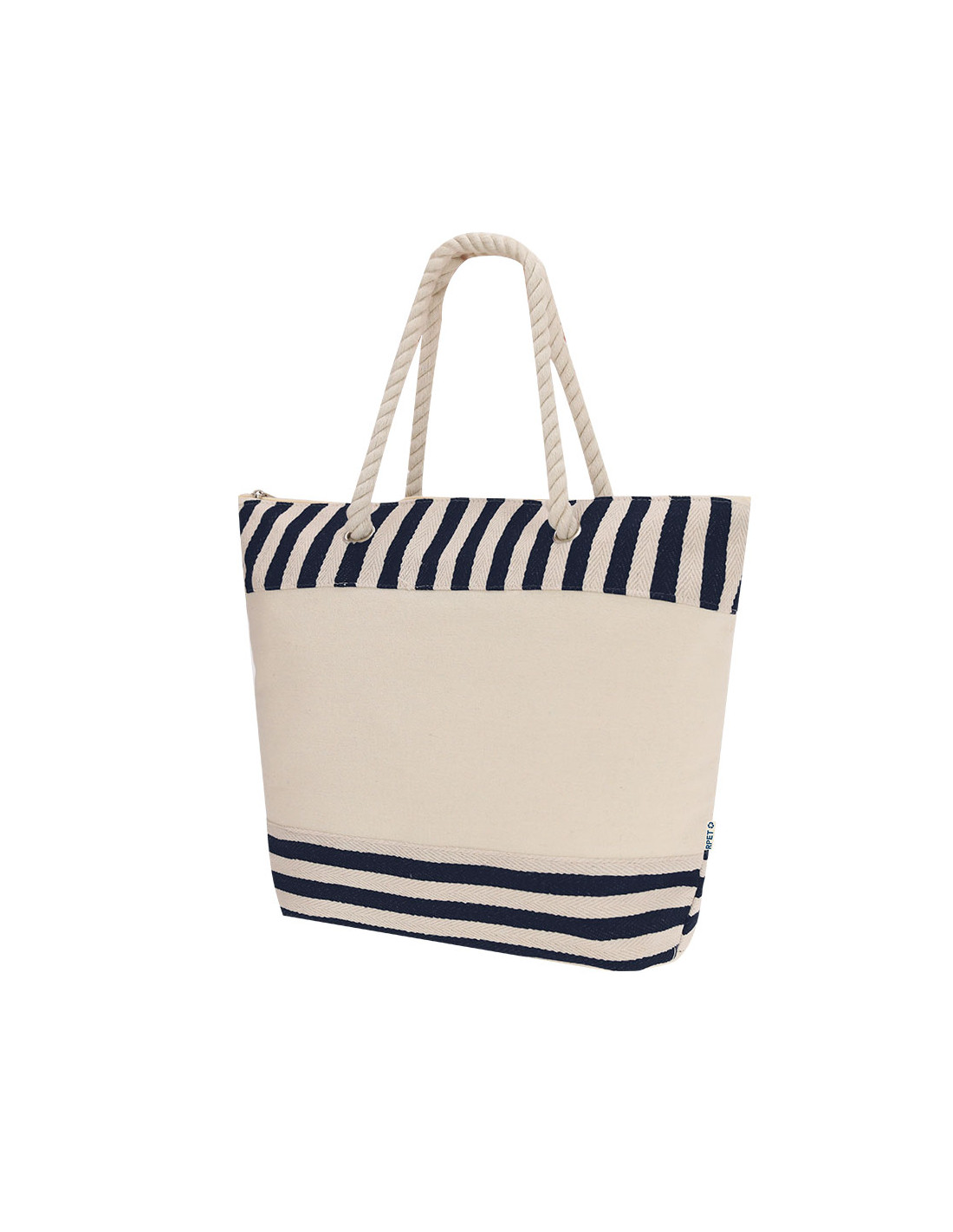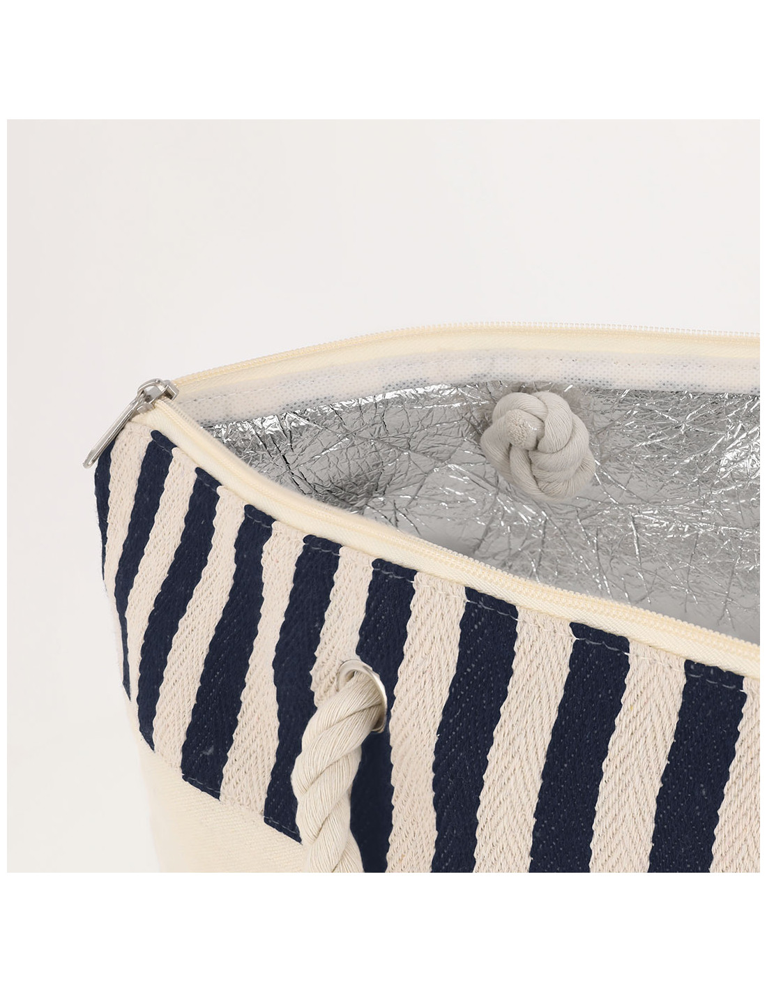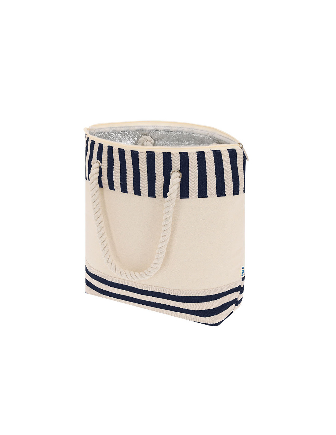 Bolsa térmica confeccionada en resistente material RPET con interior de aluminio, ideal para mantener la temperatura de alimentos y bebidas.Con un diseño a rayas naturales a juego con color. Incluye cierre de cremallera para mayor seguridad y asas largas de algodón en formato cuerda, reforzadas con resistentes argollas metálicas.