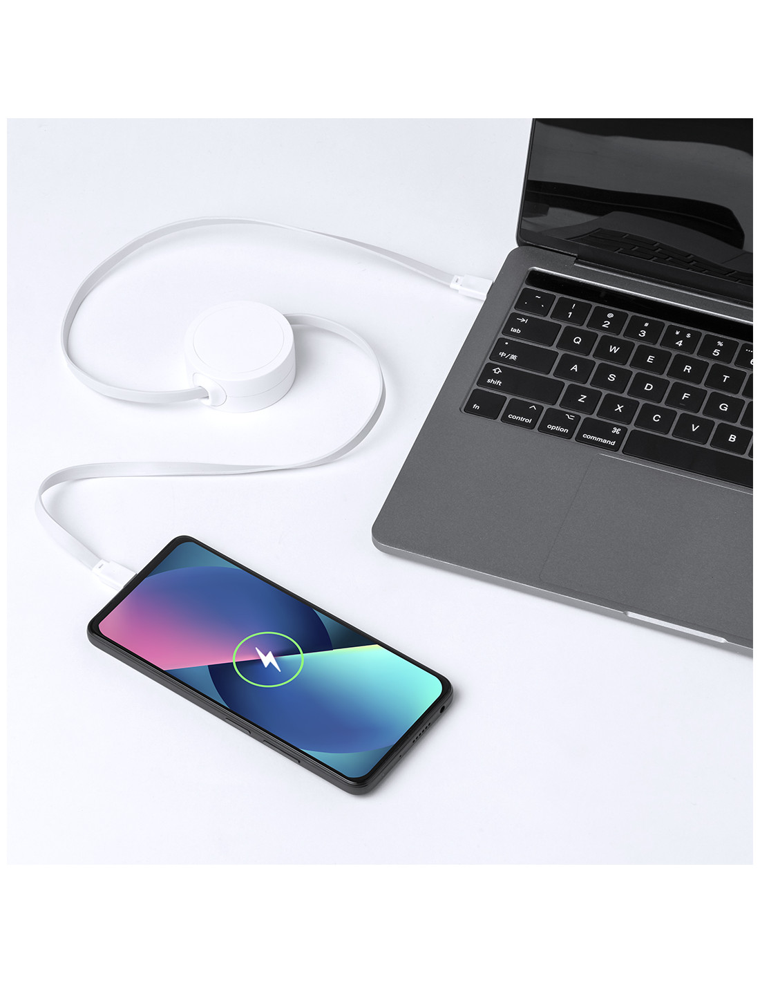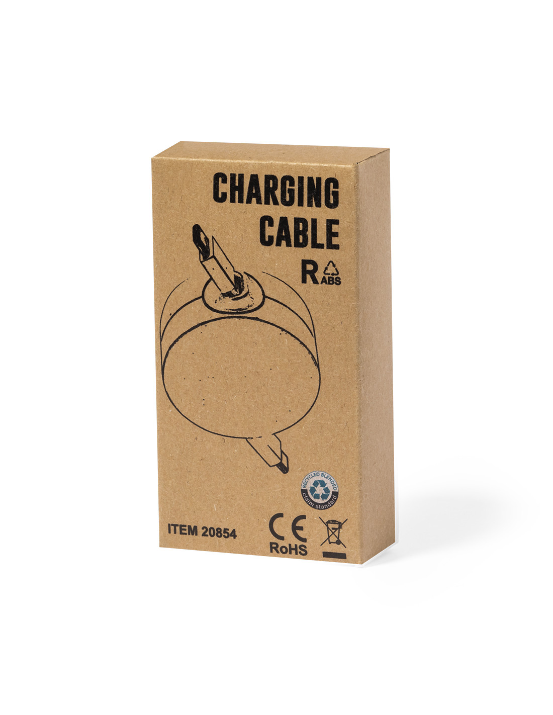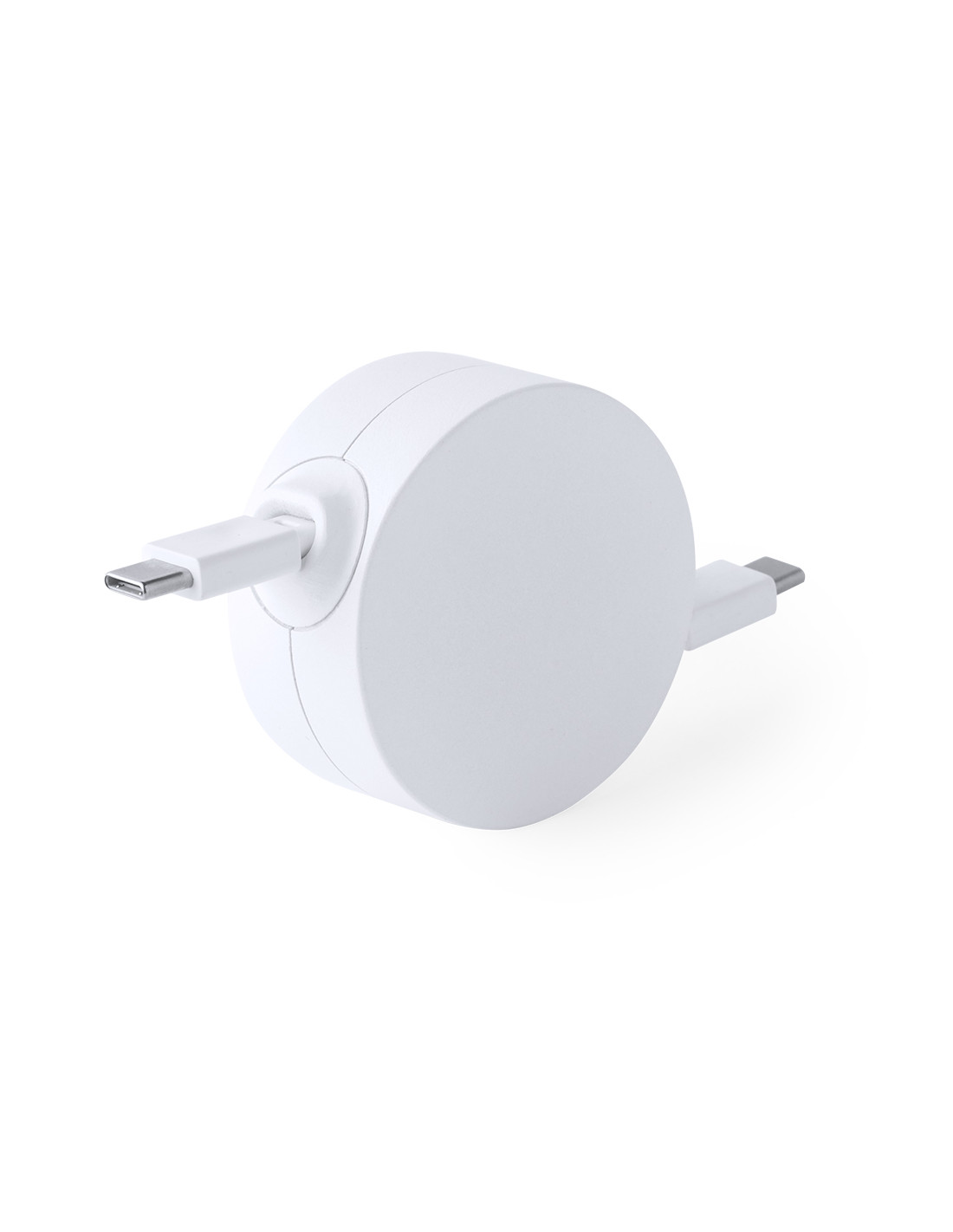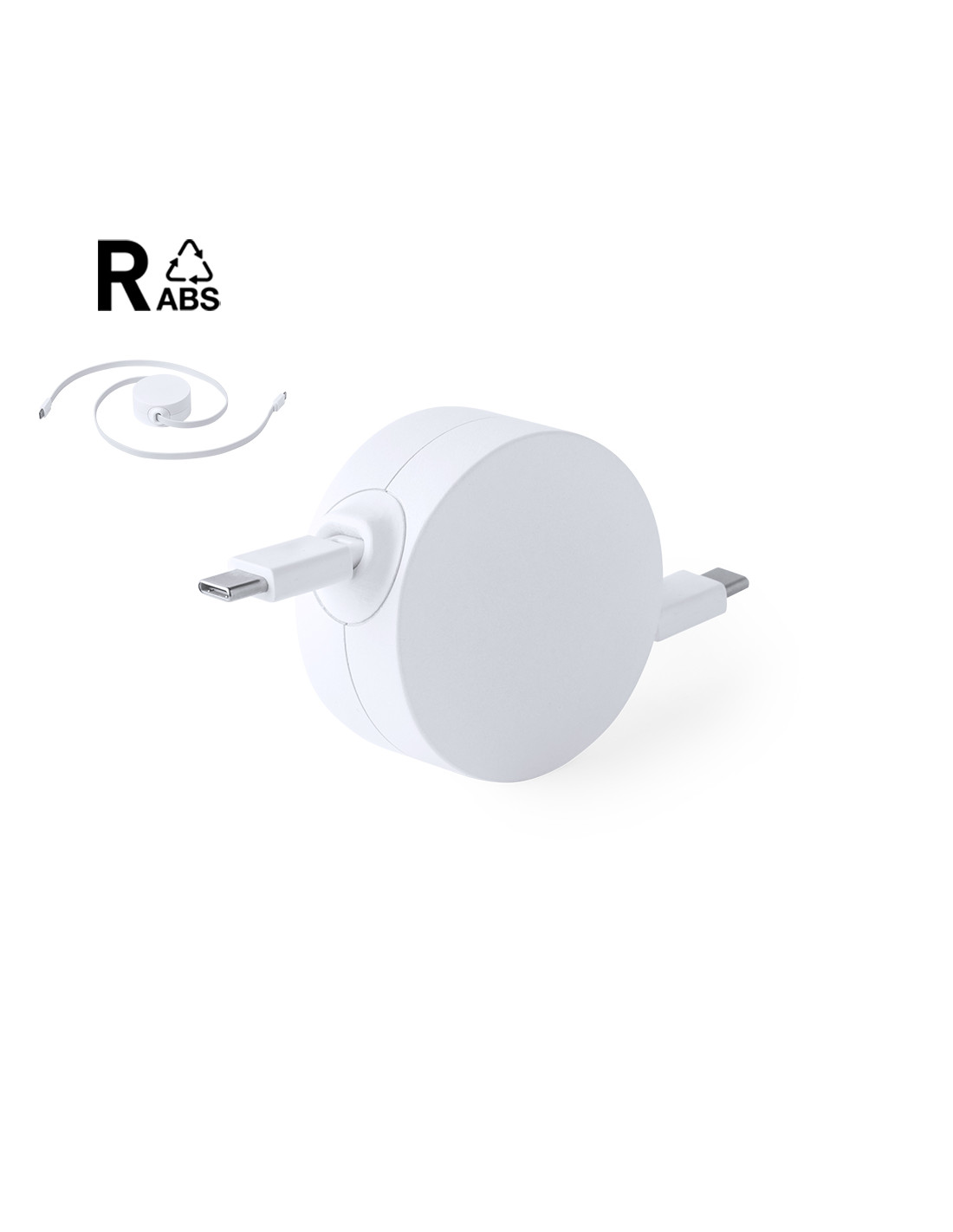 Cable cargador y sincronizador extensible, válido para cargar dispositivos y transferir datos. Fabricado en resistente RABS de color blanco. Pieza central con amplia zona de marcaje y mecanismo interior extensible. Incluidas conexiones de entrada y salida Tipo C. Presentado en bolsa individual de diseño kraft.El RABS es un plástico altamente reciclable de gran resistencia y con multitud de aplicaciones que lo convierten en una solución eco-friendly. Con certificación RCS, que garantiza el origen reciclado del mismo.