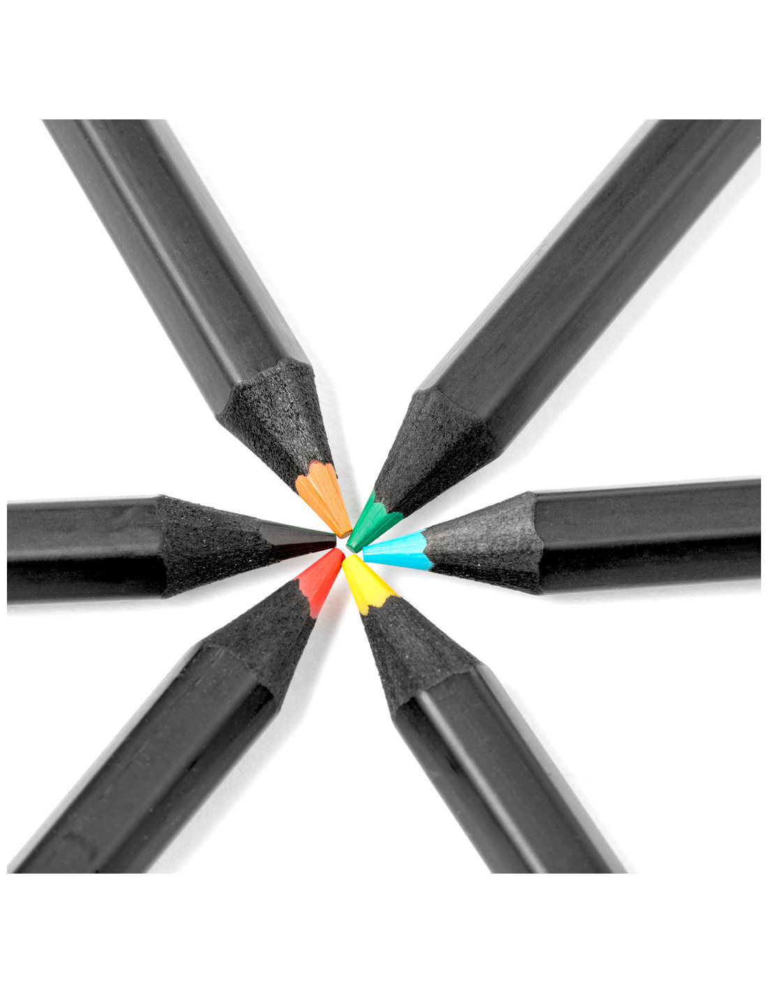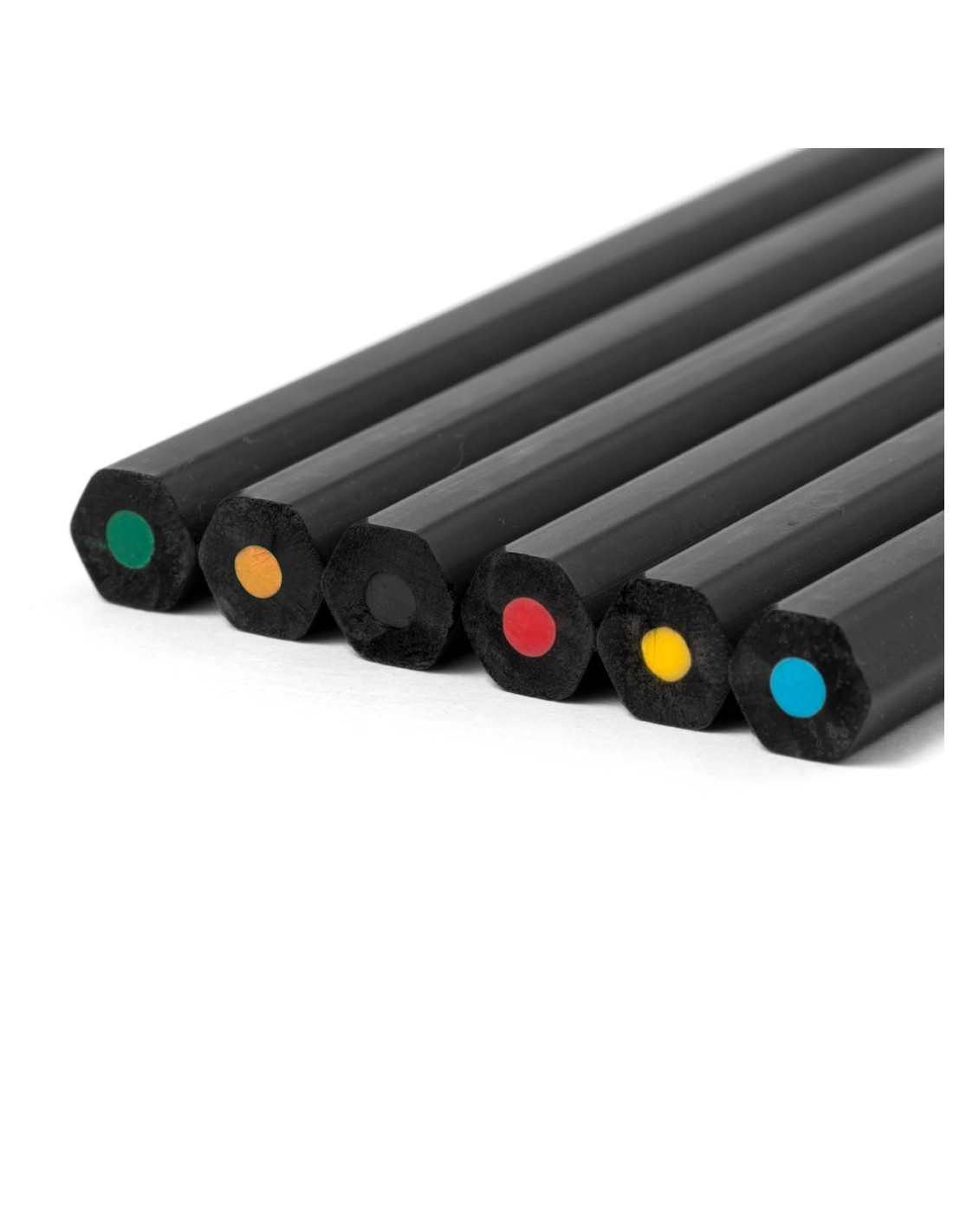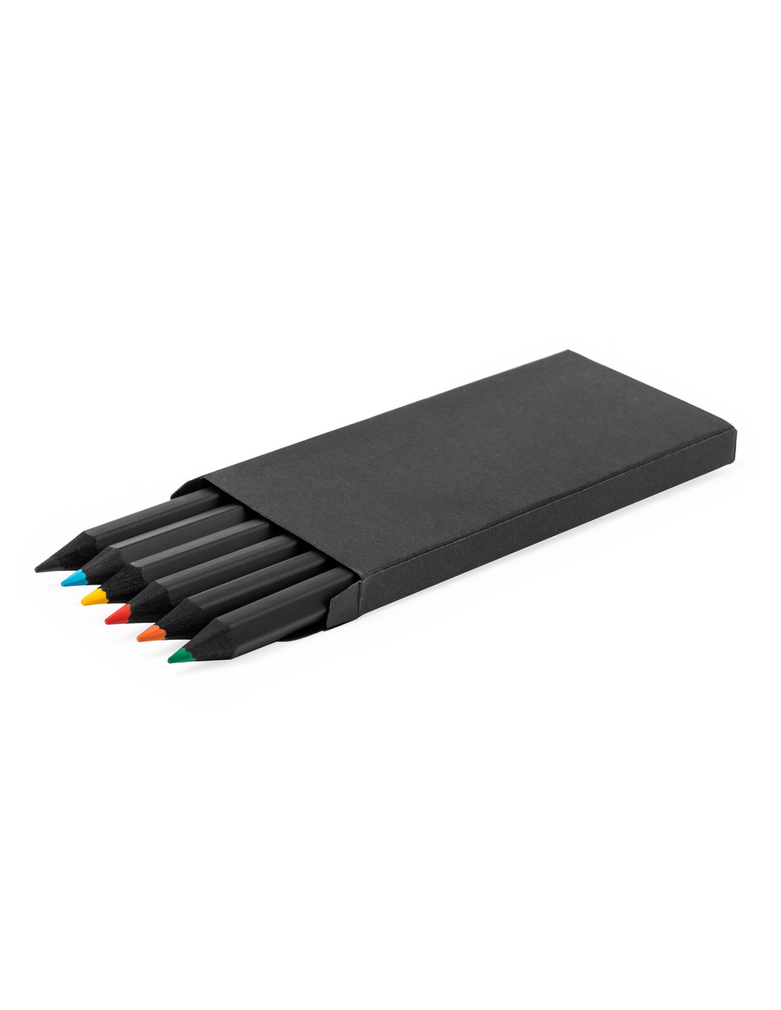 Set de 6 lápices de madera acabada en color negro, con cuerpo hexagonal y minas en varios colores. Presentados en estuche negro de cartón reciclado negro con cierre de solapa.