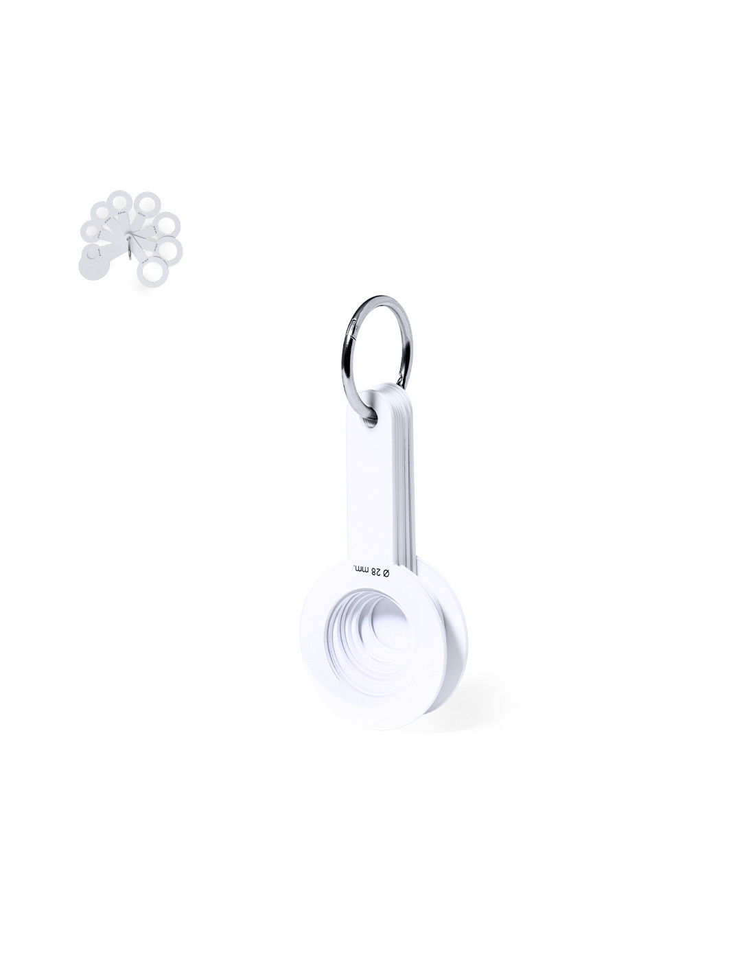 Calibrador manual fabricado en resistente PP. Para diá metros desde 14mm hasta 28mm, perfecto para la medición y clasificación a tiempo real y según tamaños. Cuenta con 8 plantillas que van aumentando gradualmente cada 2mm, una de ellas con superficie plana para marcaje. Unidos por una práctica anilla de transporte.