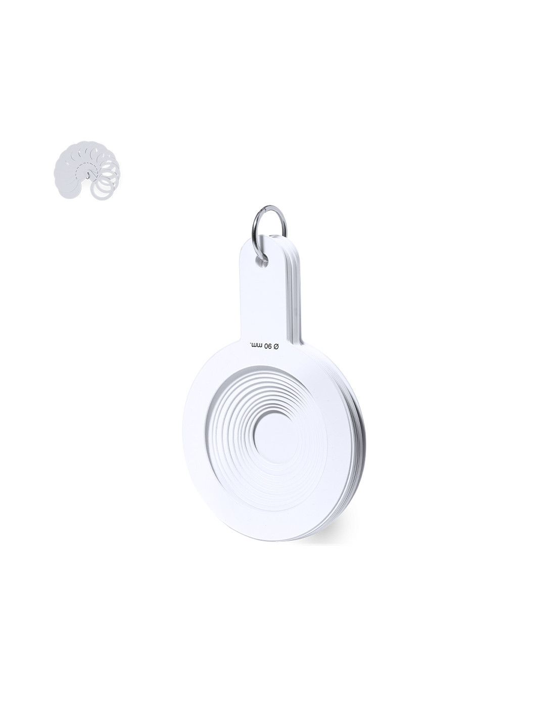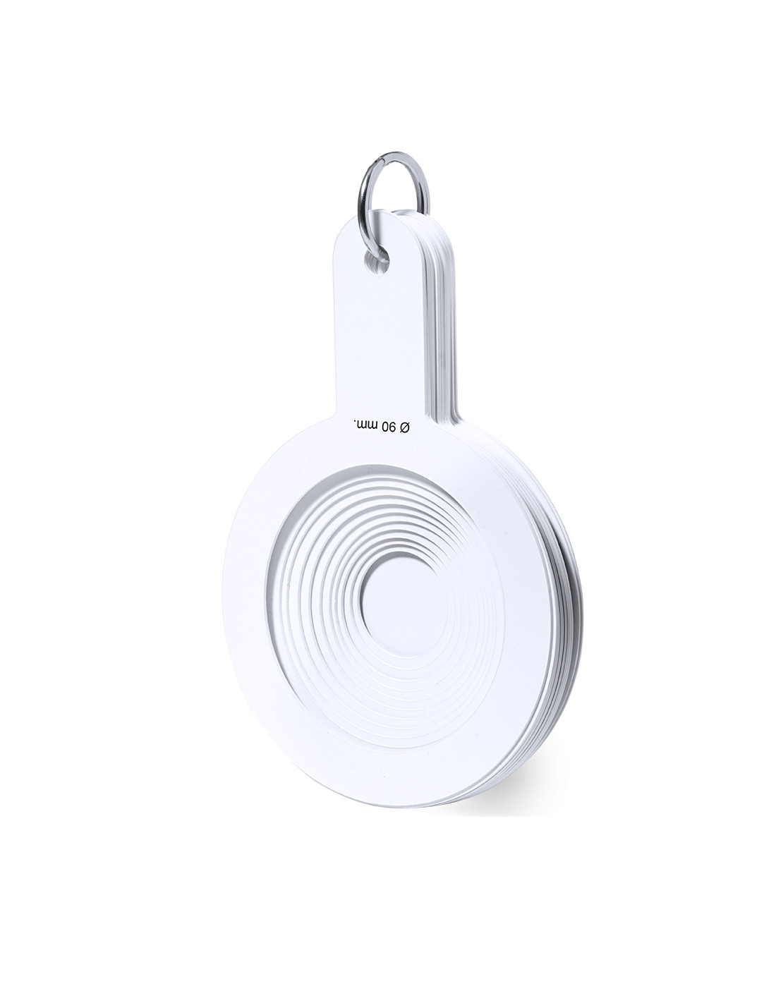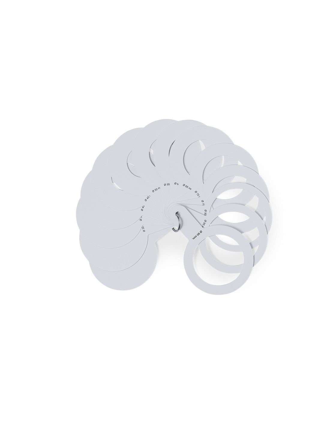 Calibrador manual fabricado en resistente PP. Para diá metros desde 30mm hasta 90mm, perfecto para la medición y clasificación a tiempo real y según tamaños. Cuenta con 8 plantillas que van aumentando gradualmente cada 2mm, una de ellas con superficie plana para marcaje. Unidos por una práctica anilla de transporte.