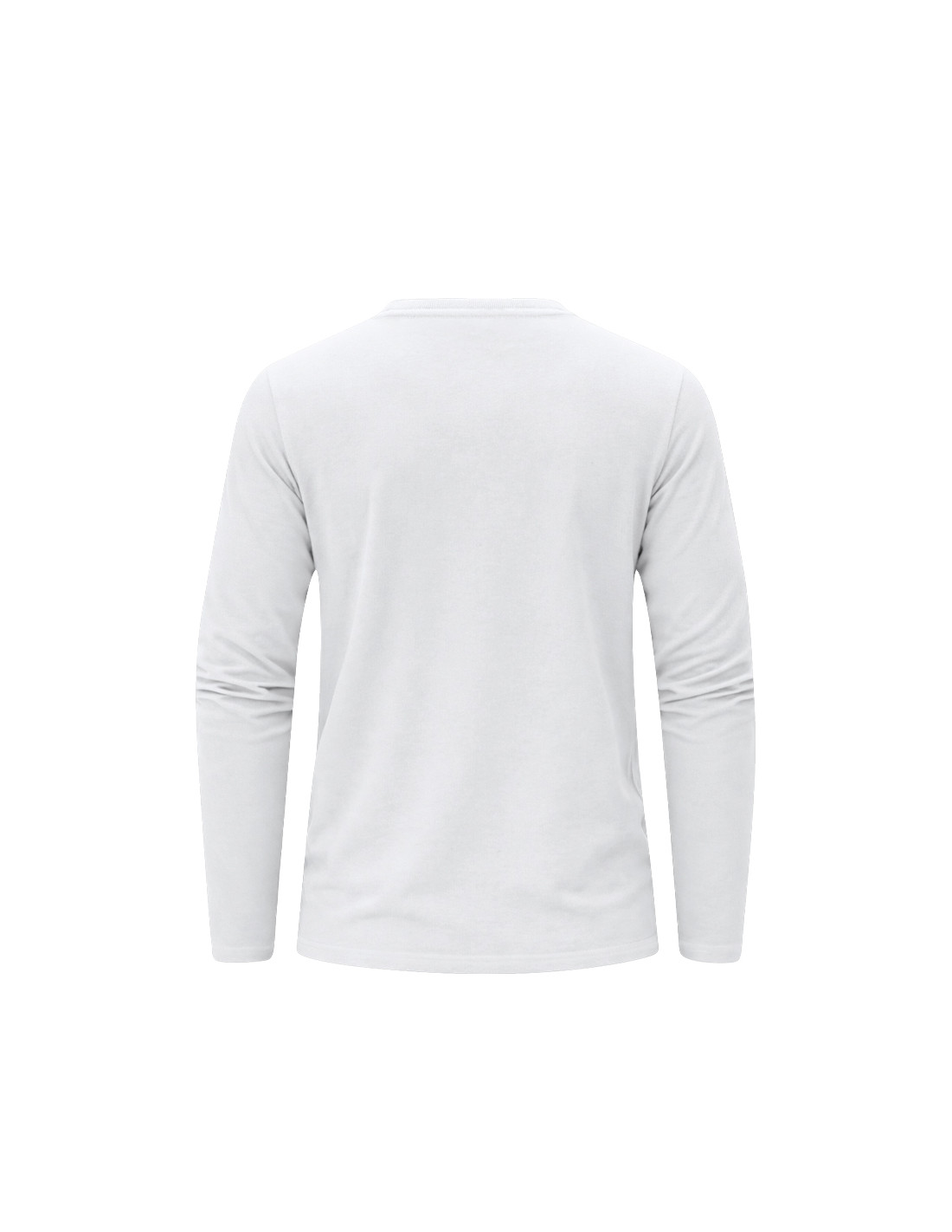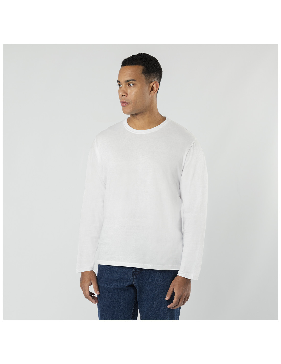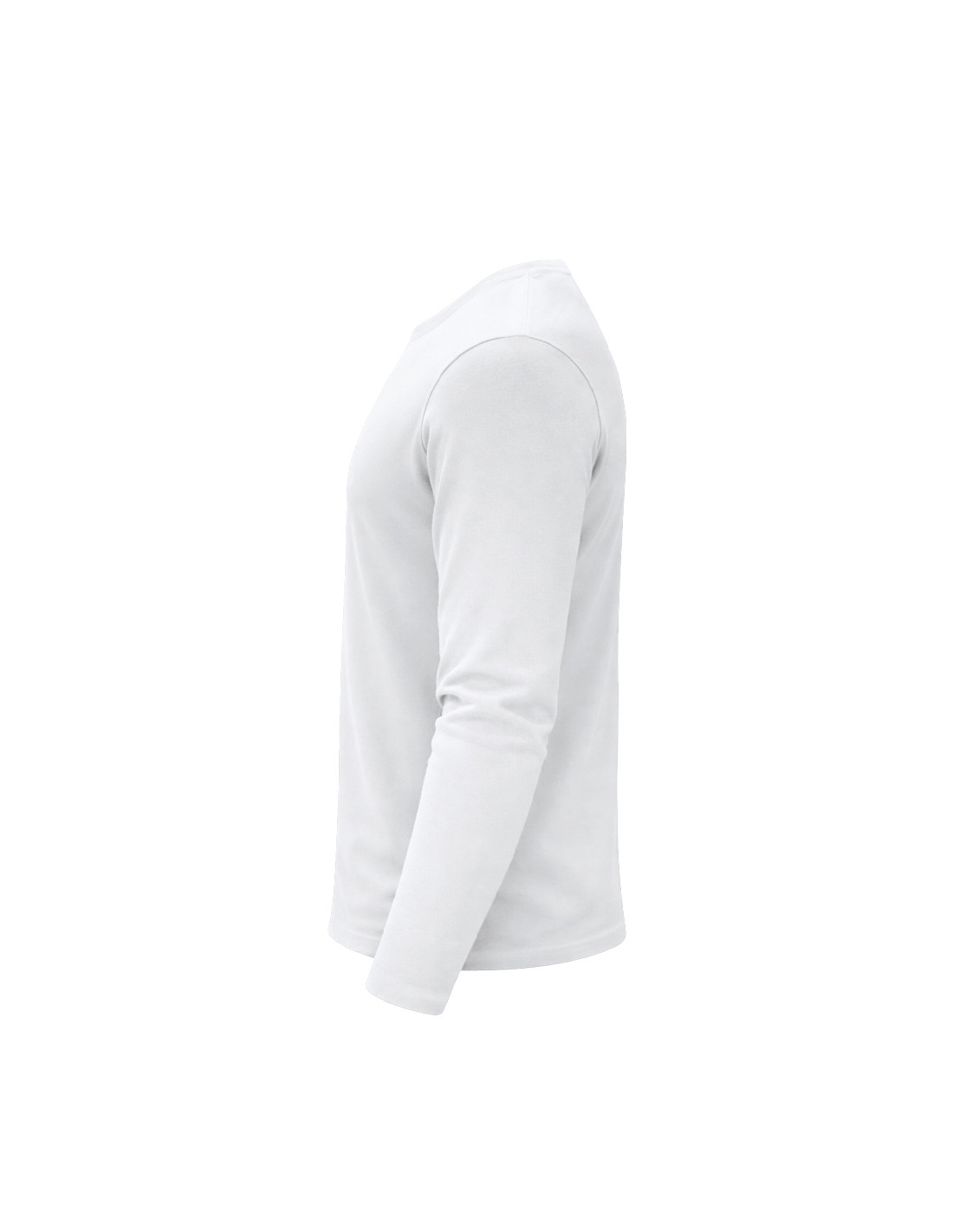 Camiseta de manga larga para adulto en color blanco de suave y agradable tacto en 100% algodón, punto liso de 160 g/m2. Confeccionada en tejido tubular, con cuello redondo acanalado 1x1 y con cubrecosturas reforzado a juego en color blanco.