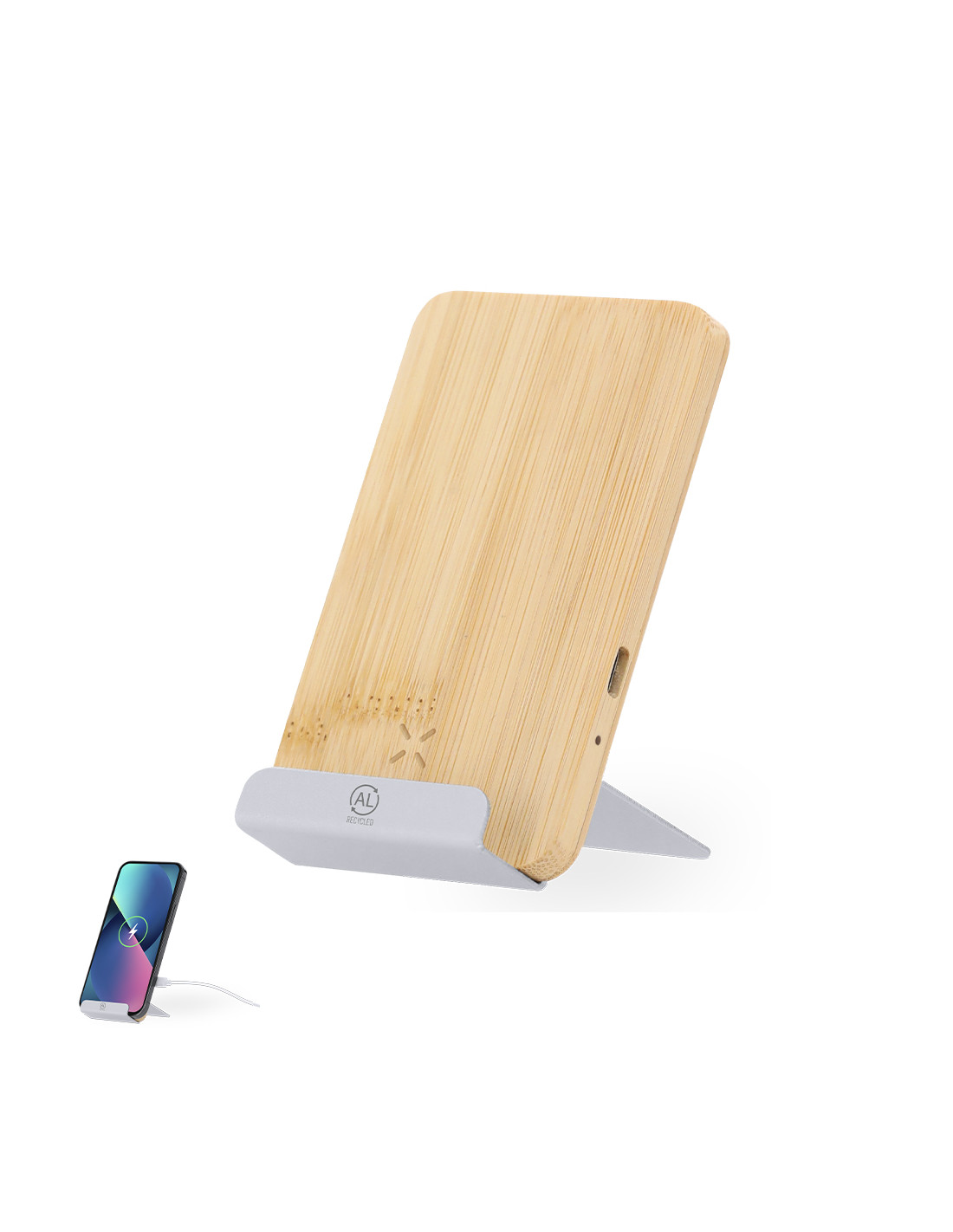 Cargador inalámbrico 15W con función soporte para smartphone fabricado en bambú y Aluminio Reciclado. Indicador LED de estado de carga y compatible con dispositivos equipados con tecnología de carga inalámbrica, incluye cable tipo C. Con distintivo aluminio reciclado.Materiales como el bambú fomentan la utilización de materias primas naturales reduciendo las emisiones contaminantes. Además, el bambú proviene de una planta de gran resistencia y versatilidad, con crecimiento y regeneración rápida, siendo una excelente alternativa al uso de madera tradicional.El aluminio reciclado es un material con posibilidades de reciclaje casi infinitas, sin perder sus propiedades originales y consumiendo menos energía en este proceso.Certificación GRS (Global Recycled Standard / Estándar de Reciclaje Global), que garantiza el origen reciclado del material usado para fabricar el producto.F