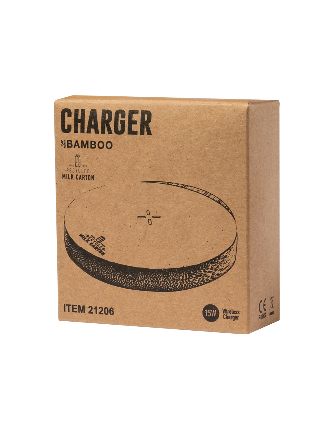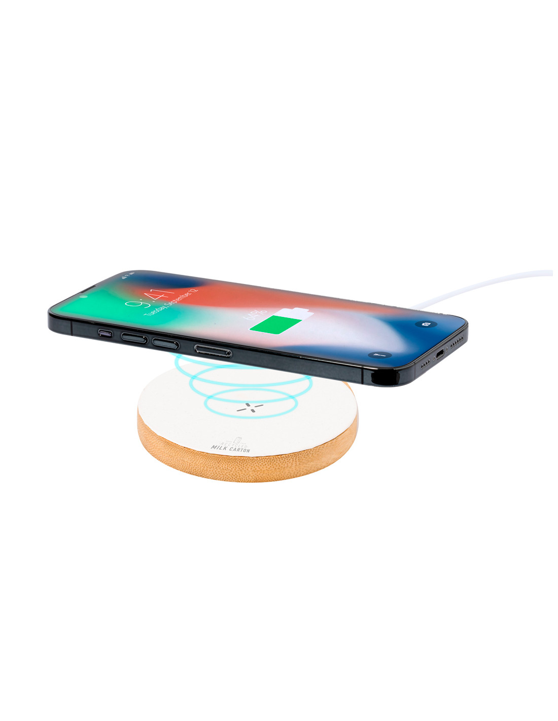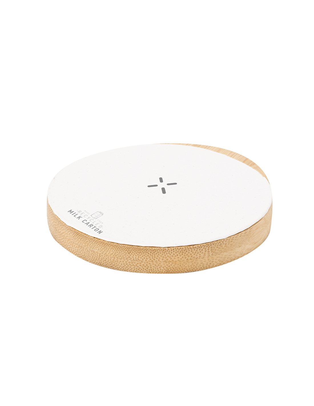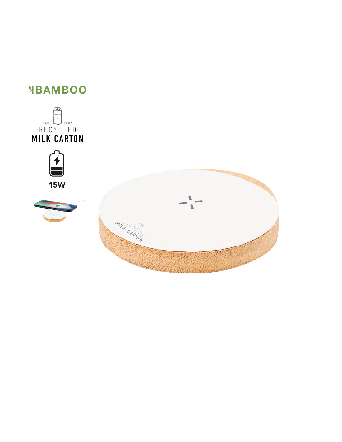 Cargador inalámbrico 15W de forma circular. Con superficie de carga en material reciclado a partir de cartones de leche y base fabricada en bambú, compatible con dispositivos equipados con tecnología de carga inalámbrica Qi. Cable cargador Tipo C incluido, con logotipo cartones de leche reciclados en base de carga. Base de bambú antideslizante y presentado en caja individual de diseño kraft. Con manual de instrucciones en español e inglés.Los cartones de leche se componen en su mayor parte de cartón y aluminio. Durante su proceso de reciclado, se separan los distintos materiales del envase para su reutilización y nuevo uso, contribuyendo así a recorrer el camino infinito de la economía circular. Este material se caracteriza por su alto grado de reciclabilidad, así como por su ligereza y resistencia.Materiales como el bambú fomentan la utilización de materias primas natural