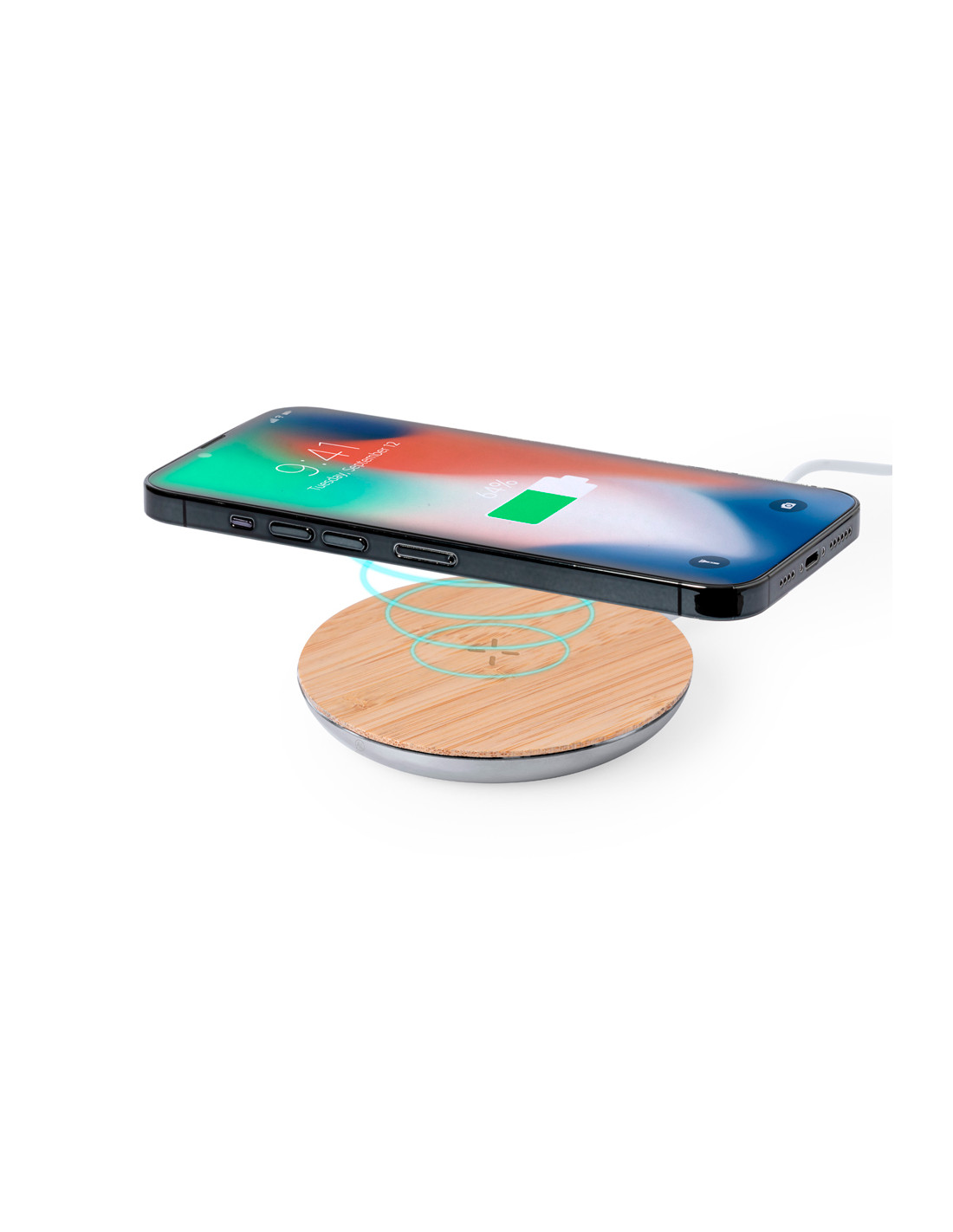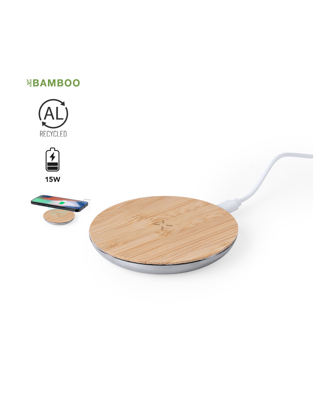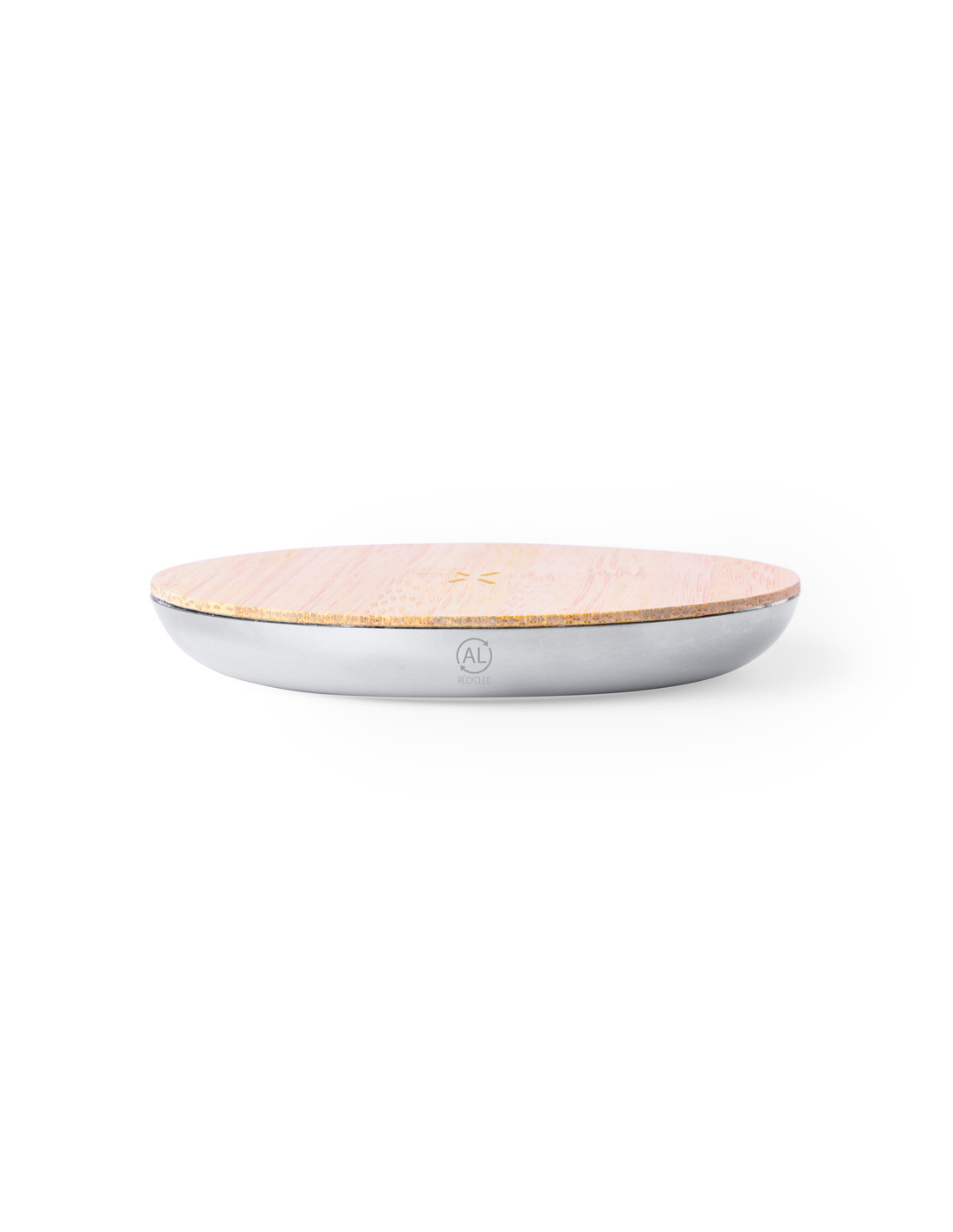 Cargador inalámbrico 15W de diseño circular, con cuerpo fabricado en Aluminio Reciclado y base de carga en bambú. Compatible con dispositivos equipados con tecnología de carga inalámbrica Qi, con cable de carga Tipo C incluido e indicador LED de estado de carga. Base antideslizante y presentado en caja individual de diseño kraft, con manual de instrucciones en español e inglés.Materiales como el bambú fomentan la utilización de materias primas naturales, reduciendo las emisiones contaminantes. Proviene de una planta de gran resistencia y versatilidad, con crecimiento y regeneración rápidos, siendo una excelente alternativa al uso de madera tradicional.El Aluminio Reciclado es un material con posibilidades de reciclaje casi infinitas, sin perder sus propiedades originales y consumiendo menos energía en este proceso.Certificación GRS (Global Recycled Standard / Estándar de R