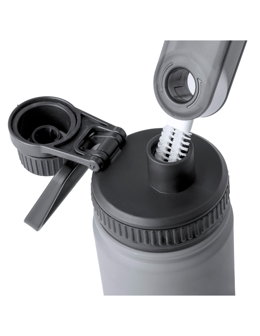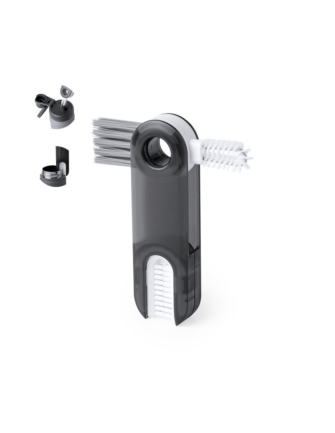 Práctico cepillo limpiador todo en uno, especialmente diseñado para bidones, termos, tazas, vasos y artículos similares. Incluye 3 cepillos con diferentes tipos de cerdas, ideales para la correcta limpieza de las partes de difícil acceso de los recipientes. Fabricado en resistente material ABS, con zona lisa para marcaje y presentado en caja individual de diseño kraft.