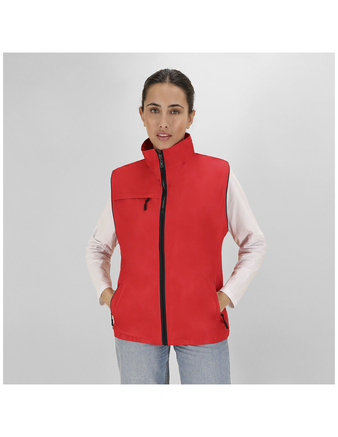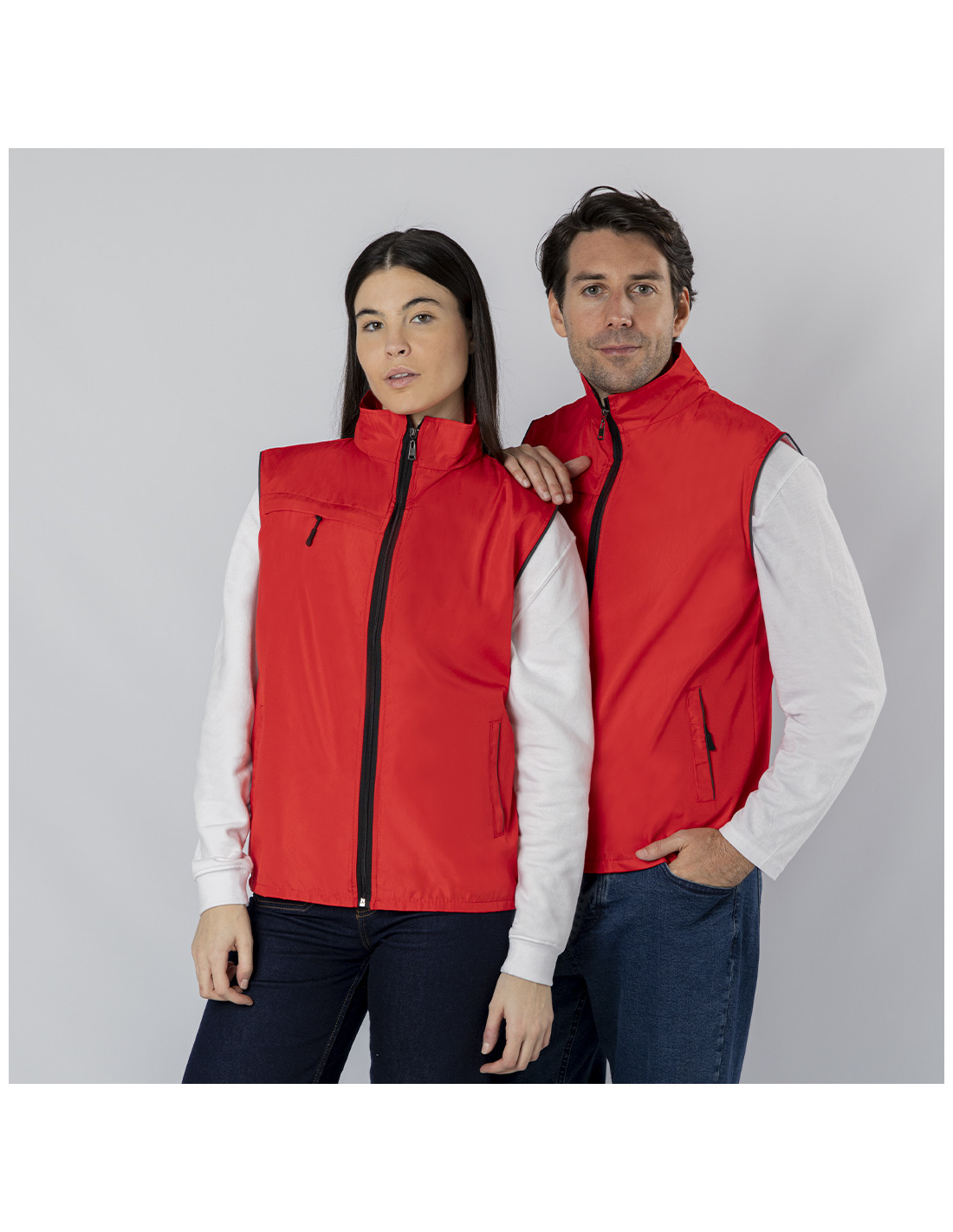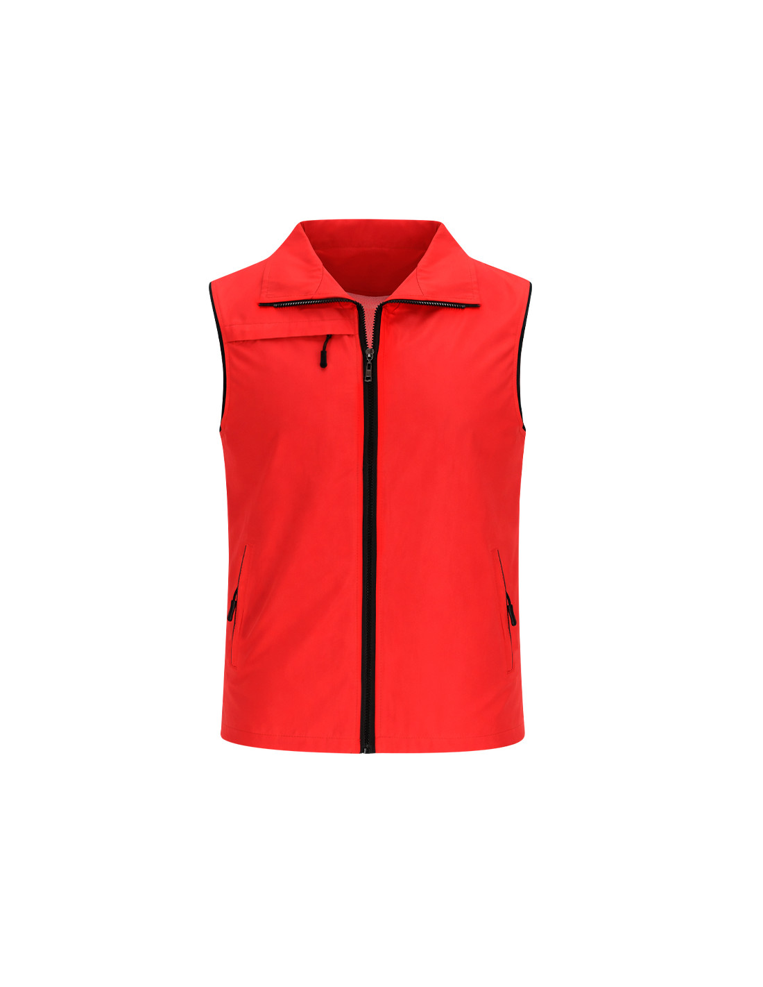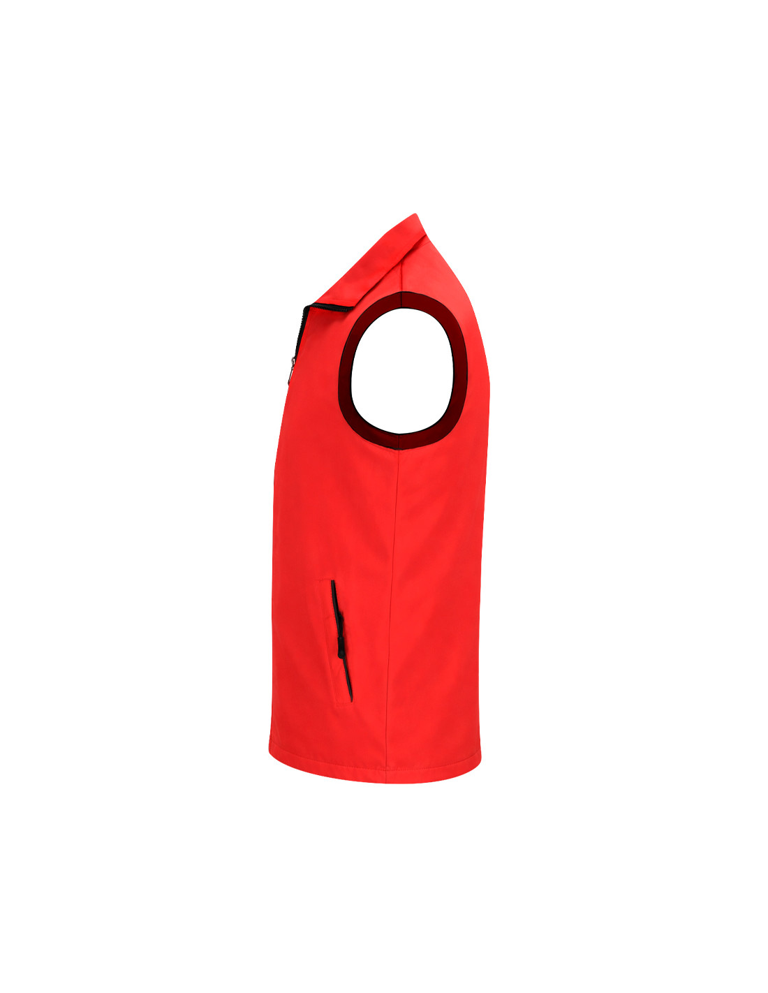 Chaleco Unisex de tejido ligero y transpirable con interior confeccionado en tejido de malla blanco. Con cremallera frontal negra y tirador plateado. Incluye un bolsillo exterior en el pecho derecho y dos bolsillos laterales con cremalleras y tiradores en color negro. Cuenta con media luna en el interior del cuello.