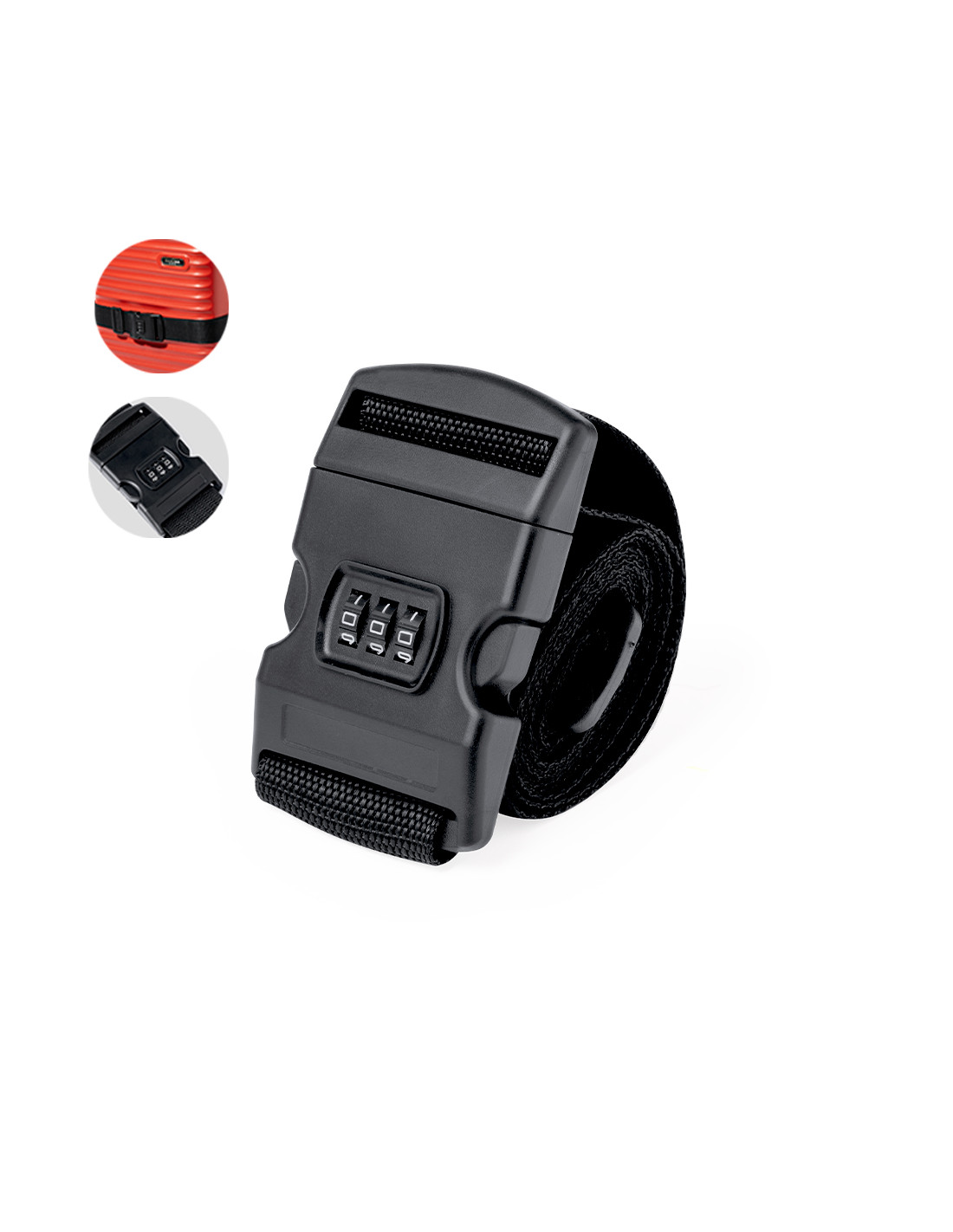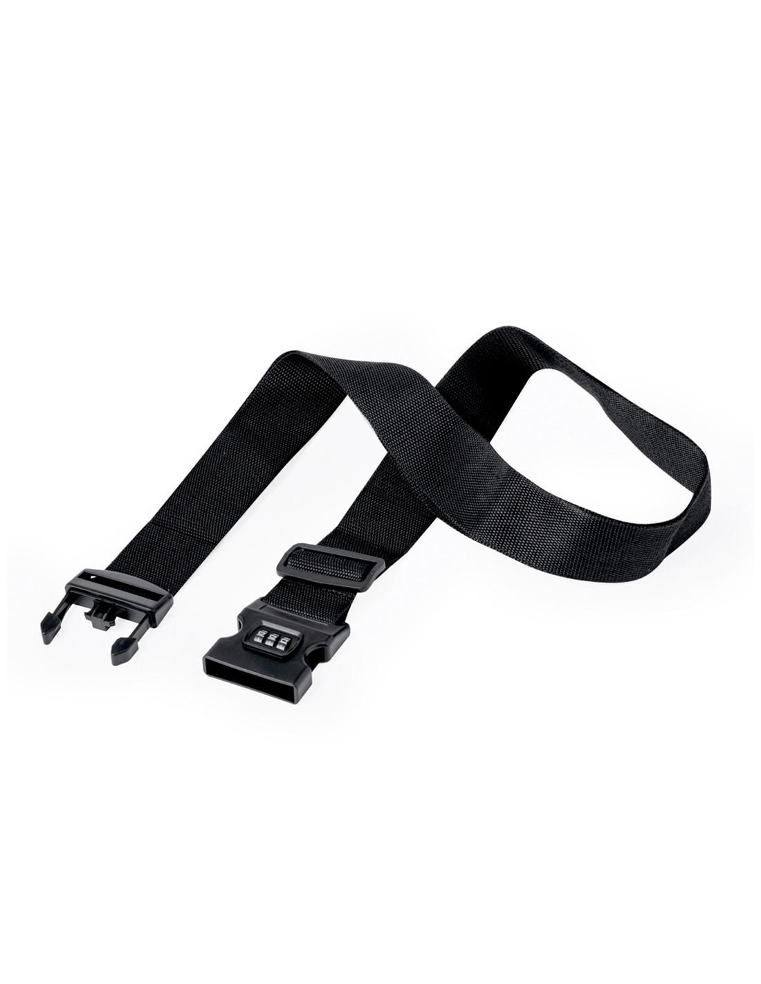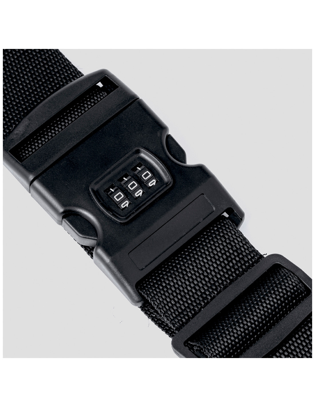 Cinta para maletas ajustable fabricada en resistente poliéster. Con cierre de hebilla ajustable y contraseña de 3 cifras. En discreto color negro y de 200cm de largo. Presentada en una bolsa individual de papel reciclado.