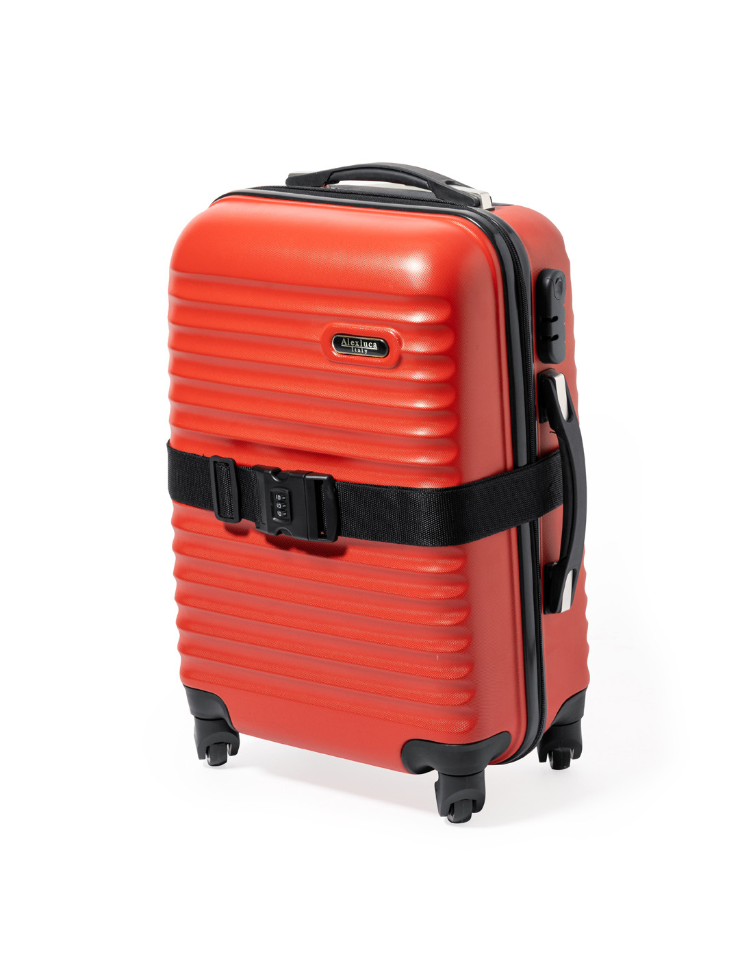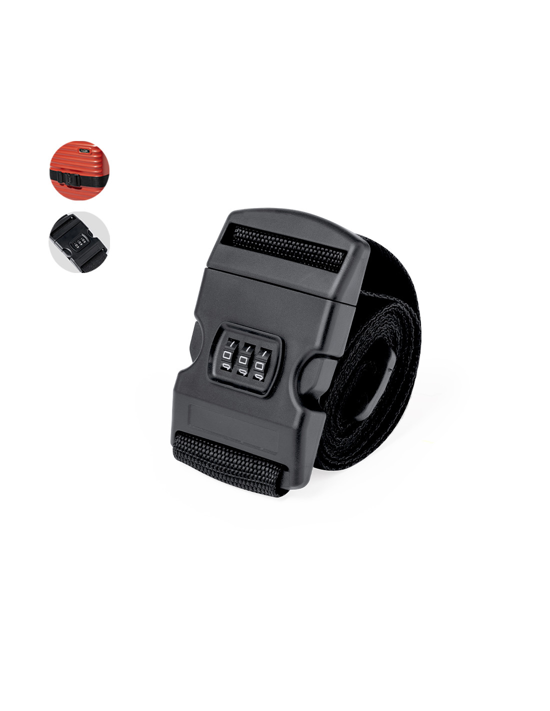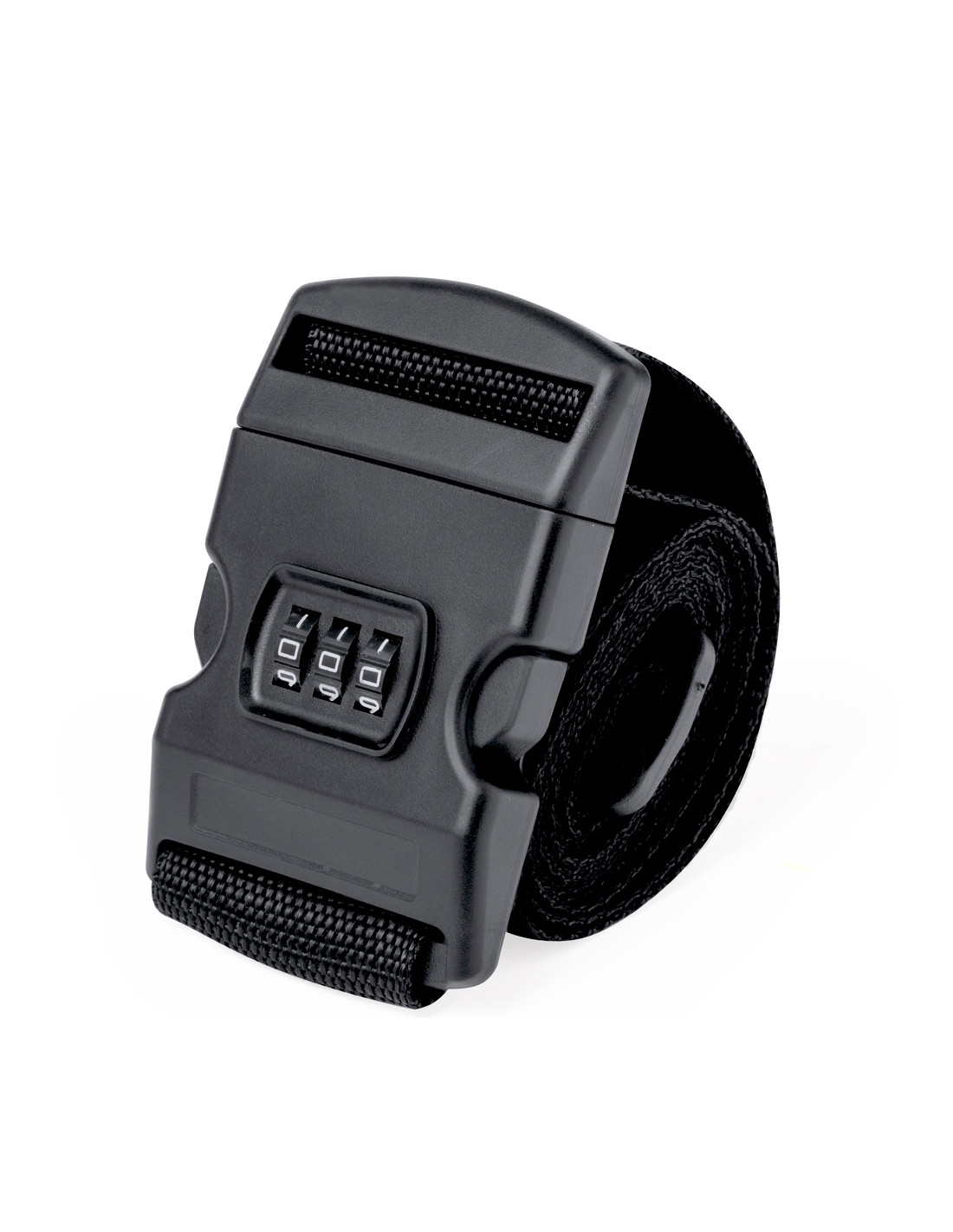 Cinta para maletas ajustable fabricada en resistente poliéster. Con cierre de hebilla ajustable y contraseña de 3 cifras. En discreto color negro y de 200cm de largo. Presentada en una bolsa individual de papel reciclado.