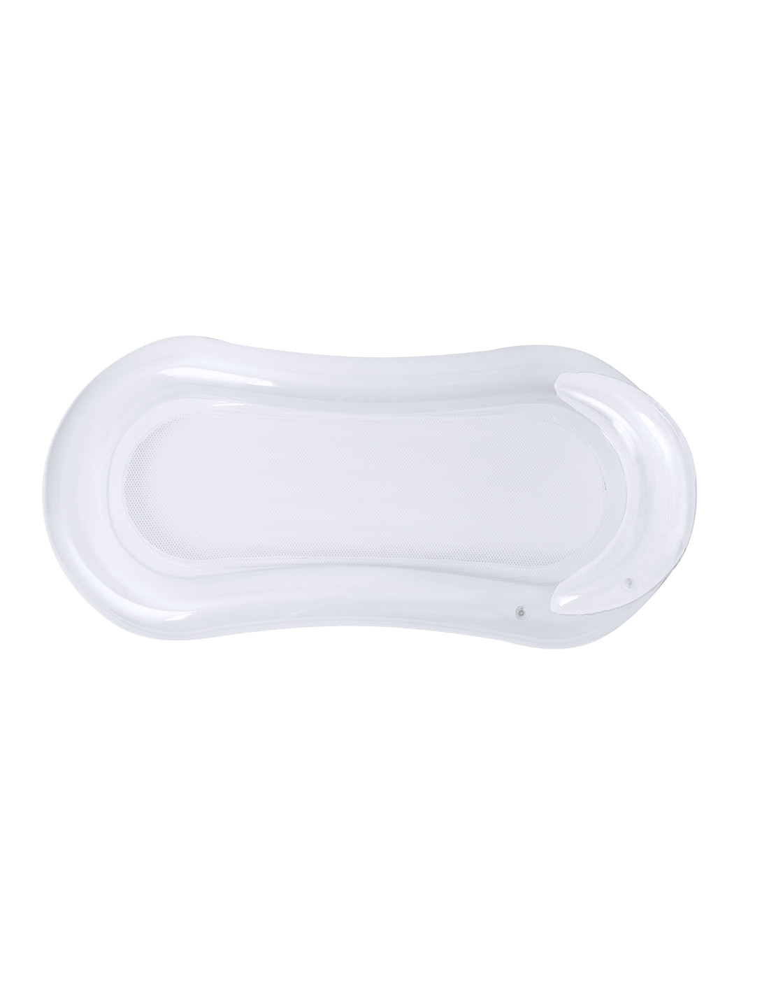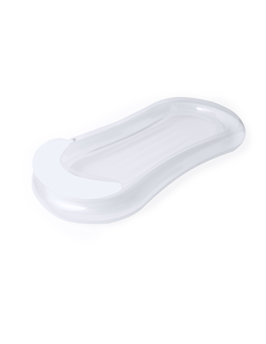 Original colchoneta en resistente PVC. Incluye una cómoda almohada para la cabeza, con diseño bitono, en colores transparente y blanco. Incluye una resistente redecilla central en poliéster de color blanco. Con plegado especial para fácil impresión. Se sirve desinflada y en una práctica bolsa individual reciclada.