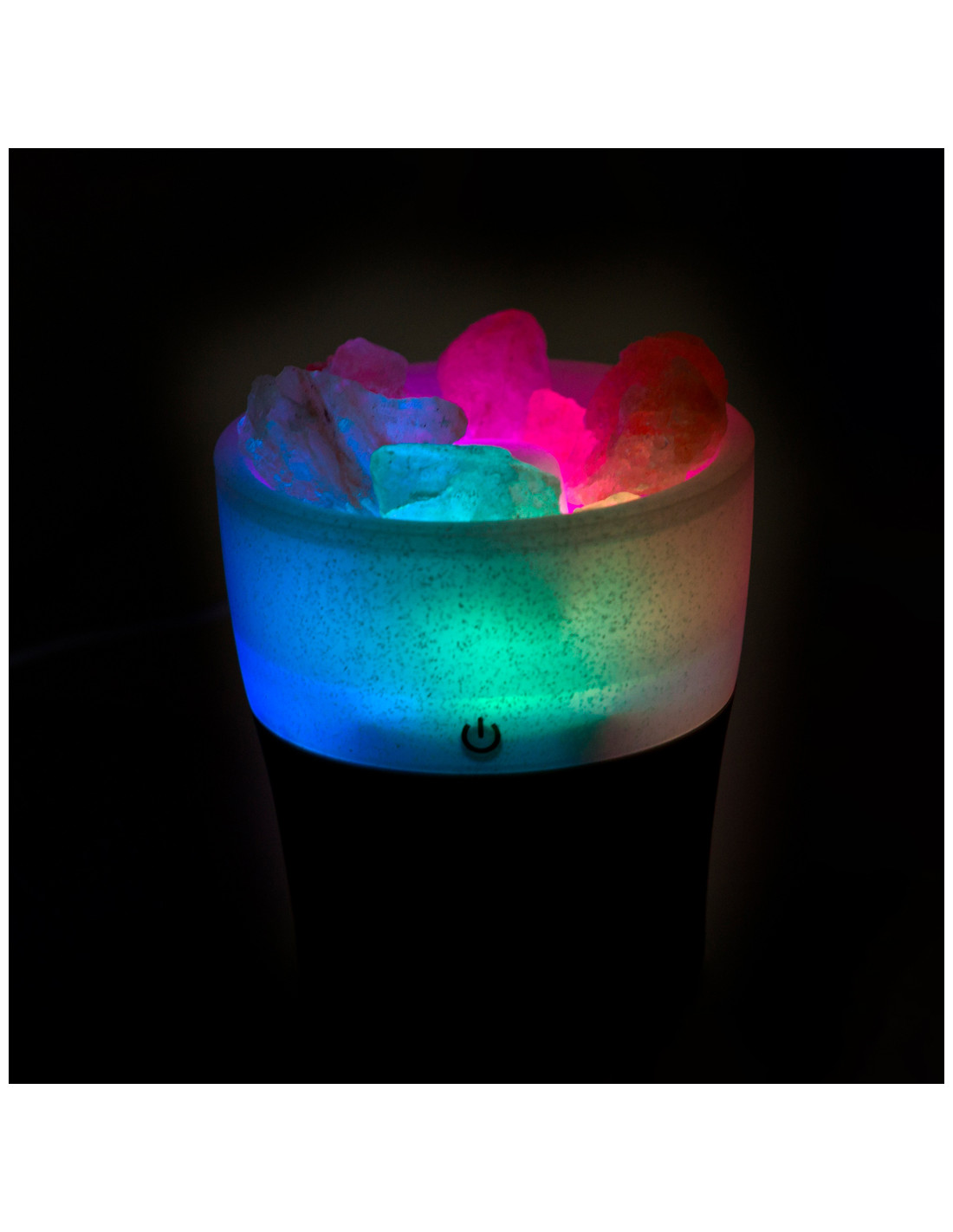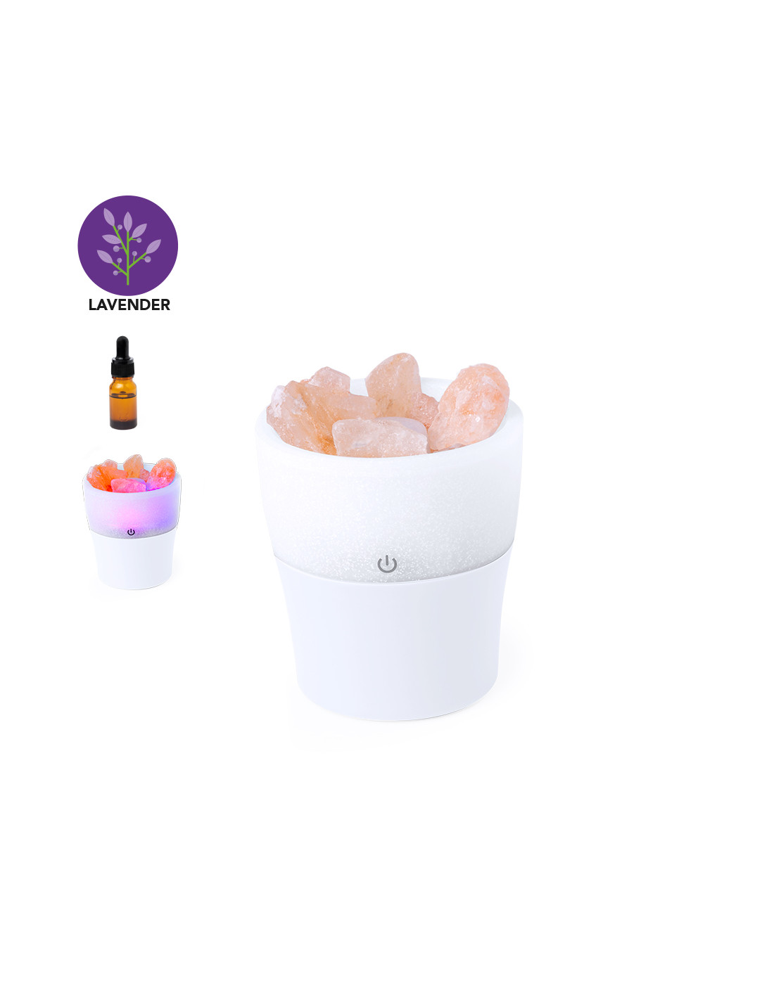 Elegante y decorativo humidificador con difusor aromático integrado con sal del Himalaya. Con luz led en iluminación multicolor y vaporización continua. Depósito de 150 ml, para uso en estancias de hasta 25m2, y cable de corriente USB. Incluye 10 ml de aroma a lavanda. Presentado en caja de diseño kraft.