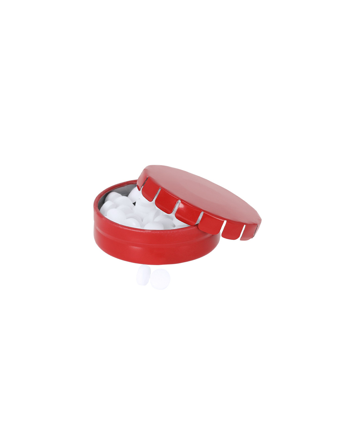Dispensador de caramelos de menta sin azúcar de 12 gr. En caja de metal con tapadera a presión.
