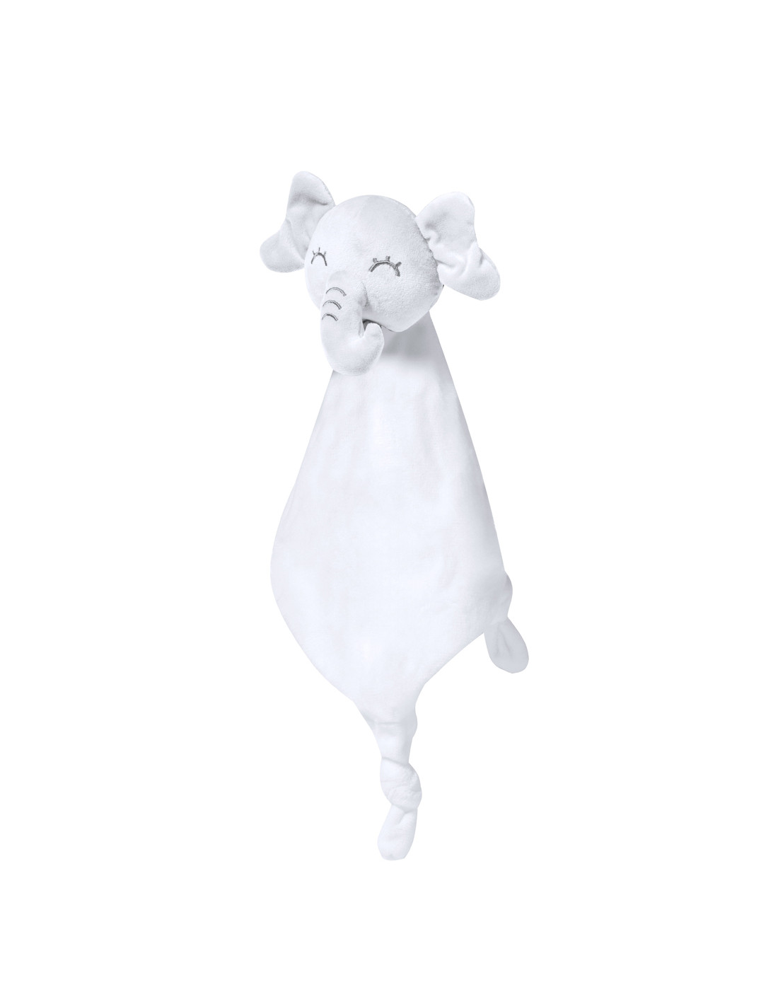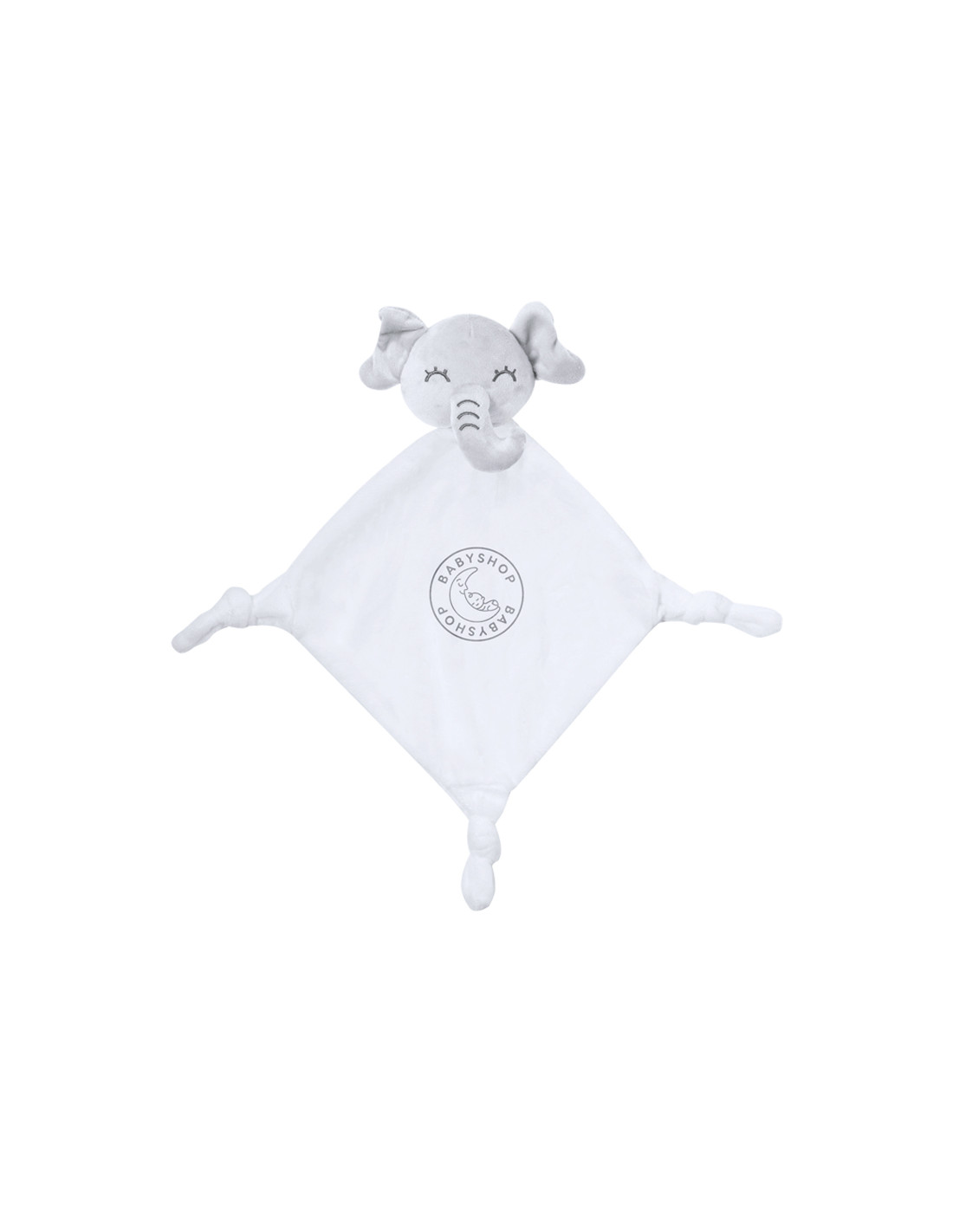 Tierno doudou con lindo diseño de elefante blanco. Con nudos en cada una de las 3 esquinas para estimular el sentido del tacto del bebé, facilitando la relajación. Fabricado en una única pieza de tela, para evitar que se separe en trozos más pequeños.
