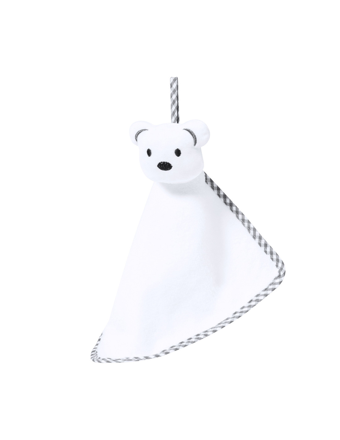 Tierno doudou con lindo diseño de osito blanco. Fabricado en una única pieza de tela, para evitar que se separe en trozos más pequeños. Con bordes reforzados en tela bicolor y práctica asa de transporte.