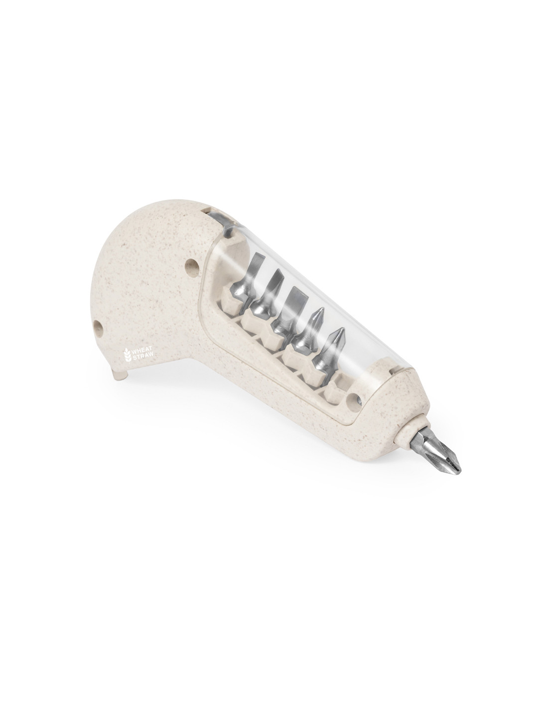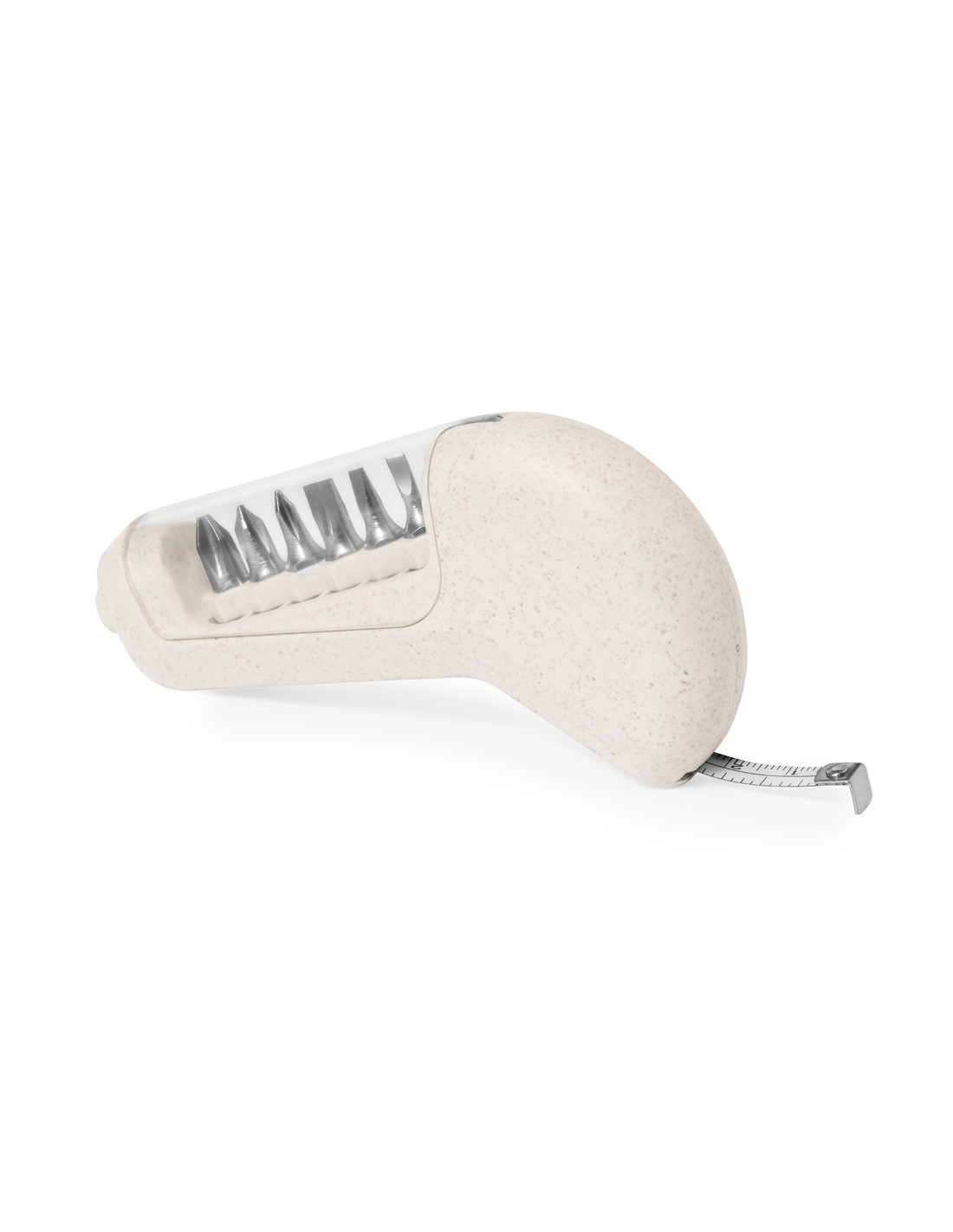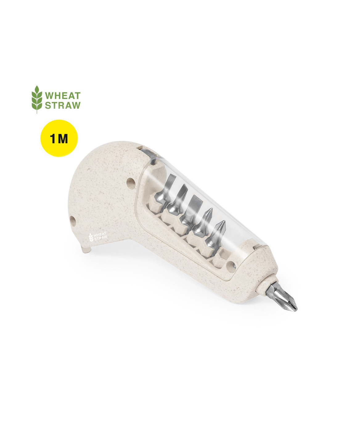 Práctico flexómetro multiherramienta, fabricado en caña de trigo. Esta herramienta versátil ofrece 6 funciones en las que incluye: metro en pulgadas y centí metros (longitud de 1 metro) y función destornillador con 3 puntas planas y 3 philips, todas guardadas en la empuñadura con ventana transparente. Con logotipo caña de trigo incluido. Presentado en caja individual.La caña de trigo fomenta la utilización de materias primas naturales, reduciendo así las emisiones contaminantes.
