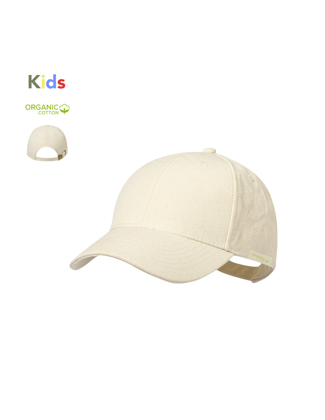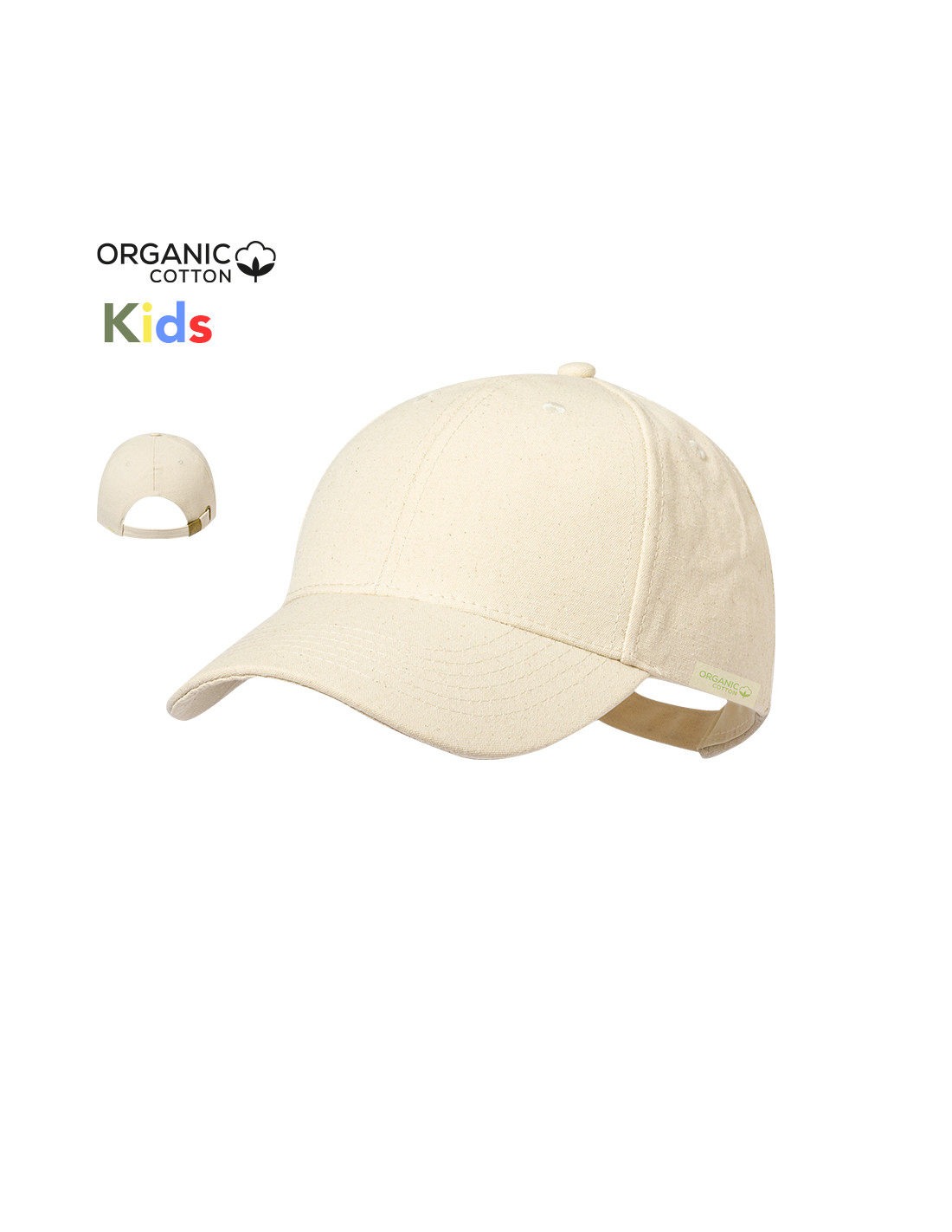 Gorra para niño de 6 paneles en 100% Algodón Orgánico. Cierre ajustable de hebilla metálica en color bronce. Etiqueta en interior con logo Algodón Orgánico.