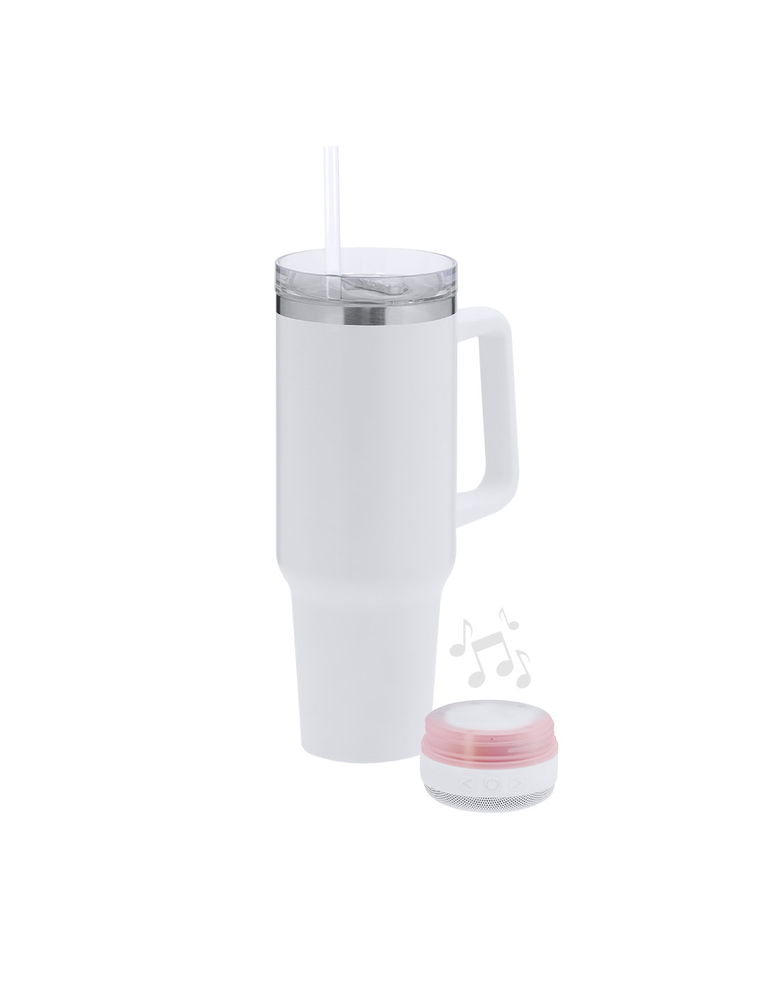 Taza térmica con Altavoz Bluetooth 5.3 de 3W integrado. Con 1,25L de capacidad, asa ergonómica y fabricado en acero inoxidable de doble pared, asegurando una durabilidad máxima y un excelente mantenimiento de la temperatura de las bebidas, ya sean frías o calientes. Es ideal para tener en tu escritorio, mesa o en cualquier superficie donde disfrutar tranquilamente de tu bebida favorita. La tapadera cuenta con un cierre a presión y un dosificador de fácil apertura, libre de BPA, garantizando seguridad y facilidad de uso. Cuenta con base antideslizante, a juego, que proporciona una mayor estabilidad. El altavoz Bluetooth integrado en la base de la taza es fácilmente extraíble gracias a su sistema de rosca, e incluye iluminación inteligente LED RGB, que se sincroniza al ritmo de la música, creando una experiencia visual y auditiva única. Además, la función manos libres permite