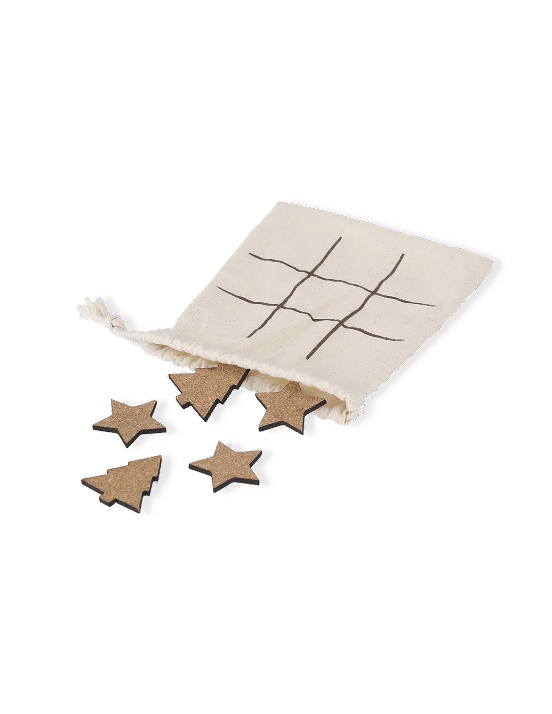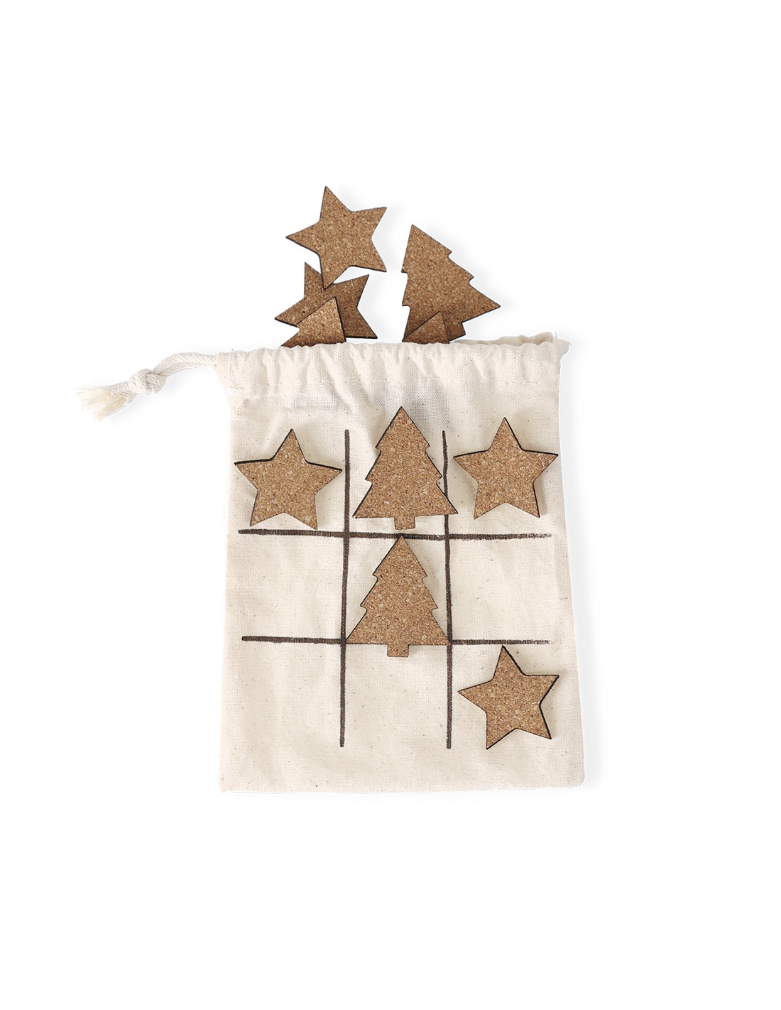 Juego de tres en raya fabricado en corcho natural. Incluye 5 fichas con forma de árbol y 5 fichas con forma de estrella. Presentado en bolsa de algodón con cierre de cordón, facilitando su almacenamiento y convirtiéndose en tablero de juego.Elaborado con elementos vegetales para así fomentar la utilización de materias primas naturales y reducir las emisiones contaminantes.
