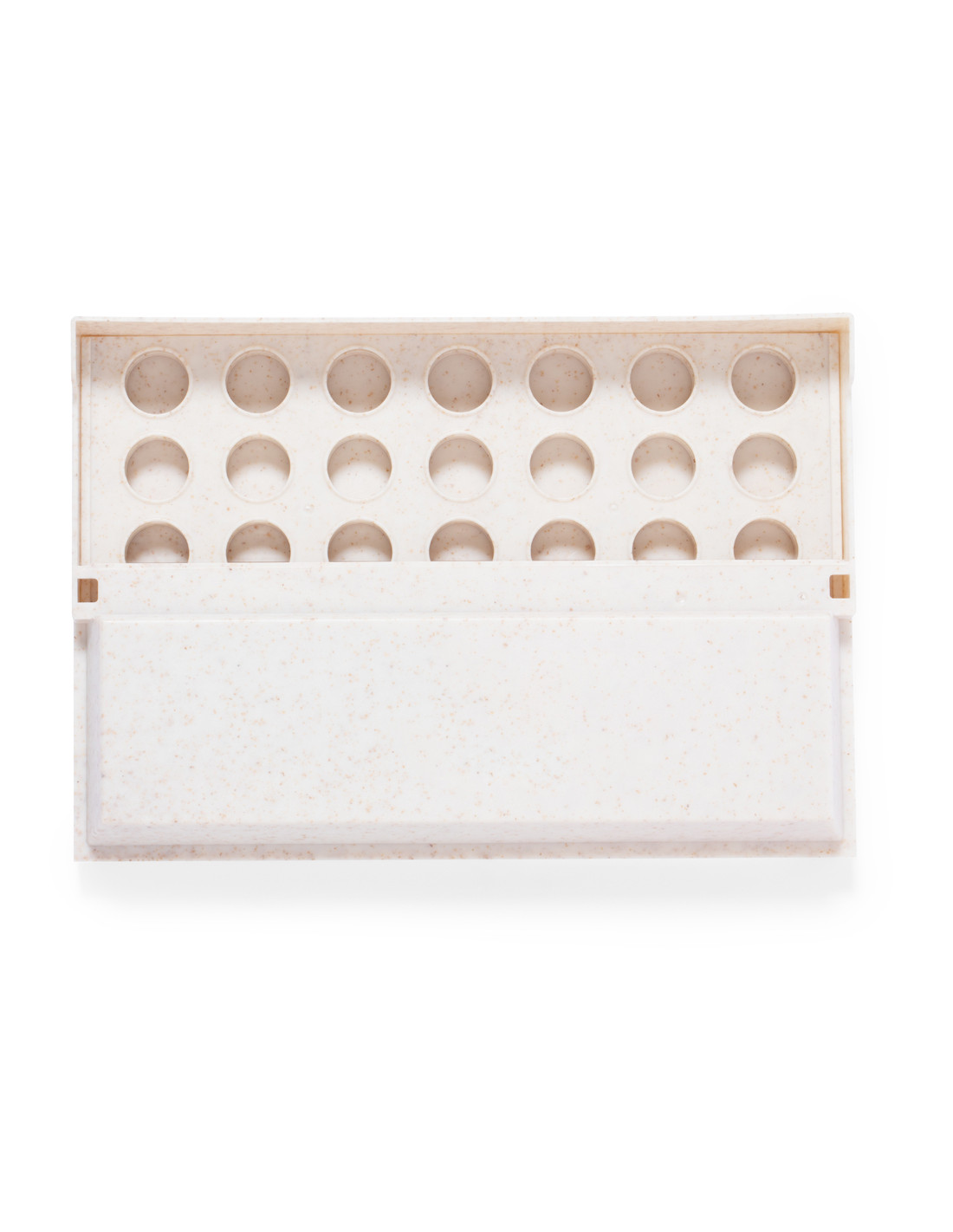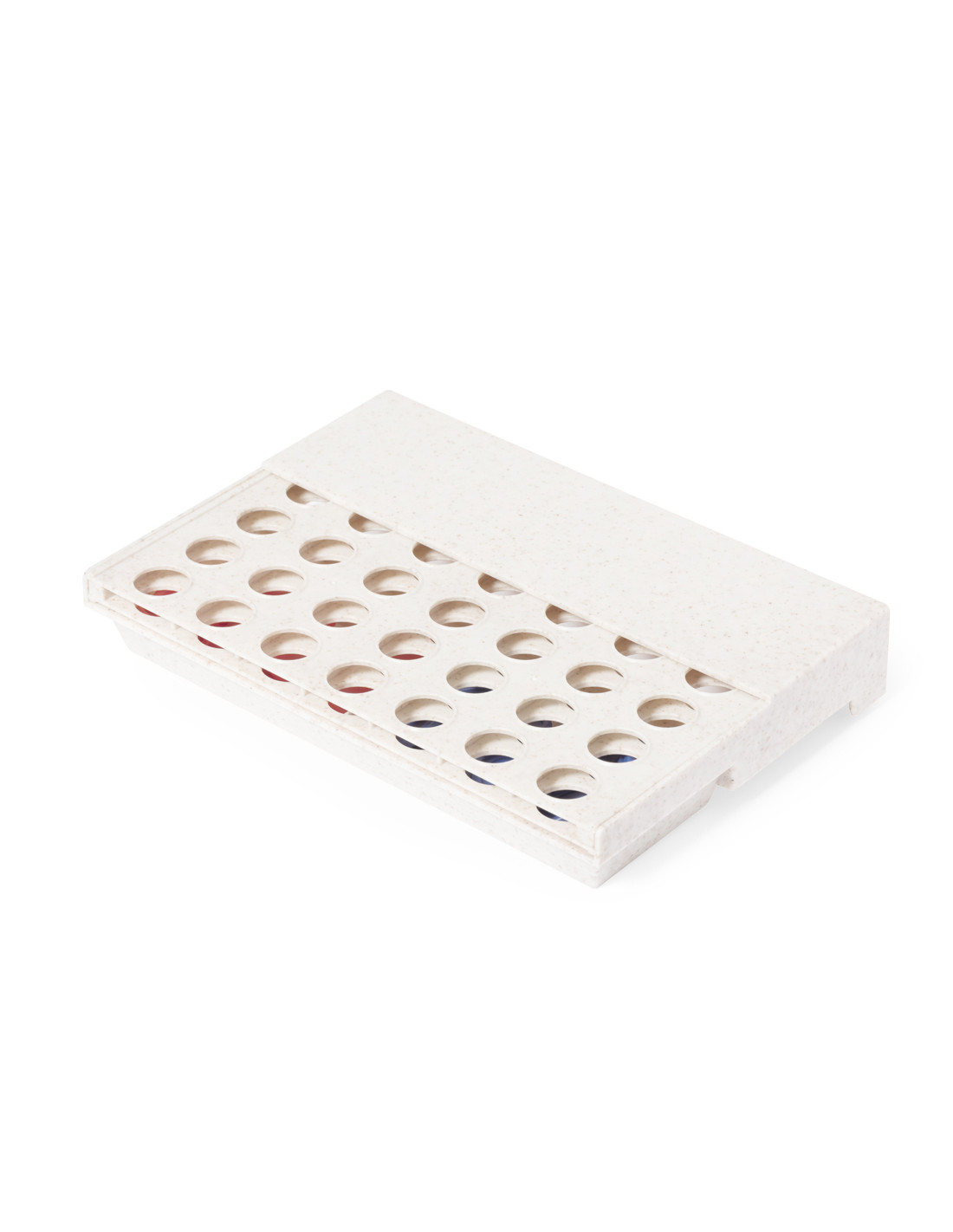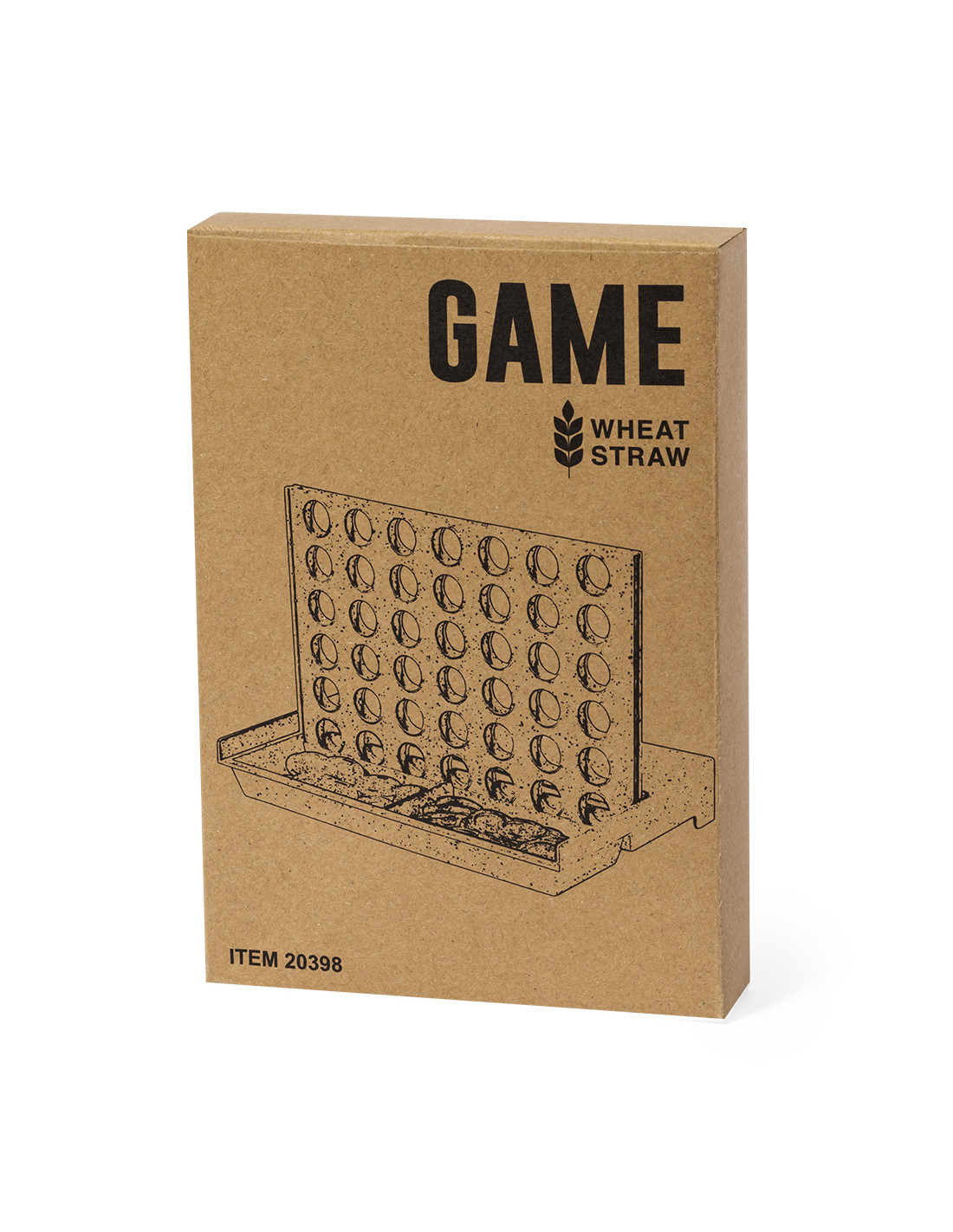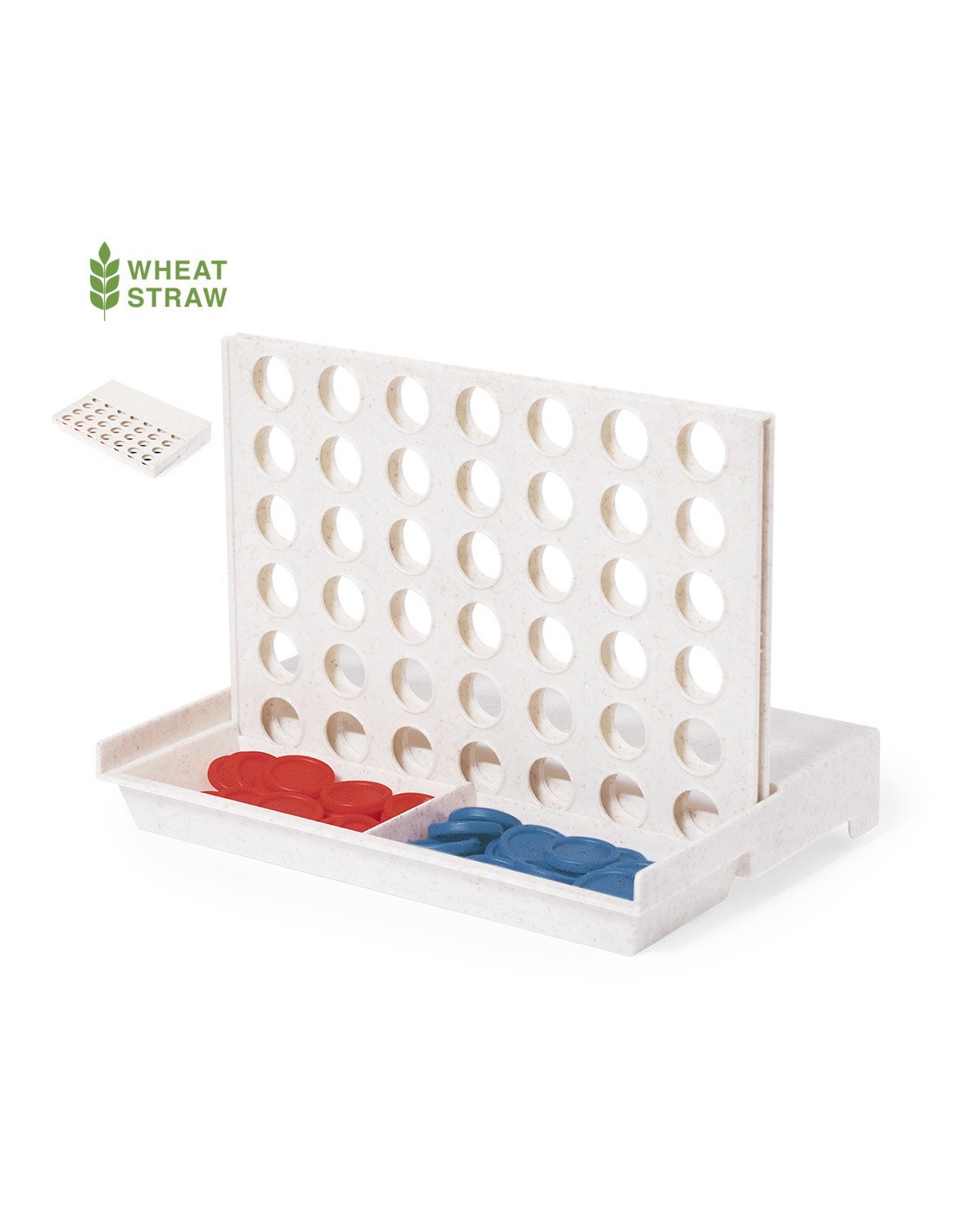 Divertido juego de mesa fabricado en caña de trigo. Compuesto por un tablero vertical y 42 piezas circulares (21 rojas y 21 azules). Emoción para todas las edades introduciendo las fichas por las ranuras para conseguir 4 fichas en 1 misma fila. Fácil de montar por su tablero móvil pudiendo desplegar o plegar. Presentado en caja de diseño kraft.