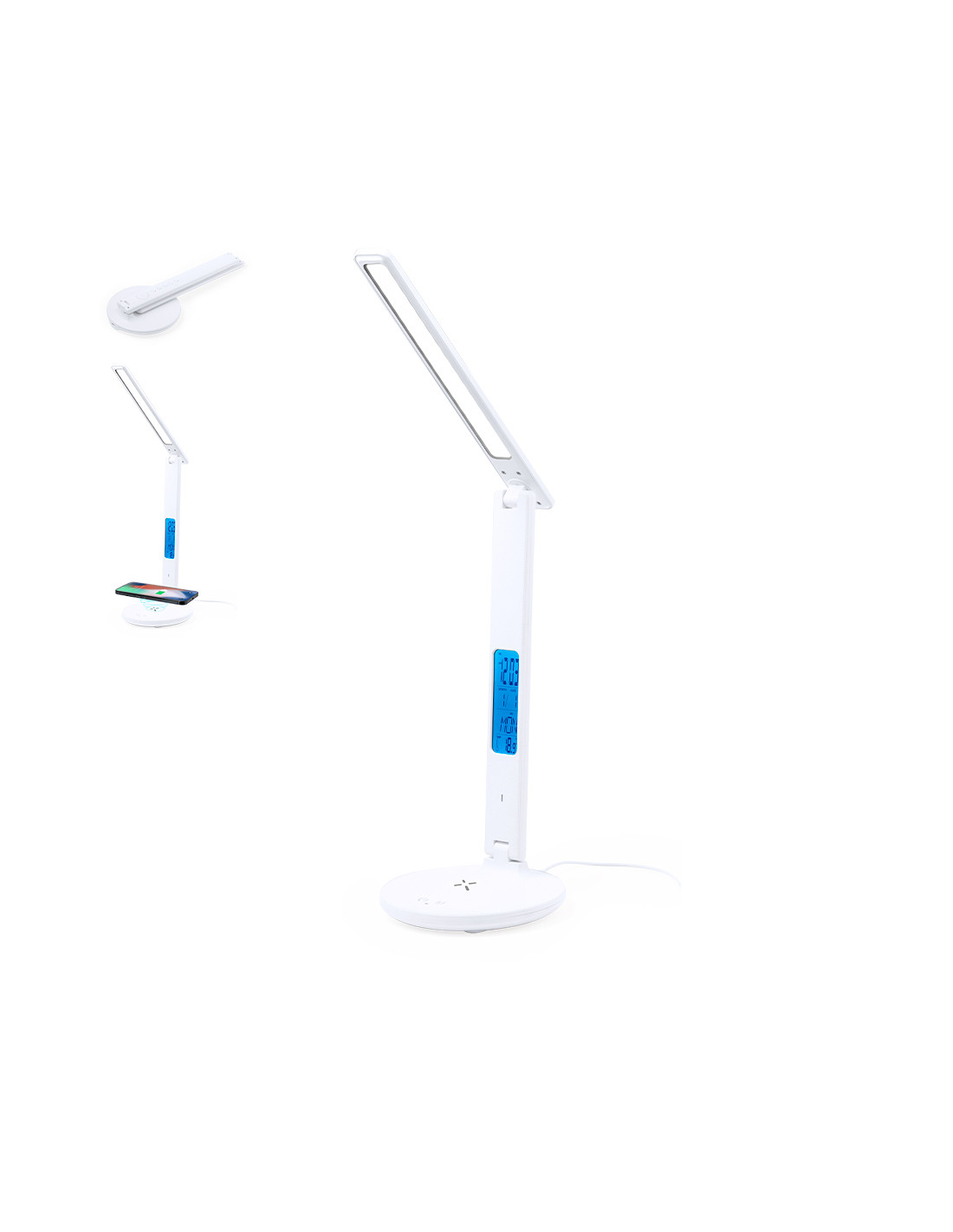 Lámpara multifunción plegable todo en uno, fabricada en resistente ABS blanco con acabado imitación piel. Provisto de 60 LEDs y 3 posiciones de iluminación (cálida, fría y media), con intensidad de luz regulable mediante el botón táctil de la base. Extensible y fácil de orientar, con pantalla de LCD integrada y retroiluminada, que marca hora, fecha, día y temperatura. Con botones de ajuste en la parte trasera y pila de botón incluida para guardar los datos. Incluye un cargador inalámbrico 10W integrado en la base, con entrada Tipo C y compatible con dispositivos móviles de carga inalámbrica. Con cable cargador Tipo C, y manual de instrucciones en español e inglés. Presentada en una atractiva caja de diseño kraft.