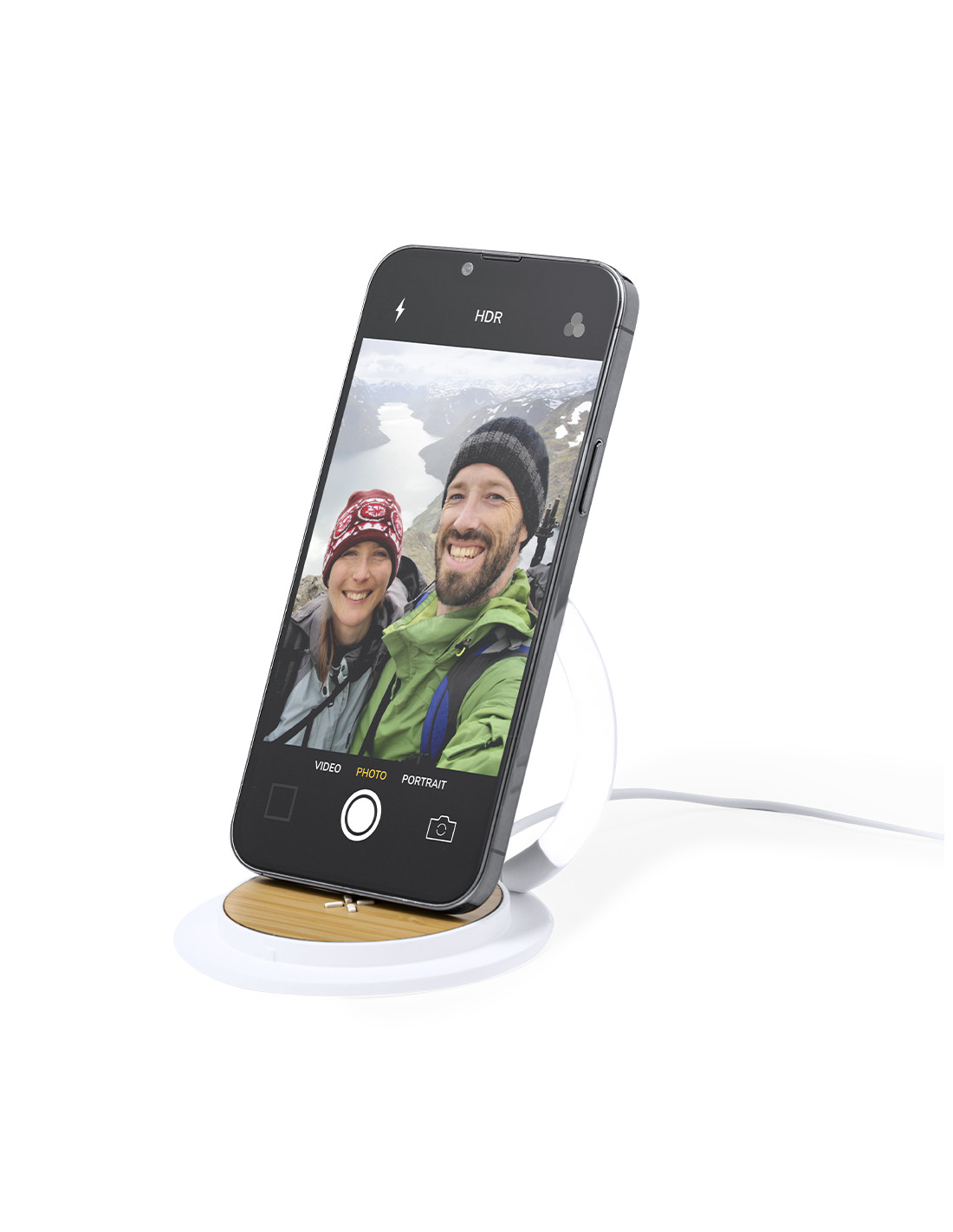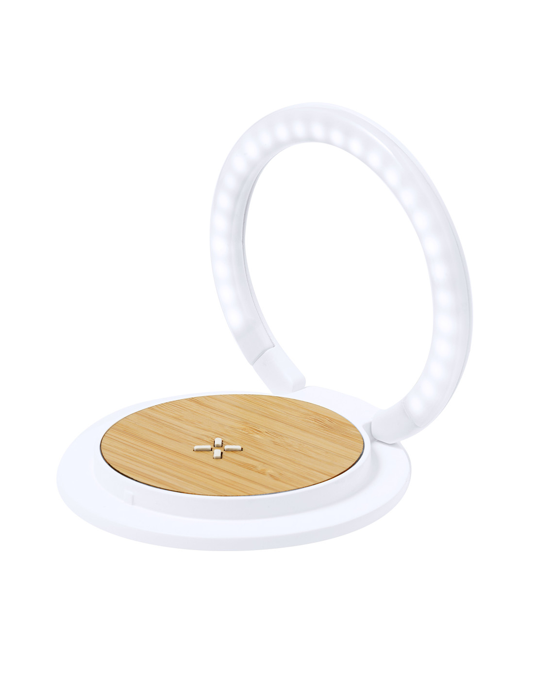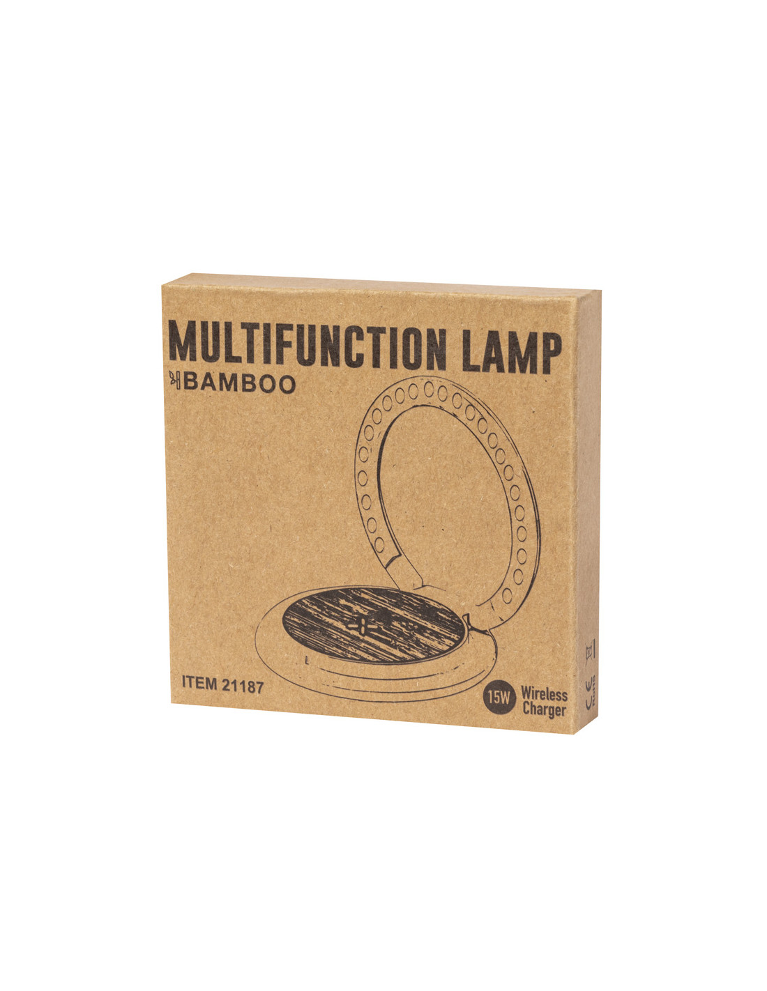 Lámpara multifunción fabricada en bambú. Con cargador inalámbrico de 15W integrado y 27 LEDs en un aro plegable que también hace de soporte. Compatible con dispositivos móviles de carga inalámbrica y con cable cargador Tipo C incluido, y presentada en una atractiva caja de diseño kraft. Disponible manual de instrucciones en español e inglés.Materiales como el bambú fomentan la utilización de materias primas naturales, reduciendo las emisiones contaminantes. Proviene de una planta de gran resistencia y versatilidad, con crecimiento y regeneración rápidos, siendo una excelente alternativa al uso de madera tradicional.Fabricada conforme a los estándares RoHS y en cumplimiento con los siguientes requisitos de seguridad:Sistema de protección contra sobrecalentamiento.Sistema de protección contra sobrecarga.Sistema de bloqueo para evitar cortocircuitos.